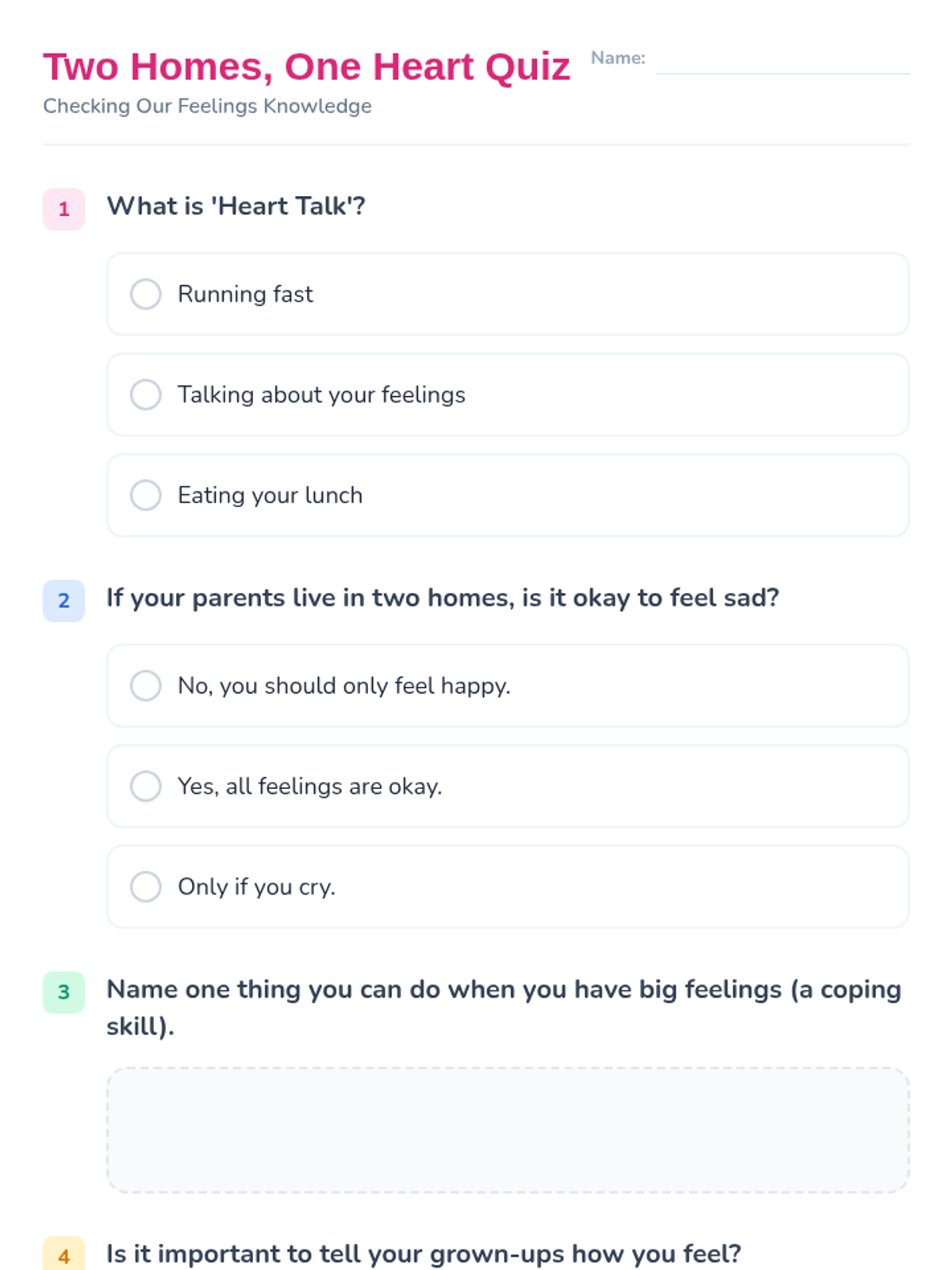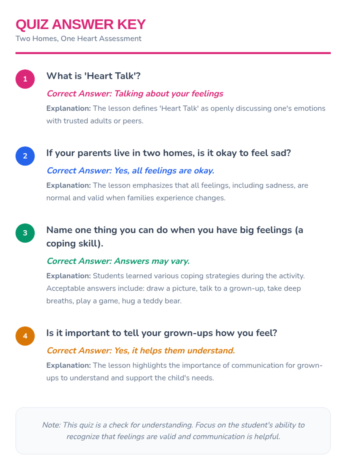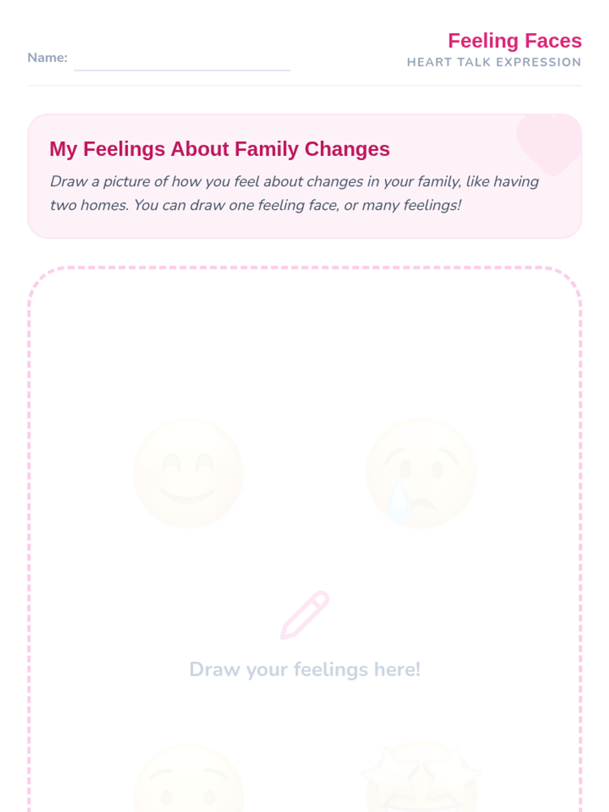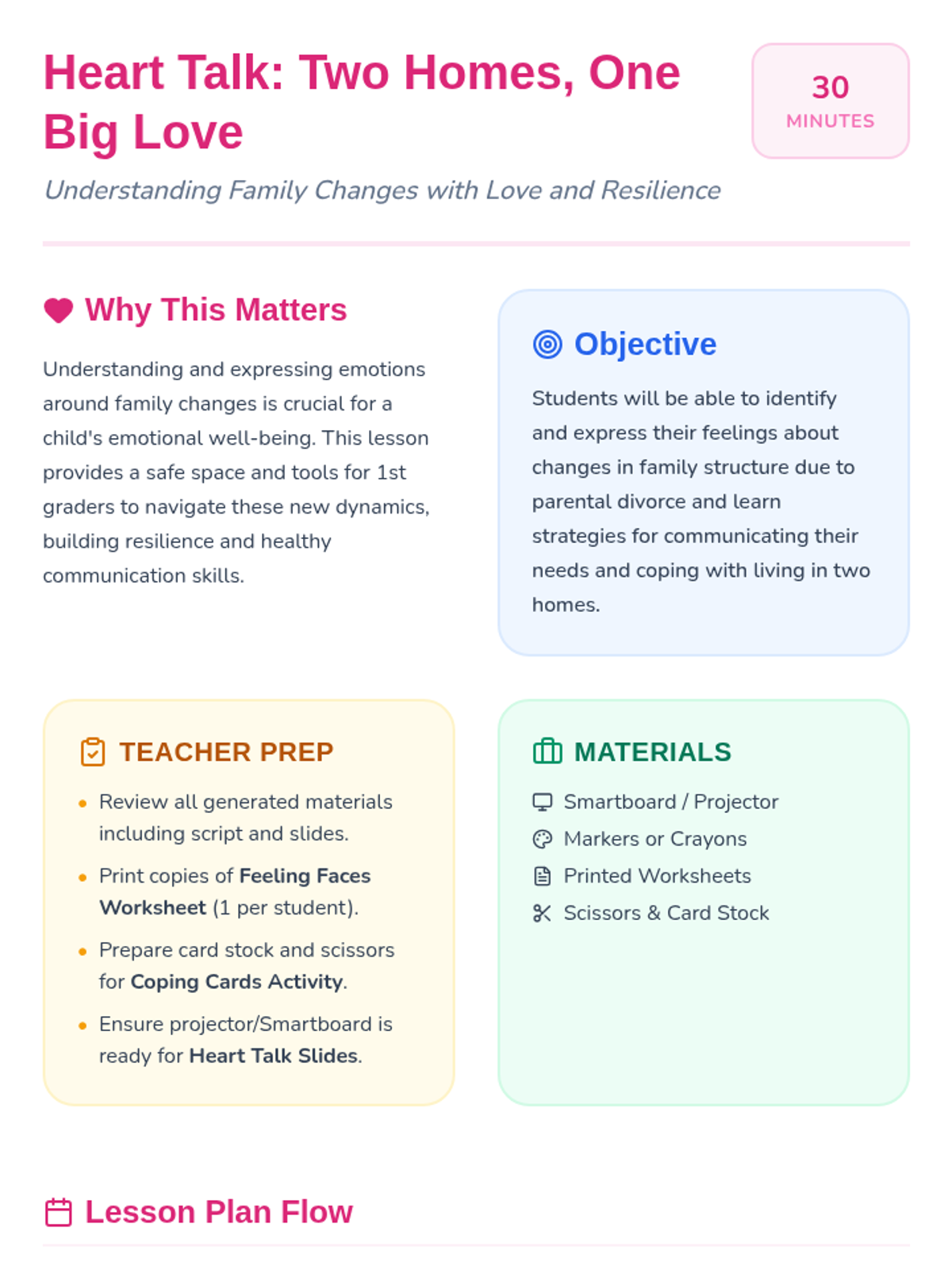 This 30-minute lesson for 1st graders helps students explore and express their thoughts and feelings about parental divorce and changes in family dynamics, introducing coping and communication strategies for navigating two homes.