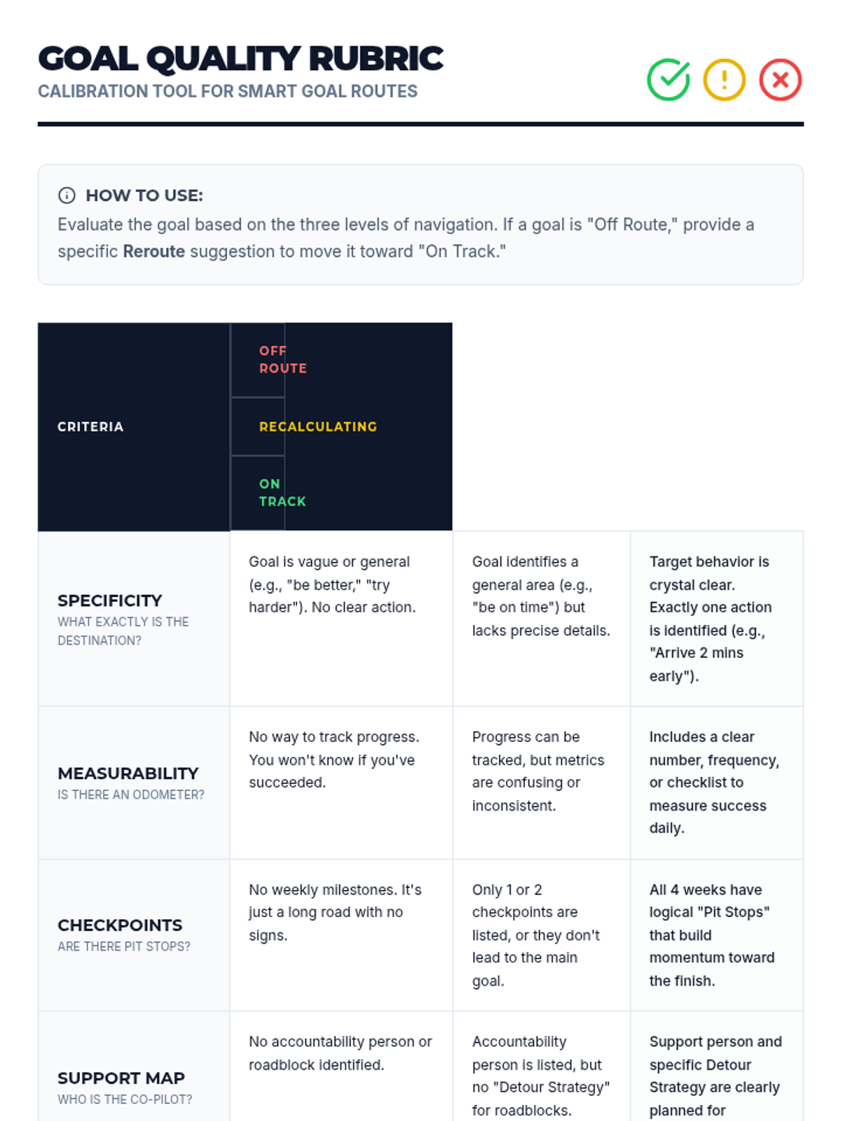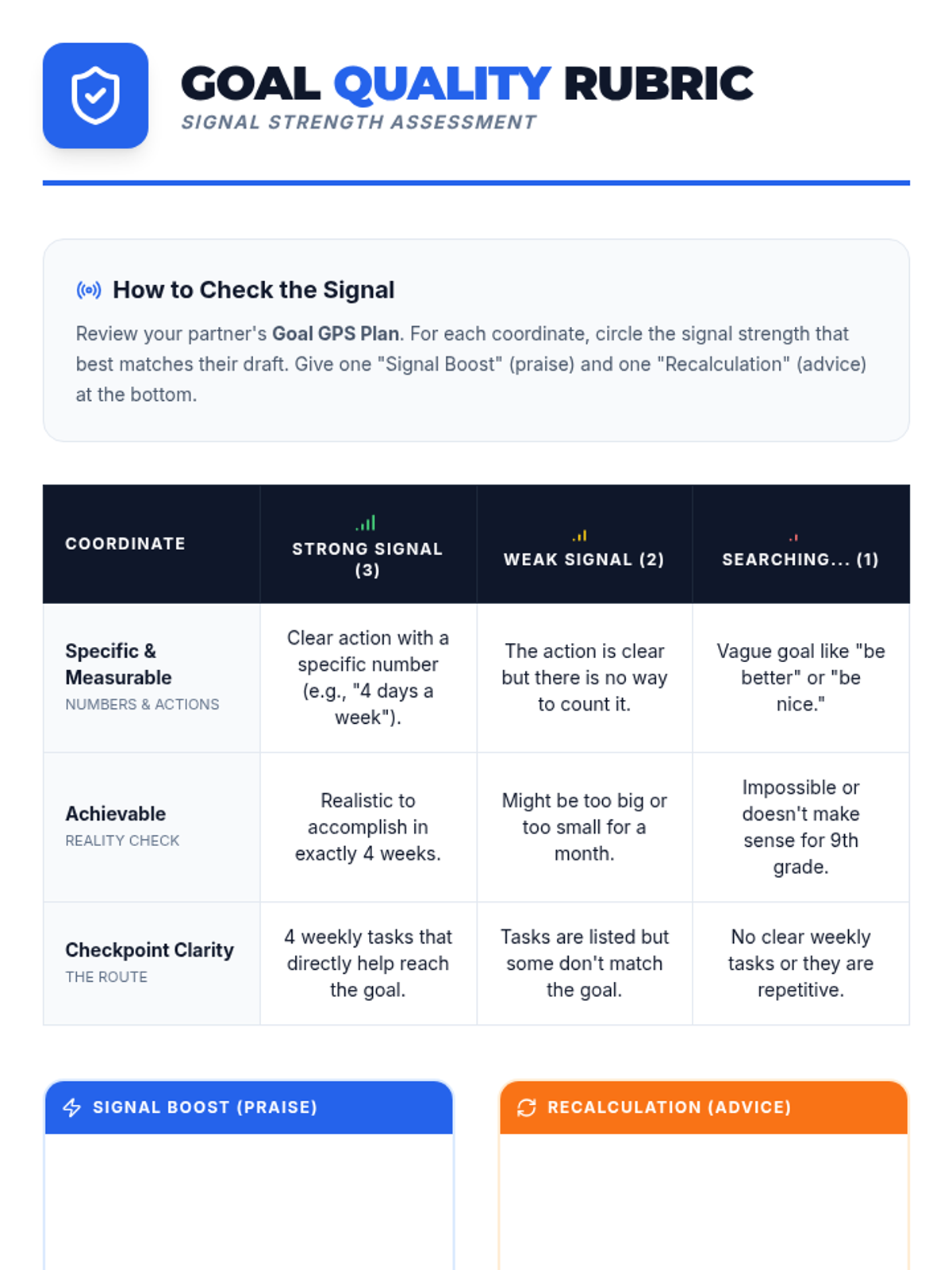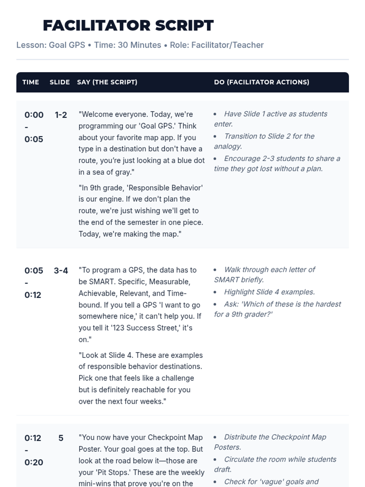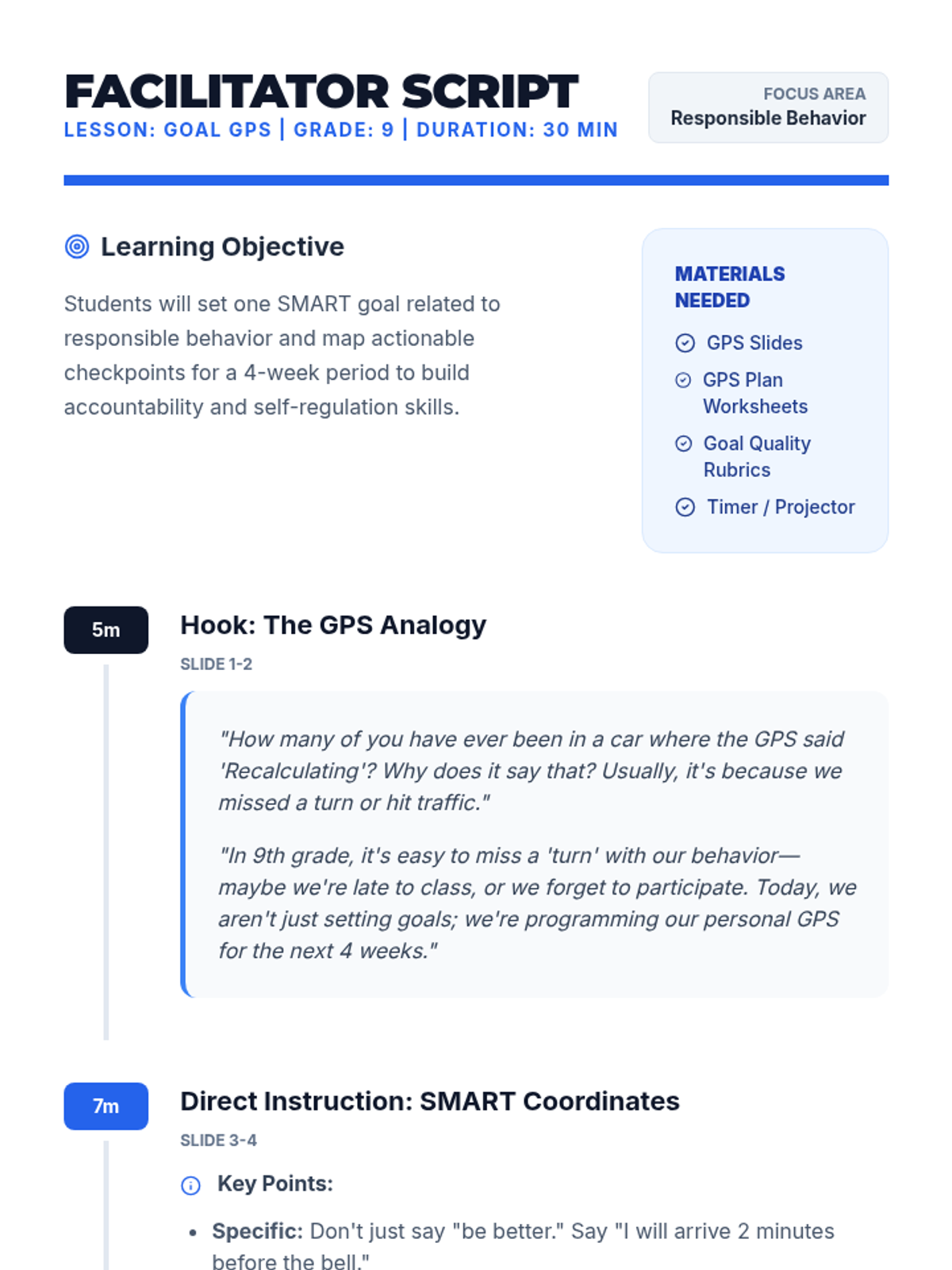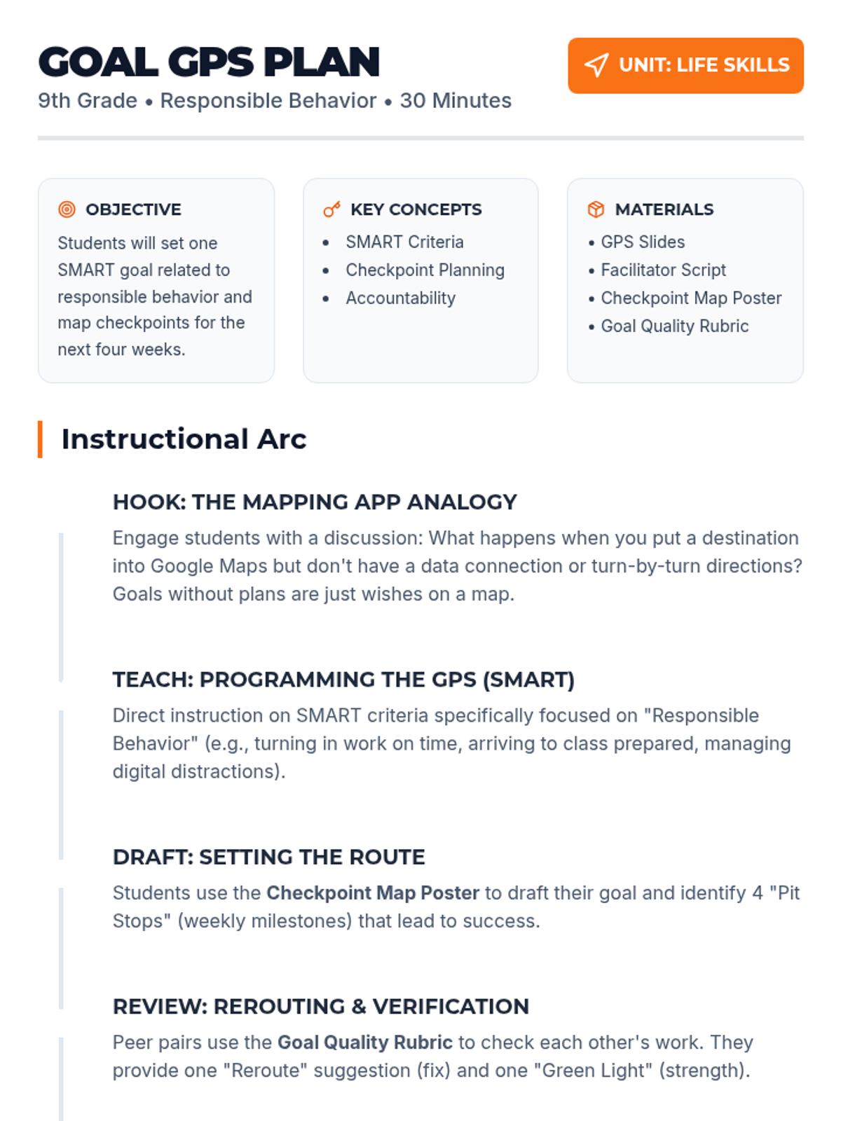 A 30-minute goal-setting workshop for 9th graders focusing on responsible behavior through the analogy of GPS navigation, including SMART goal drafting and 4-week checkpoint mapping.
