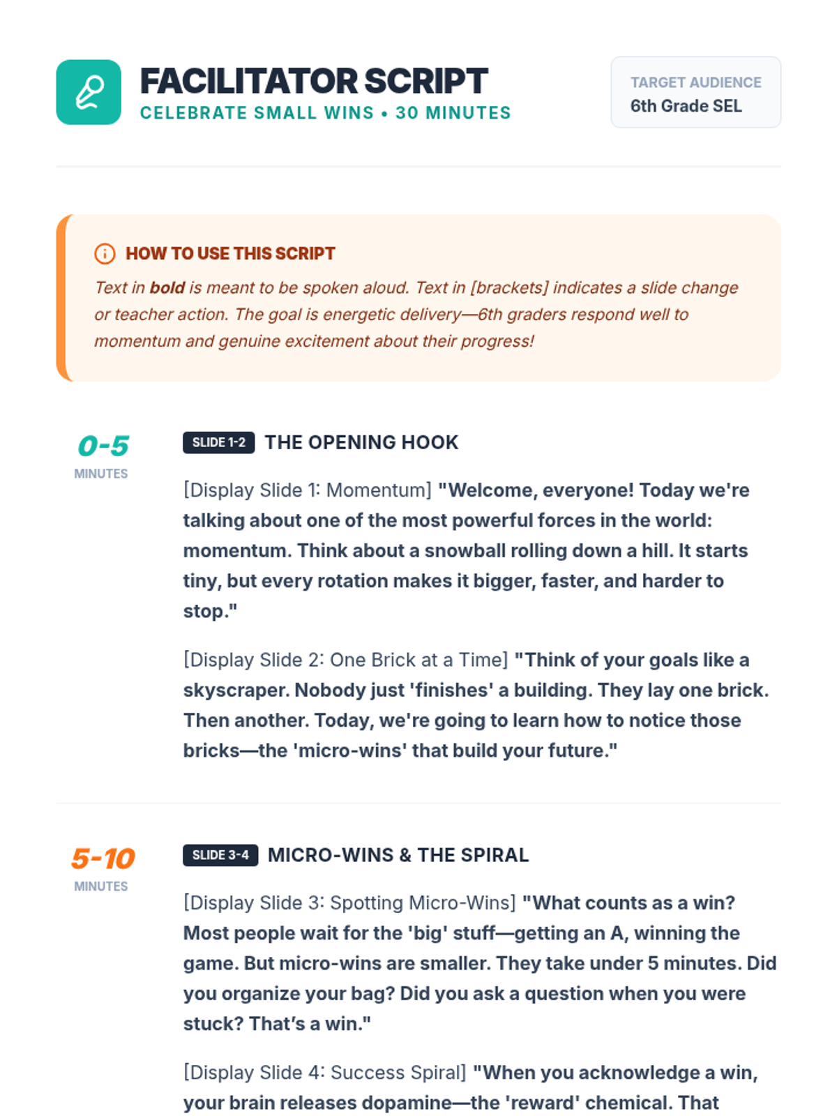 A 30-minute social-emotional learning lesson for 6th graders focused on identifying and celebrating micro-successes to build motivation and a growth mindset. Students learn to track 'small wins' as fuel for long-term goals.