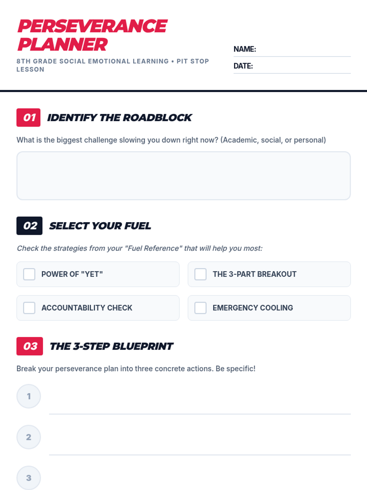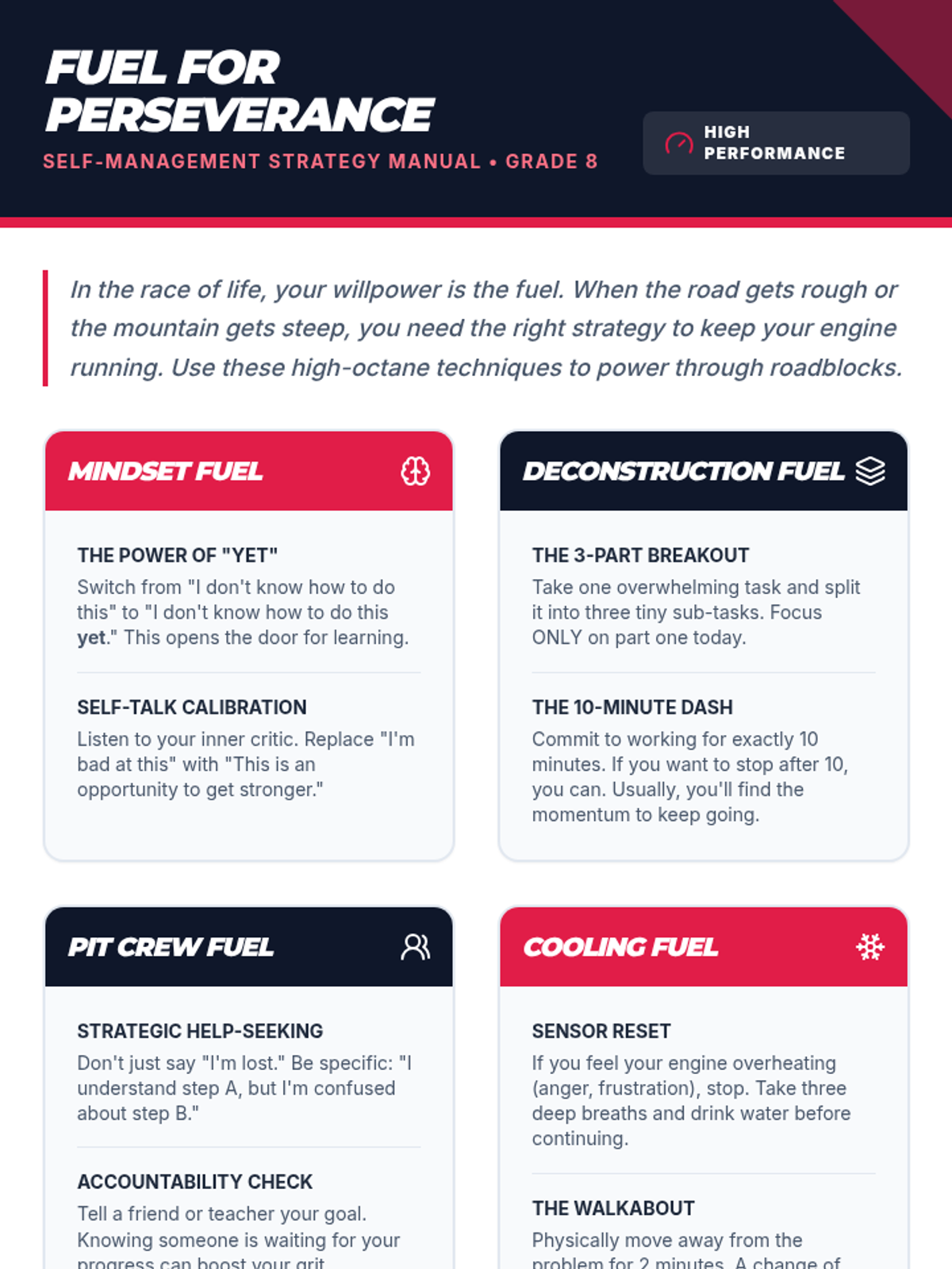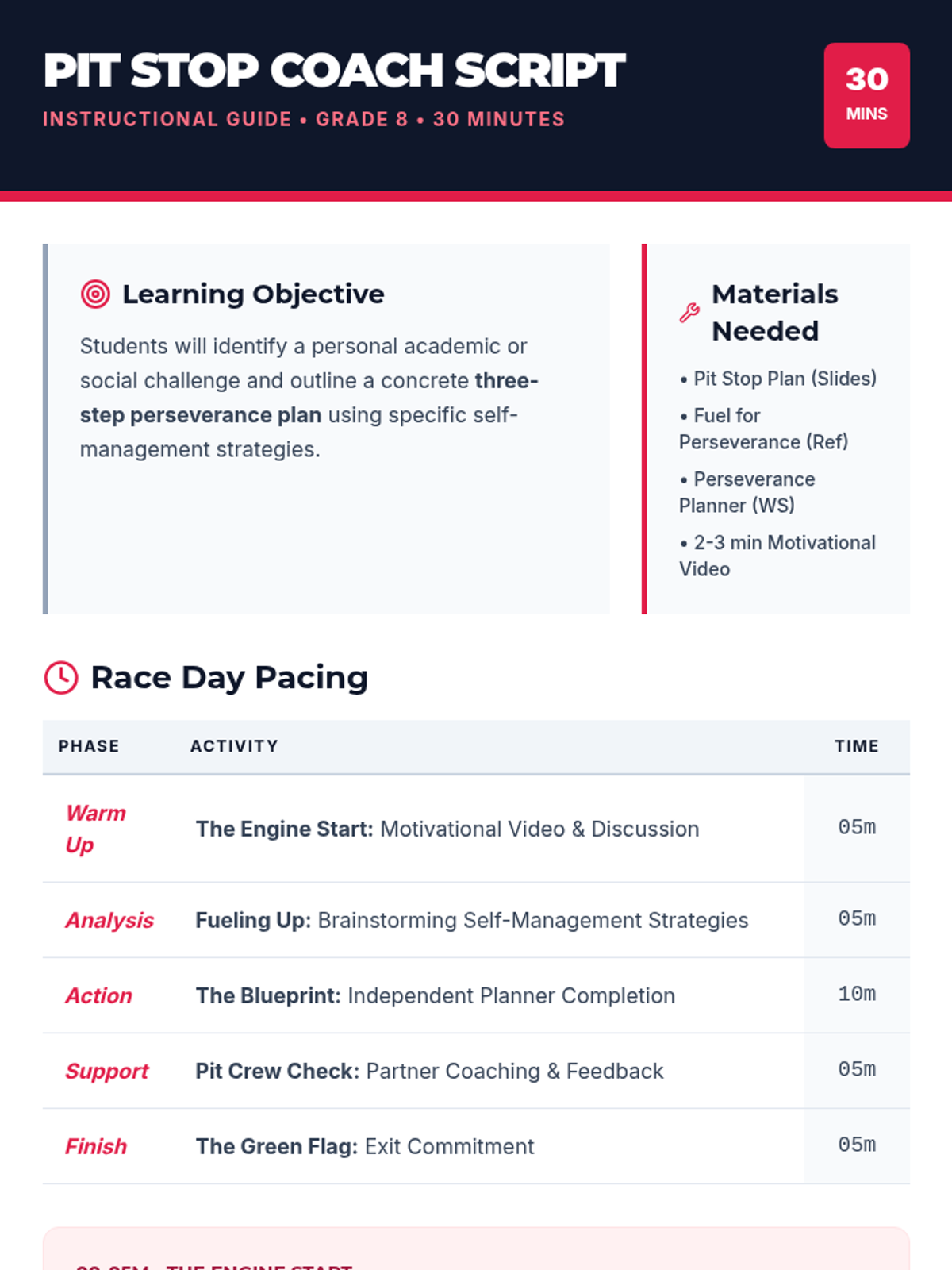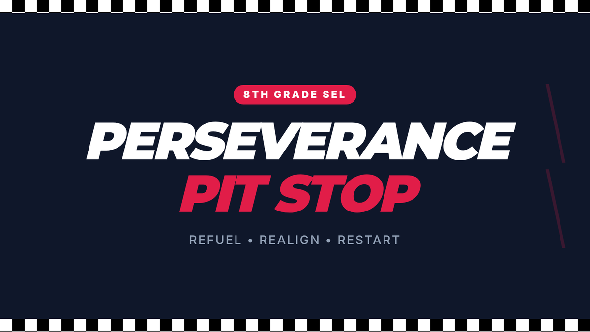 A high-energy, 30-minute social-emotional learning lesson where 8th graders use a 'Pit Stop' metaphor to analyze challenges and build actionable perseverance plans.