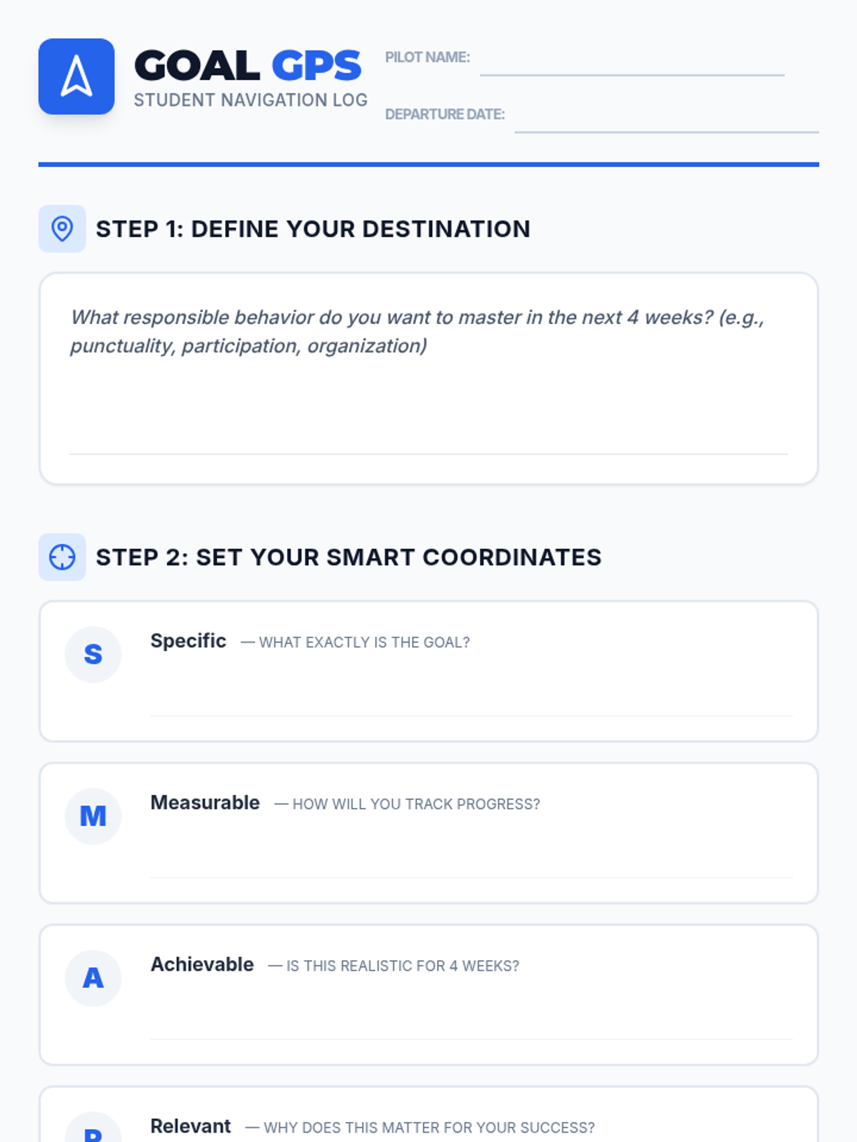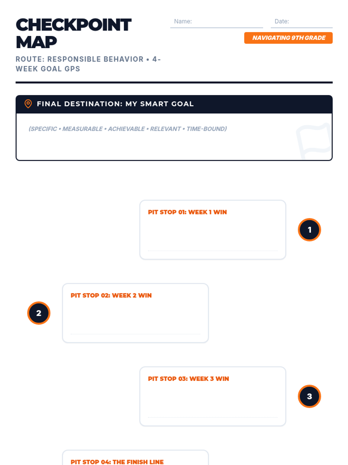A 30-minute goal-setting workshop where 9th graders use a navigation-themed framework to set SMART goals and map out a four-week accountability plan for responsible behavior.
