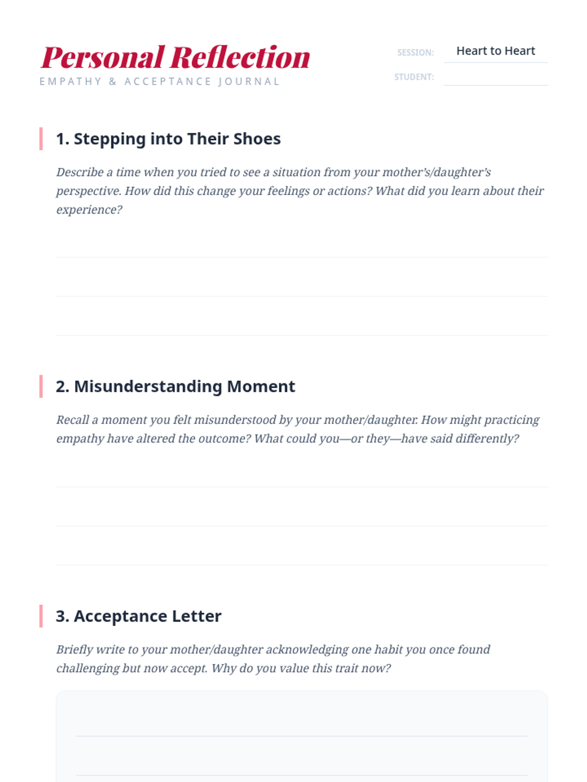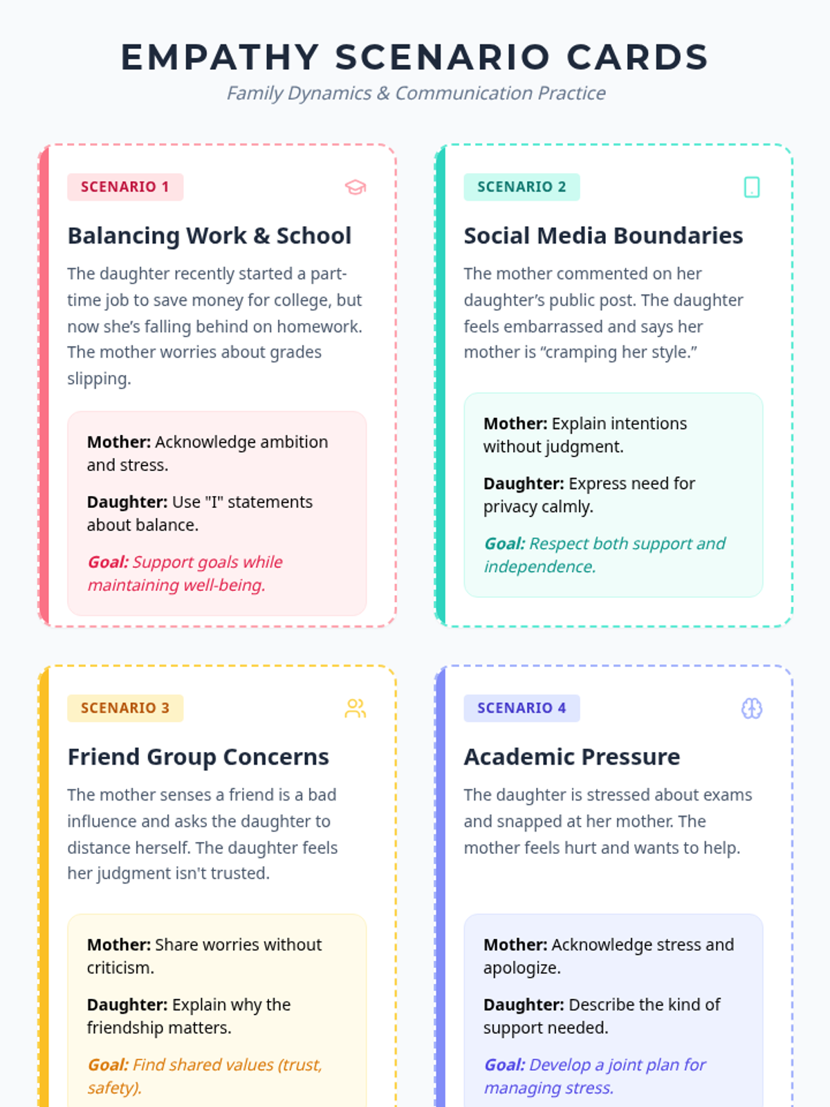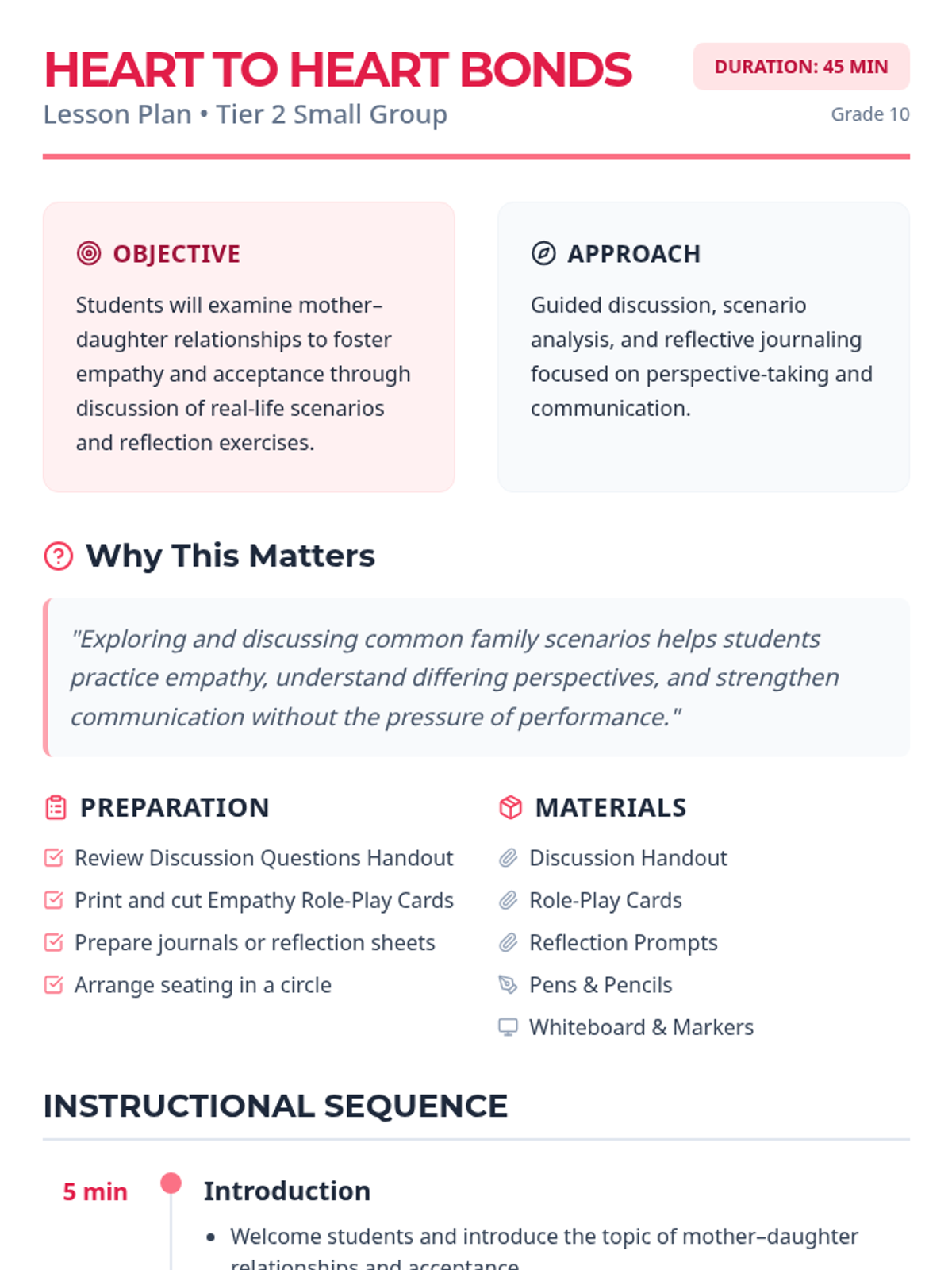 A 45-minute Tier 2 small-group session for 10th graders exploring mother-daughter relationships, empathy, and acceptance through guided discussion and role-play.
