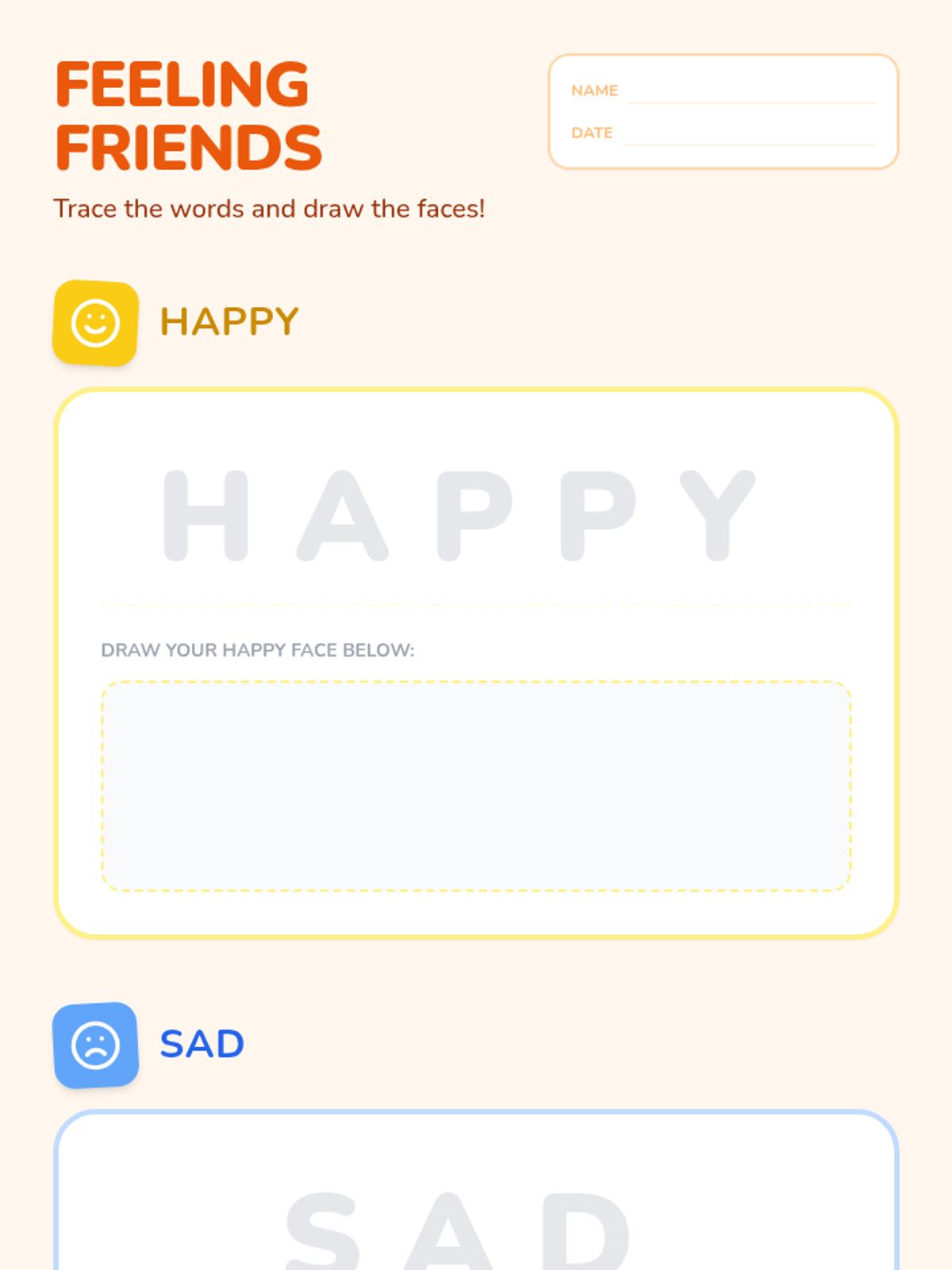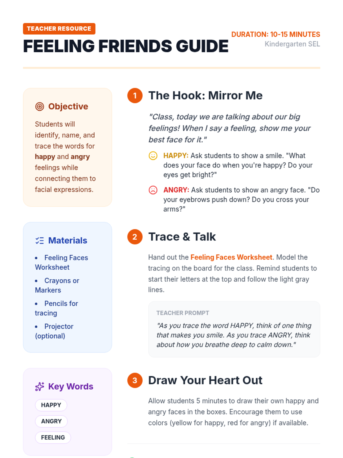 An engaging lesson for kindergarteners to identify, name, and trace the words for 'happy', 'sad', 'angry', 'scared', 'excited', and 'tired' feelings.