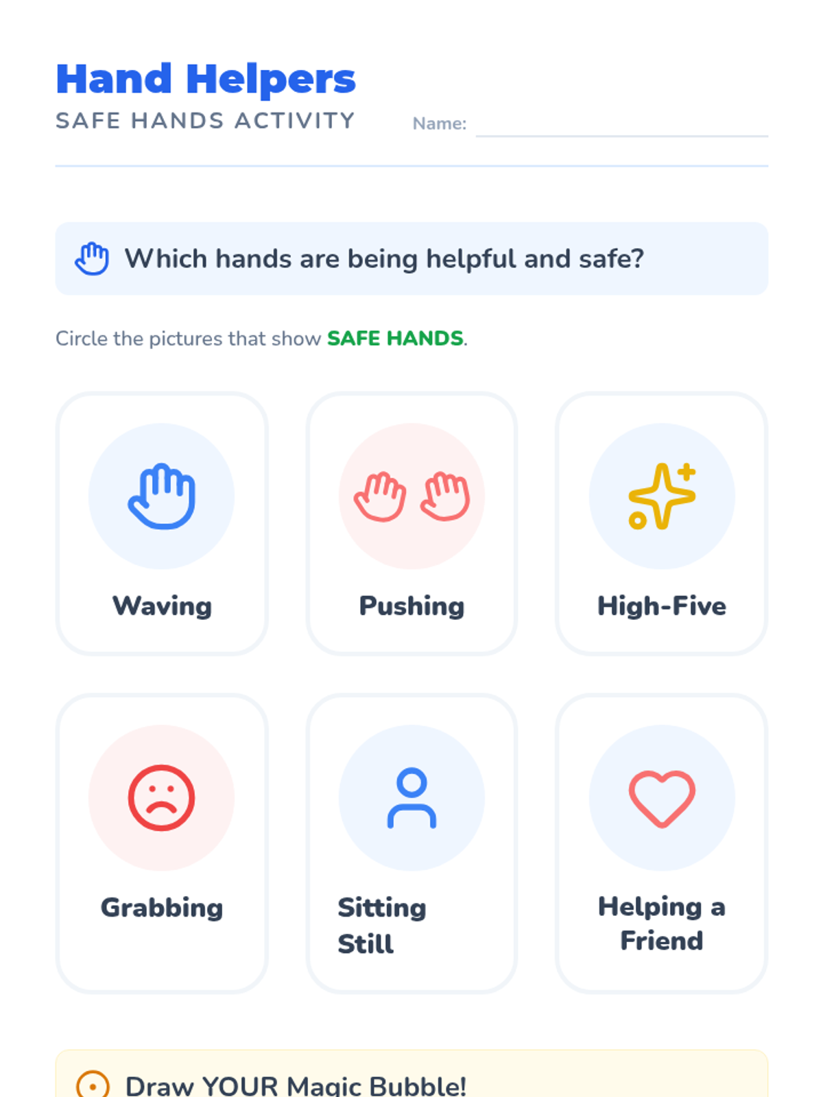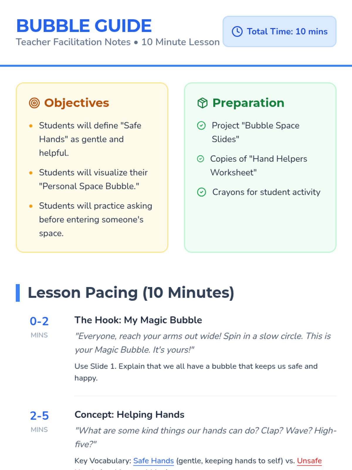A brief, engaging 10-minute lesson for Pre-K students focused on defining 'safe hands' and understanding the 'personal space bubble' through simple visuals and guided practice.