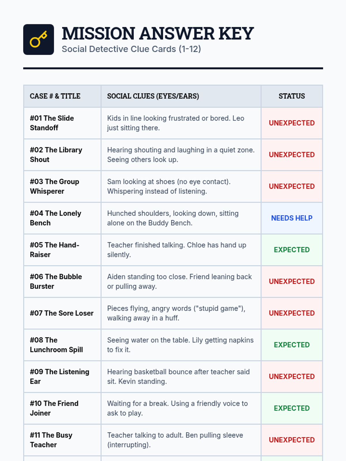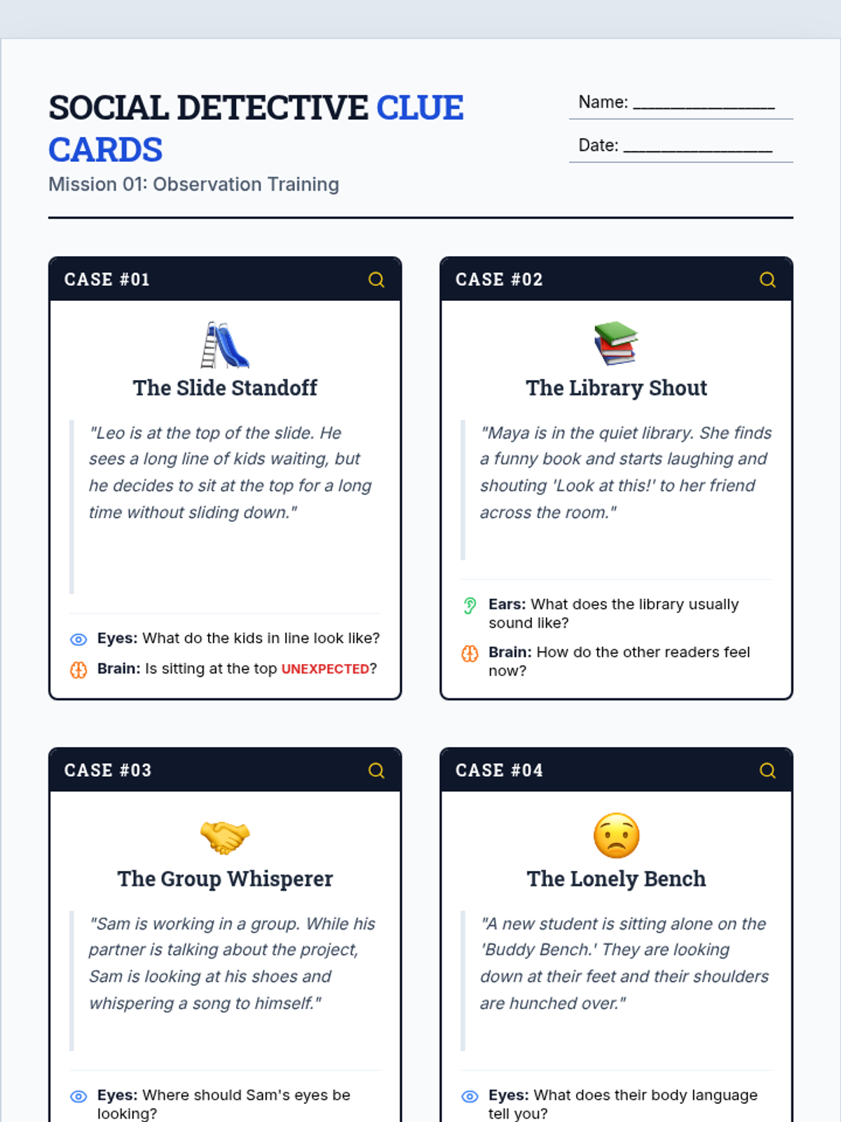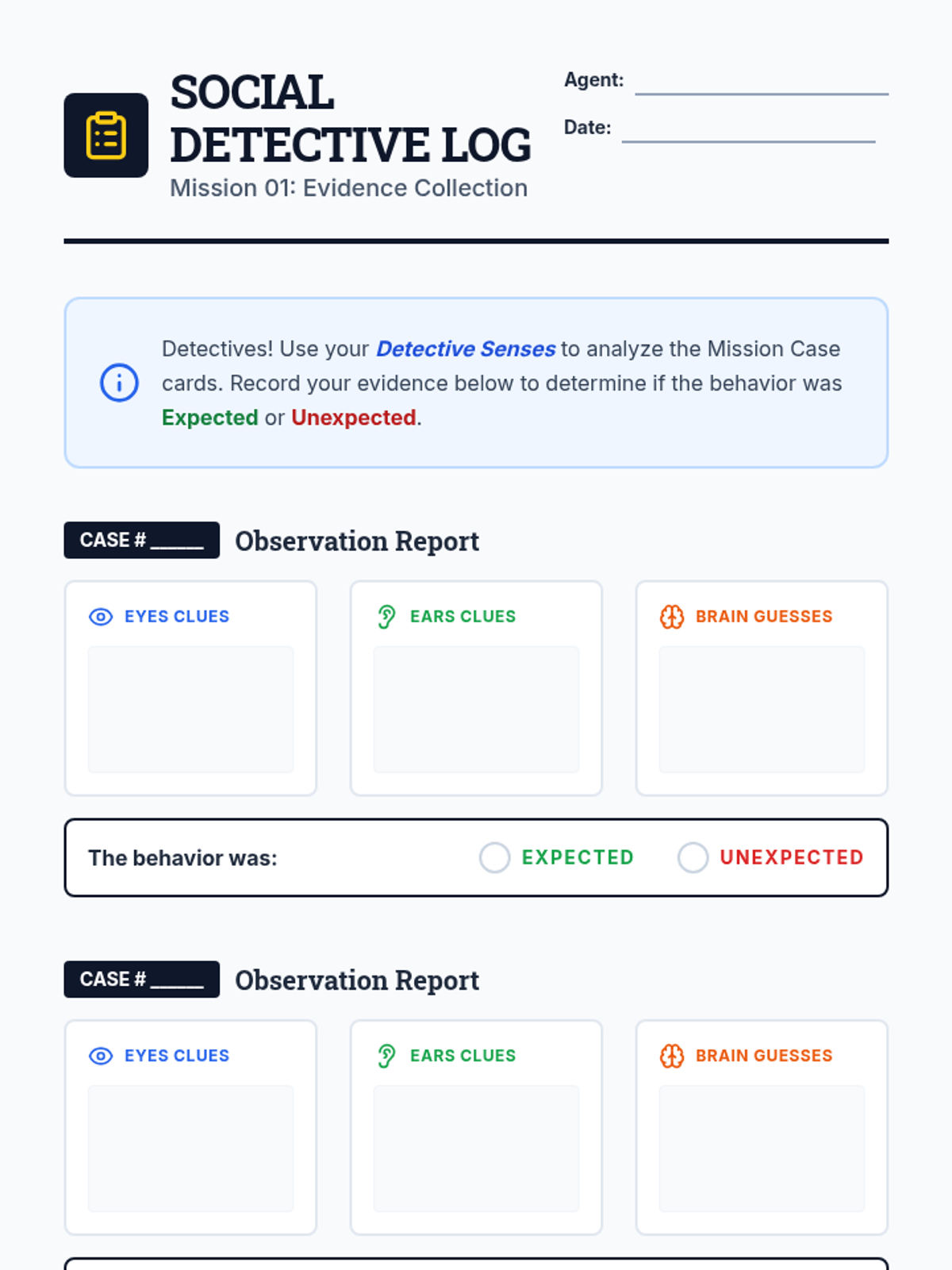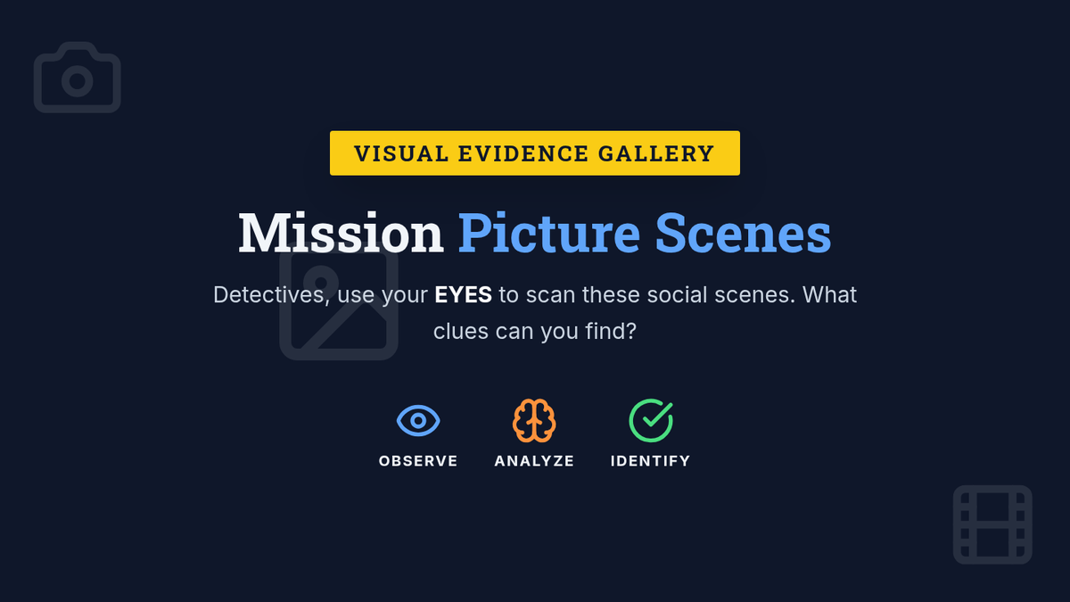 In this mission, students learn the fundamentals of social observation by becoming 'Social Detectives.' They will learn to use their 'Detective Senses' (Eyes, Ears, and Brain) to gather social clues and distinguish between expected and unexpected behaviors in various scenarios.