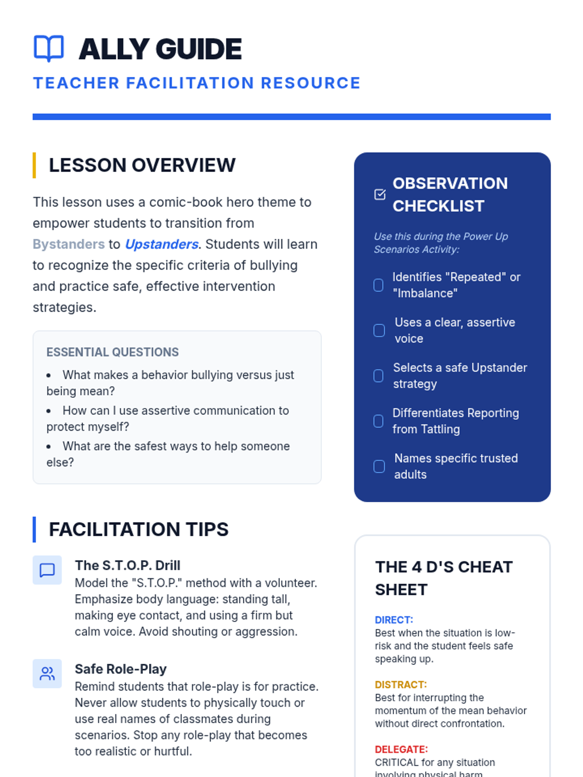 A comprehensive lesson for 4th graders on identifying bullying, practicing assertive communication, and learning safe bystander intervention strategies using a comic-book hero theme.