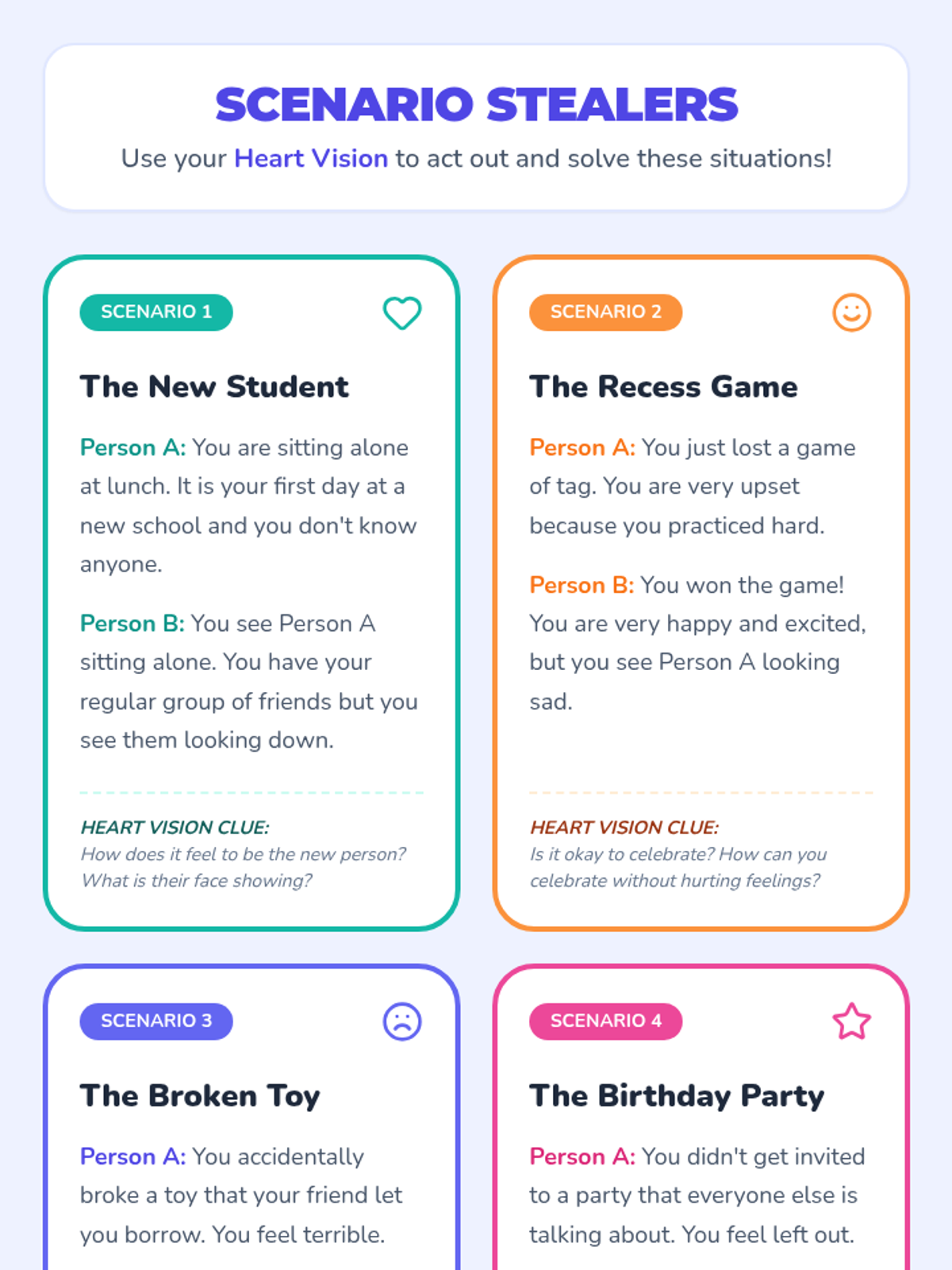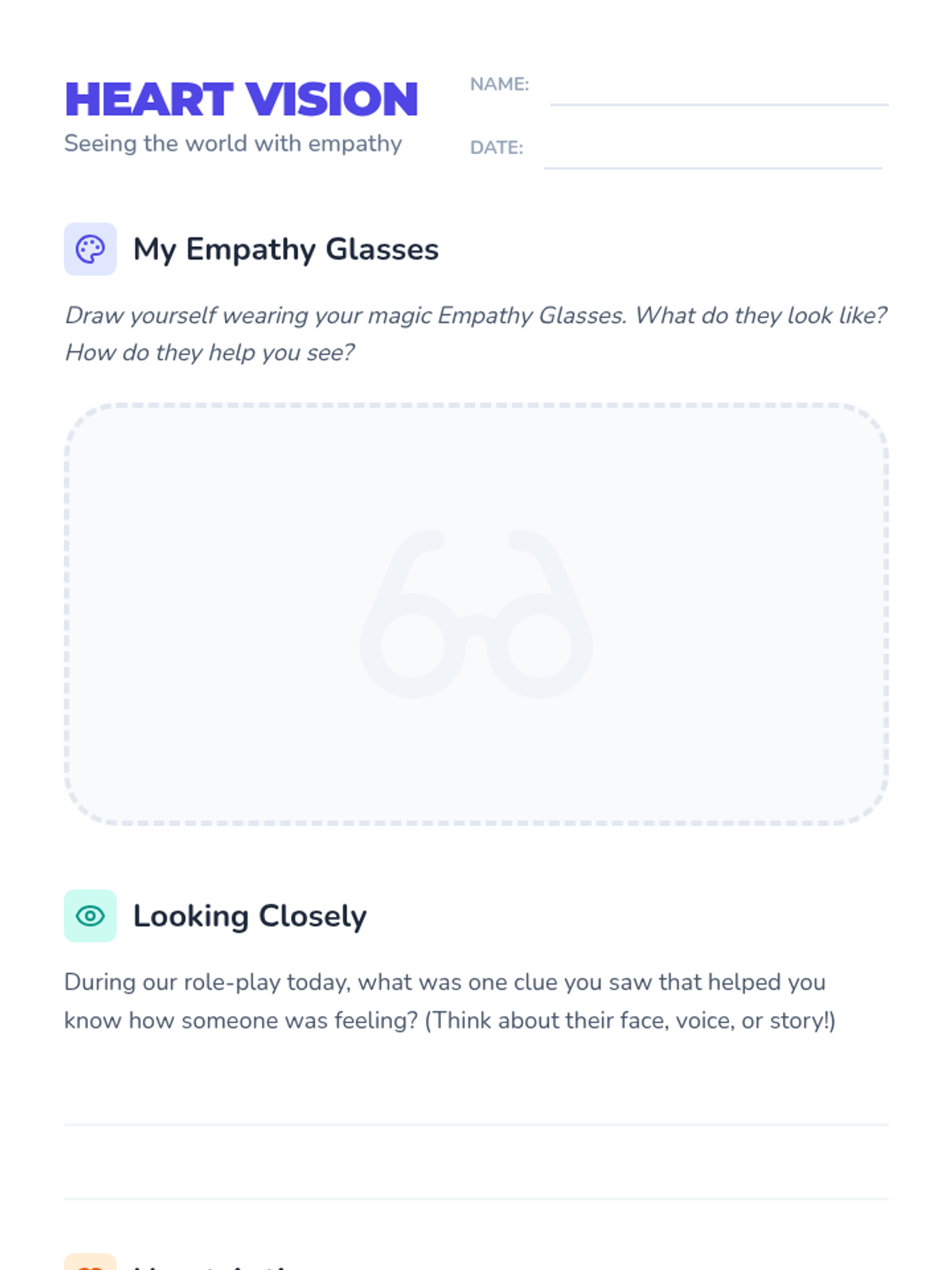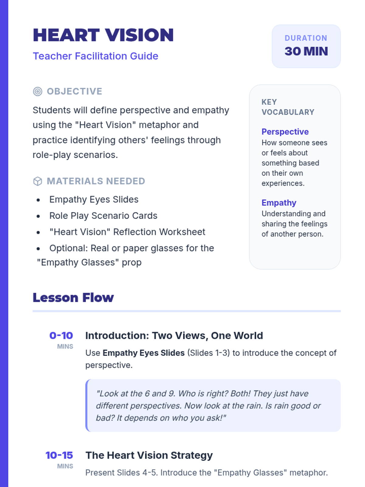 A 30-minute social-emotional learning lesson for second graders focused on understanding perspective-taking and developing empathy through role-playing and visual metaphors. Students will learn to 'put on empathy glasses' to see how others might feel in different situations.