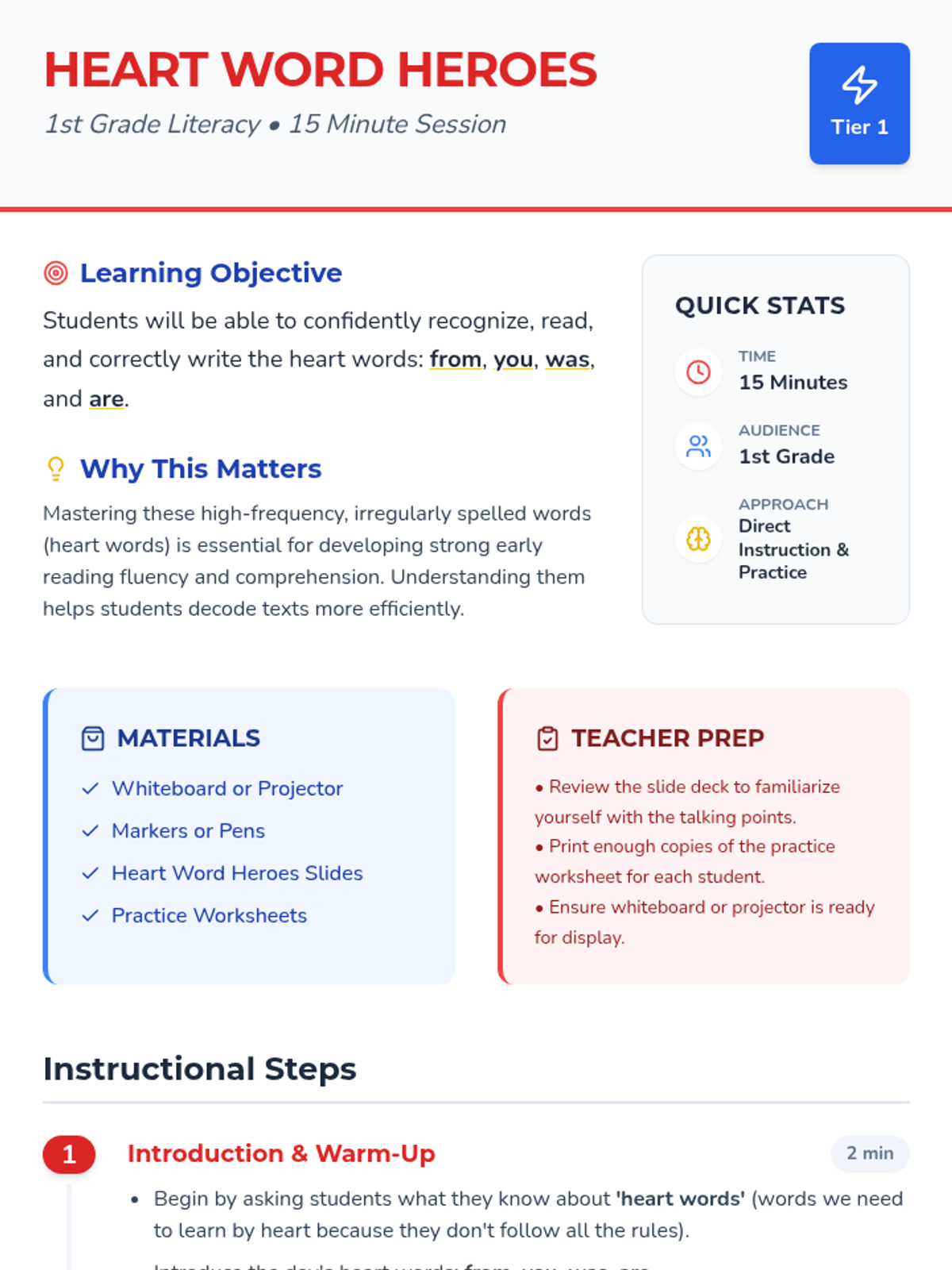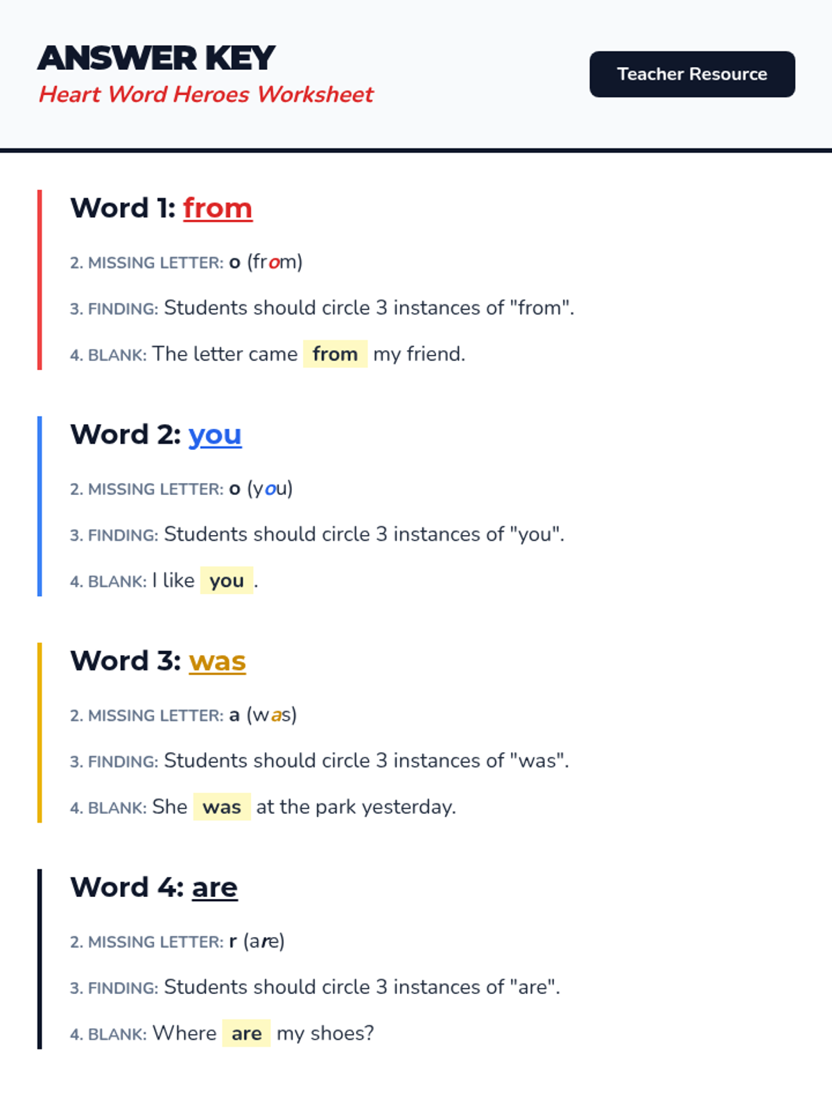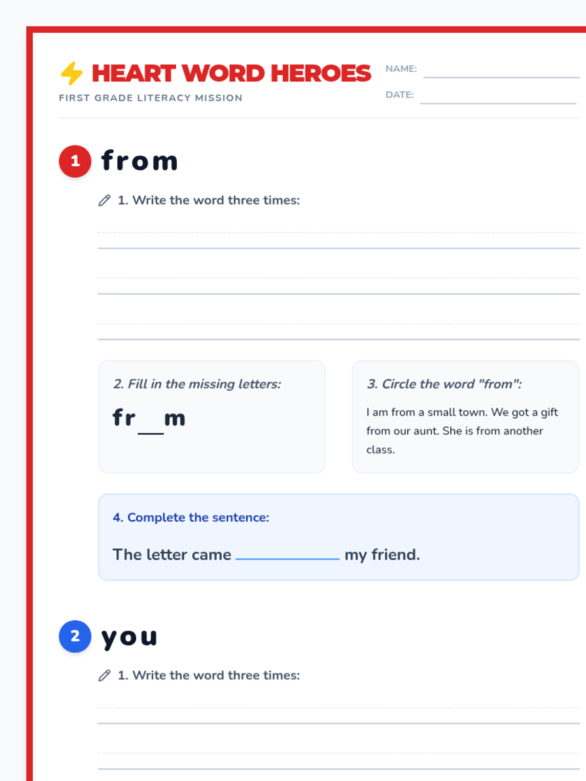 A 15-minute 1st-grade lesson for mastering common heart words 'from,' 'you,' 'was,' and 'are' using multisensory practice and superhero-themed materials.