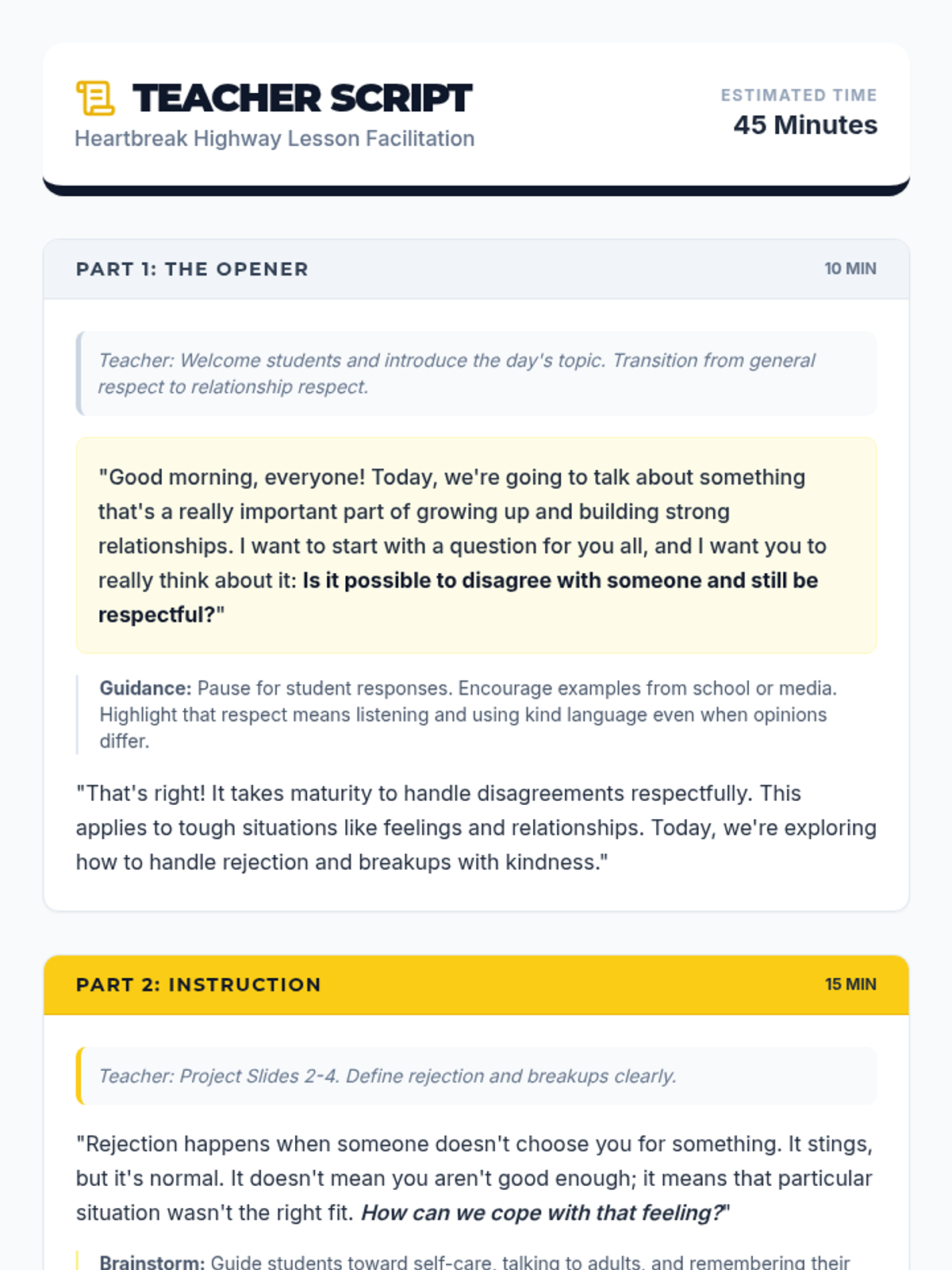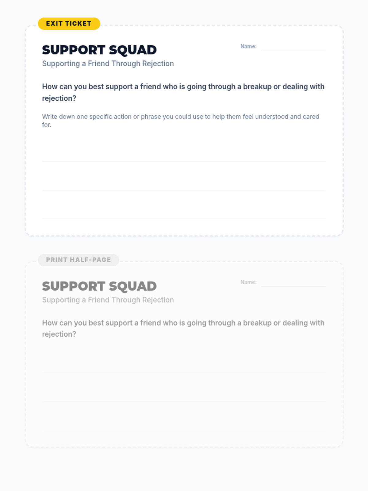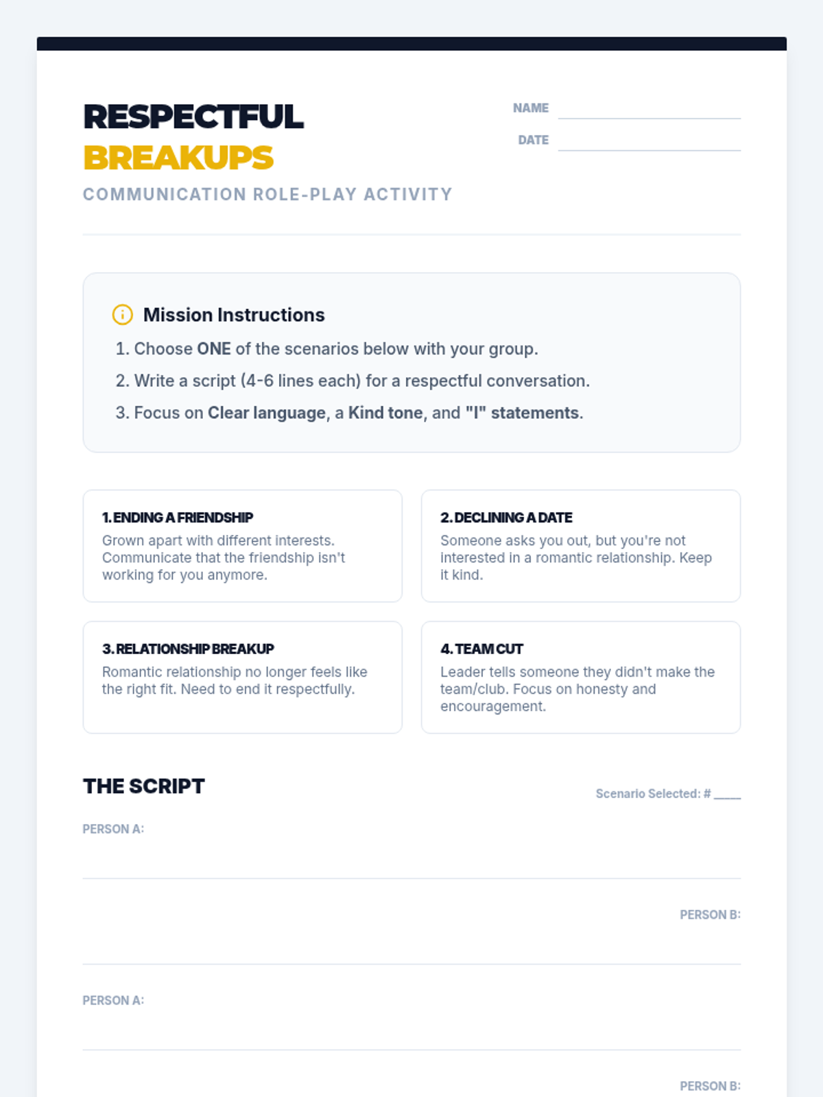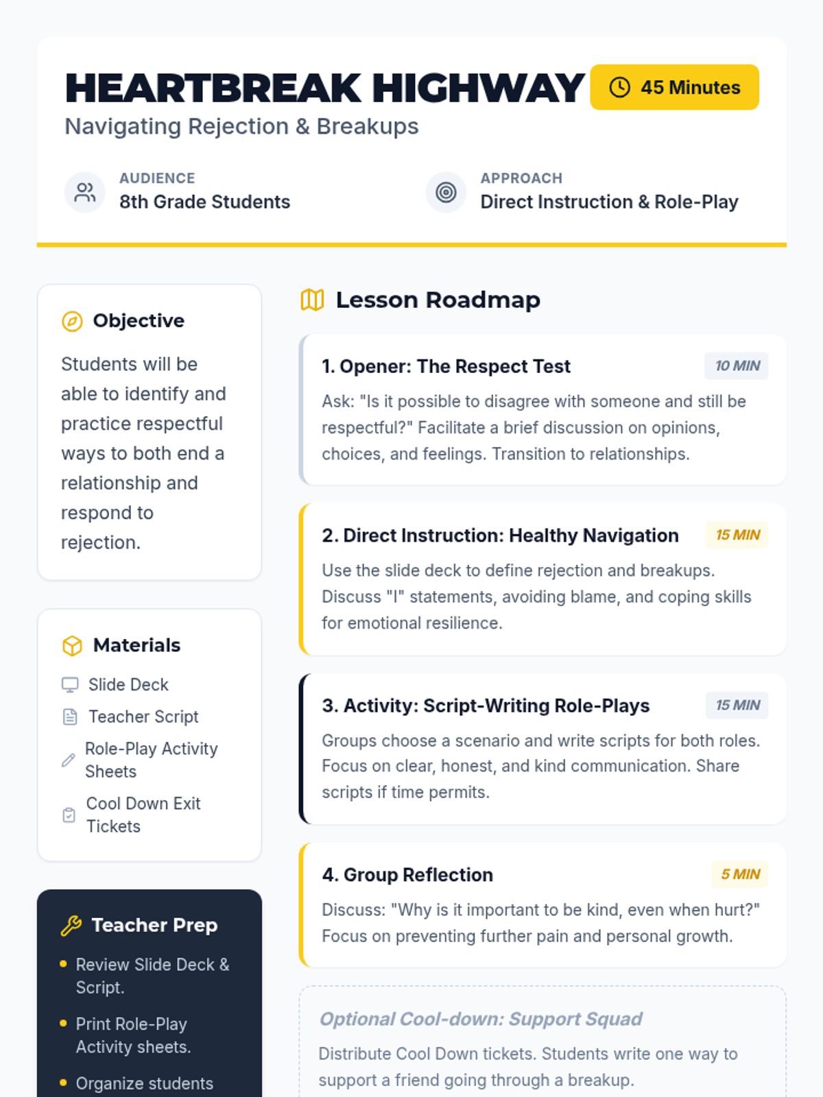 A single-session lesson for 8th-grade students focused on navigating rejection and breakups with respect and empathy. Through direct instruction and role-playing, students practice healthy communication strategies and coping skills.