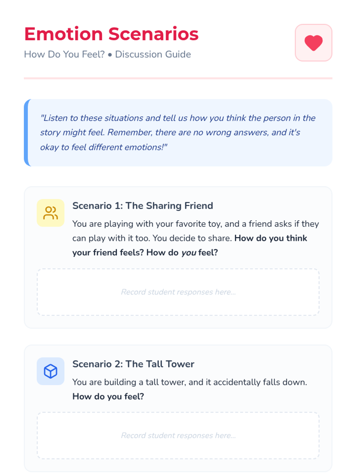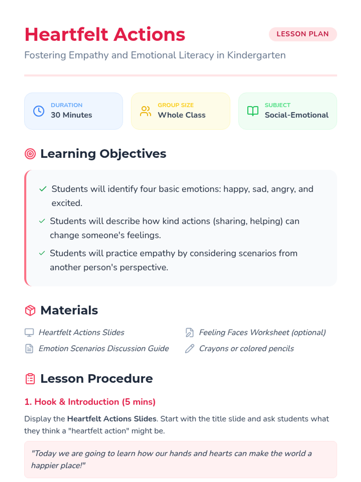A 30-minute Kindergarten lesson focused on identifying emotions in self and others, and understanding how actions impact feelings to foster empathy.