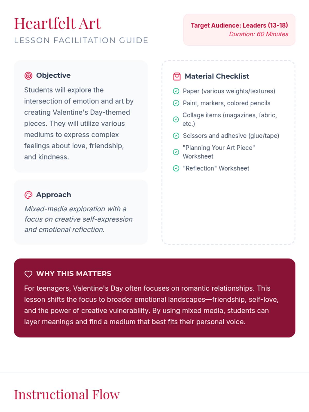 Students will create Valentine's Day-themed art pieces using various mediums, focusing on expressing emotions and reflecting on love and friendship.