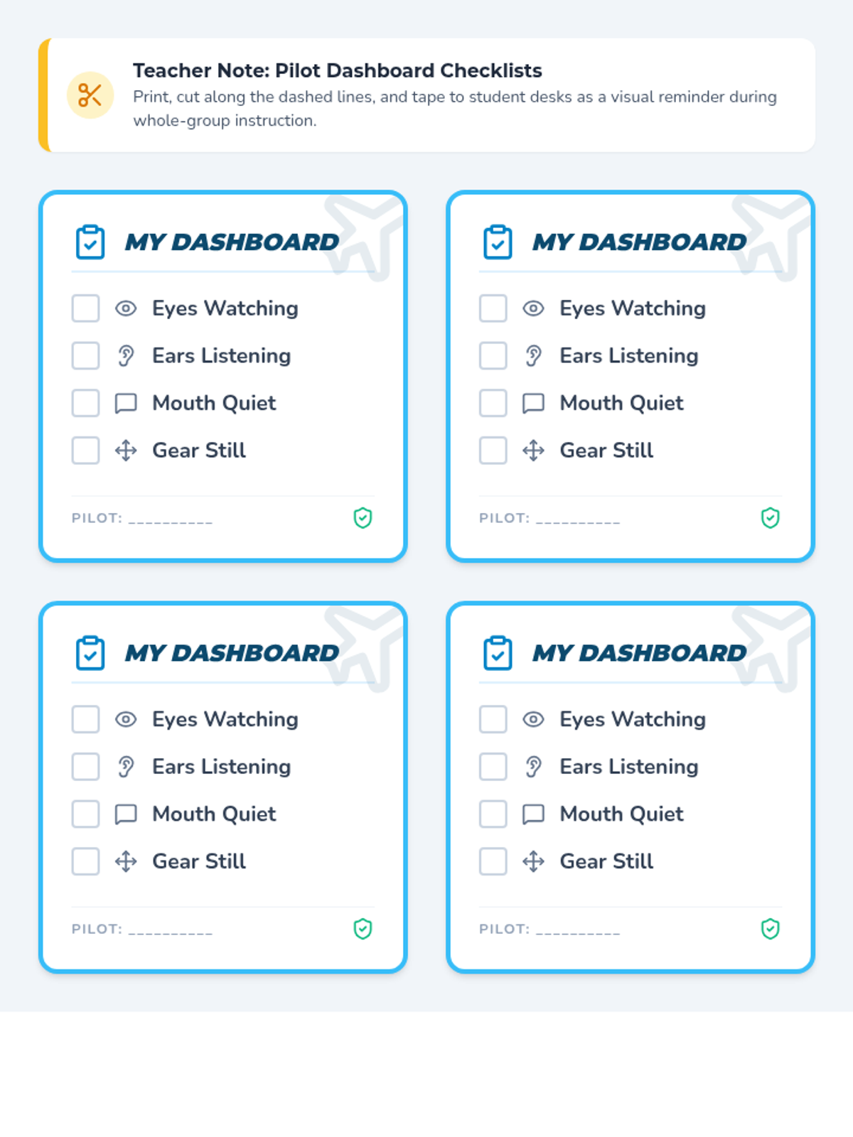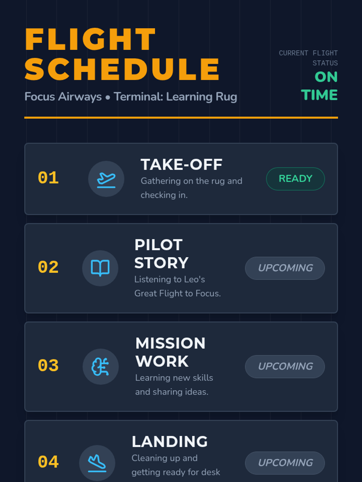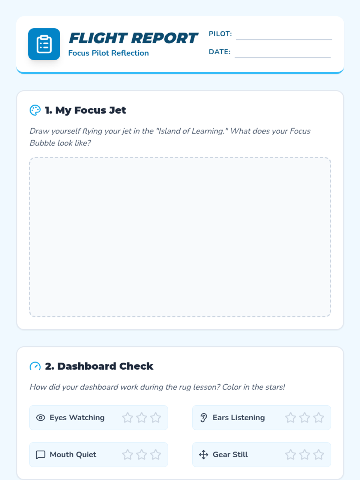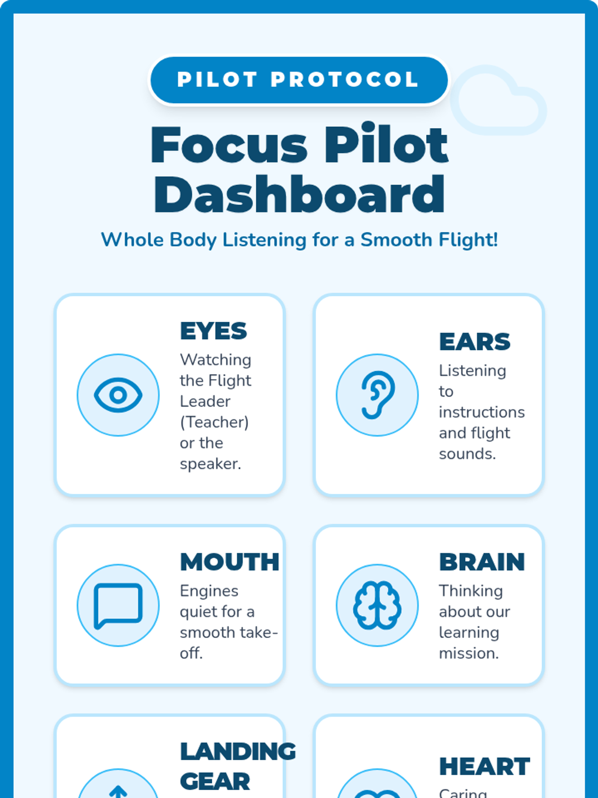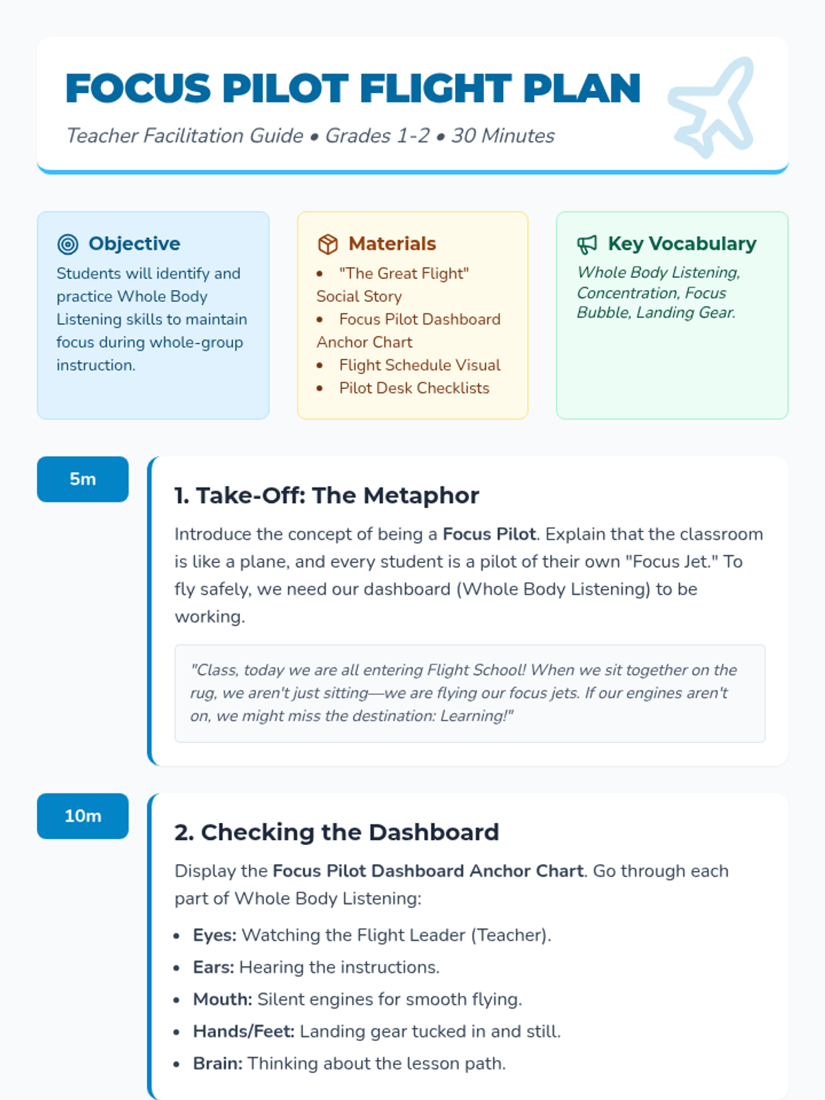 A 30-minute lesson introducing Grade 1 and 2 students to self-regulation during whole-group instruction through the 'Focus Pilot' metaphor, covering whole body listening and concentration skills.