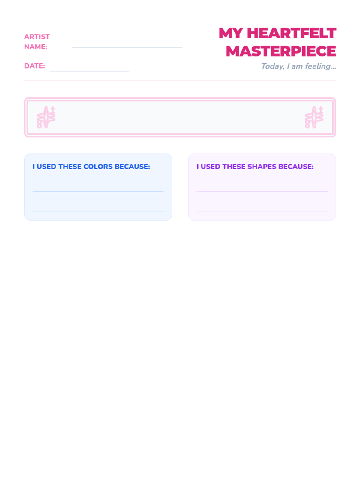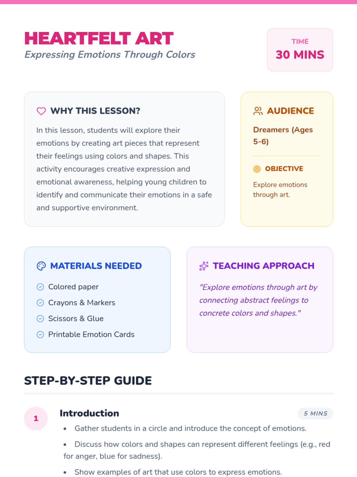 A creative art lesson for 5-6 year olds to explore and communicate their emotions through the use of colors, shapes, and textures. Students identify feelings and create a personal masterpiece that reflects their inner world.