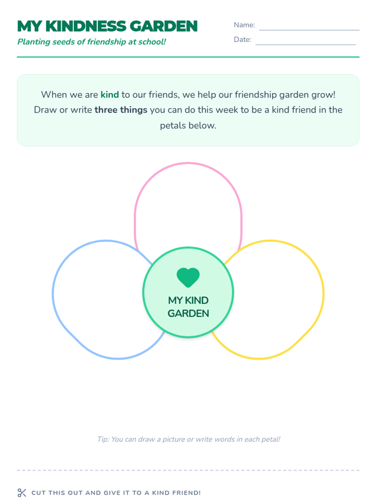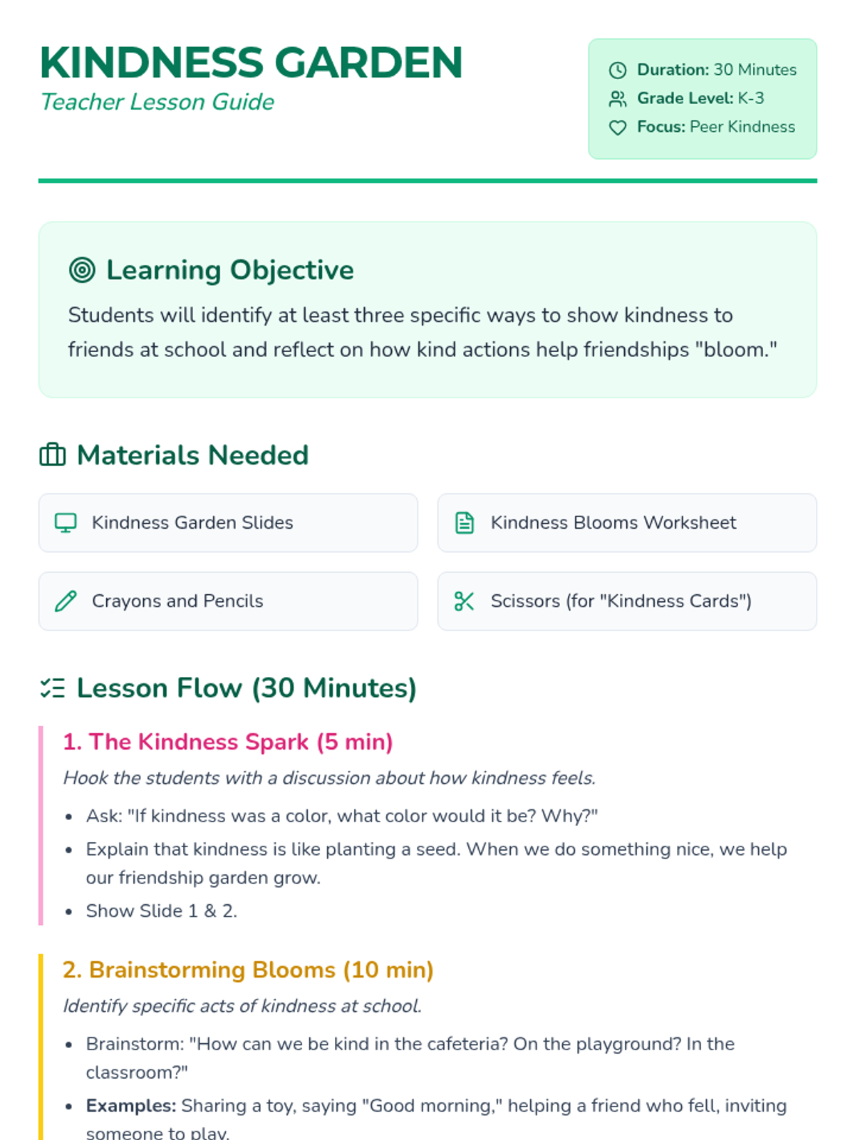 A 30-minute SEL lesson focused on teaching students practical ways to show kindness to their peers at school through a 'Kindness Garden' theme.