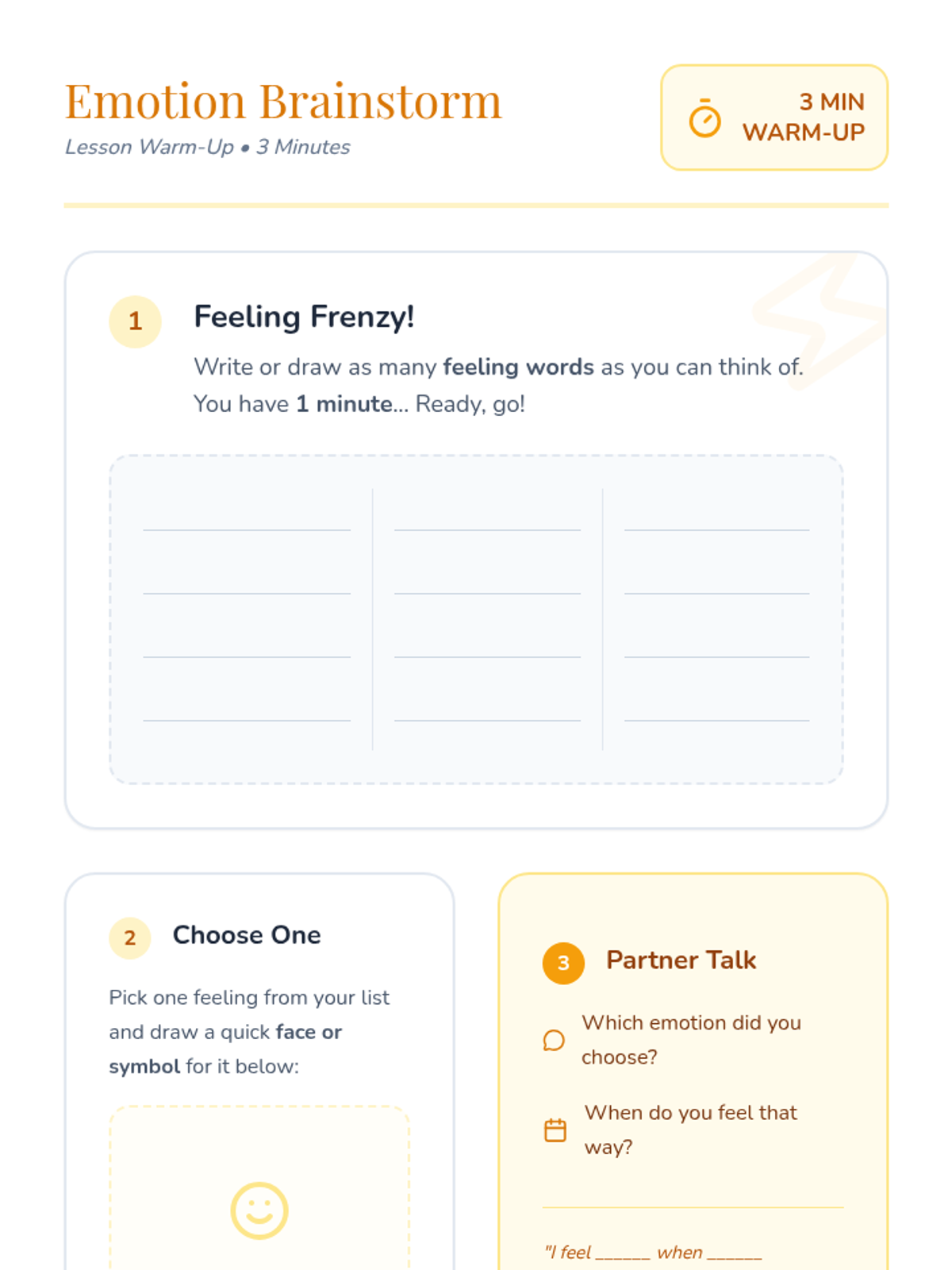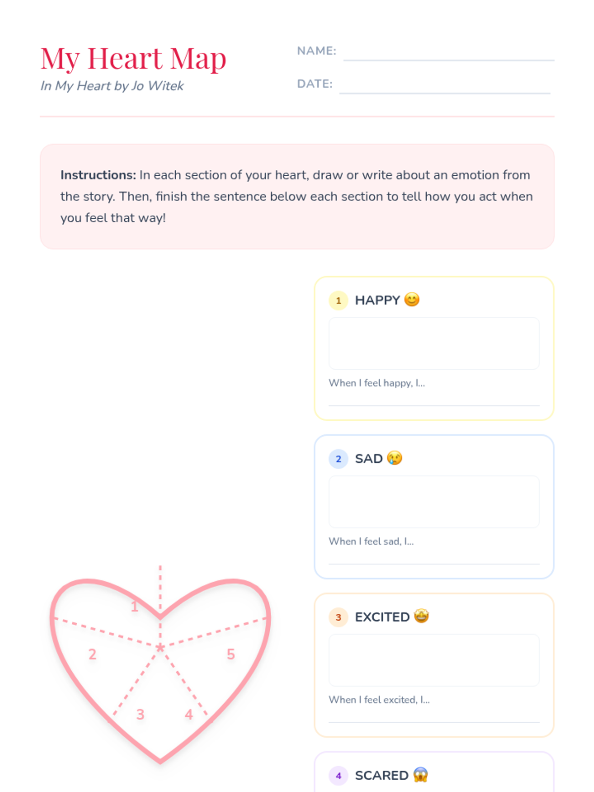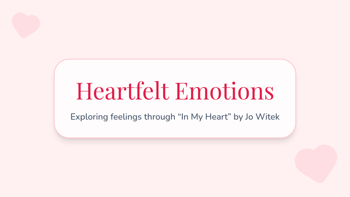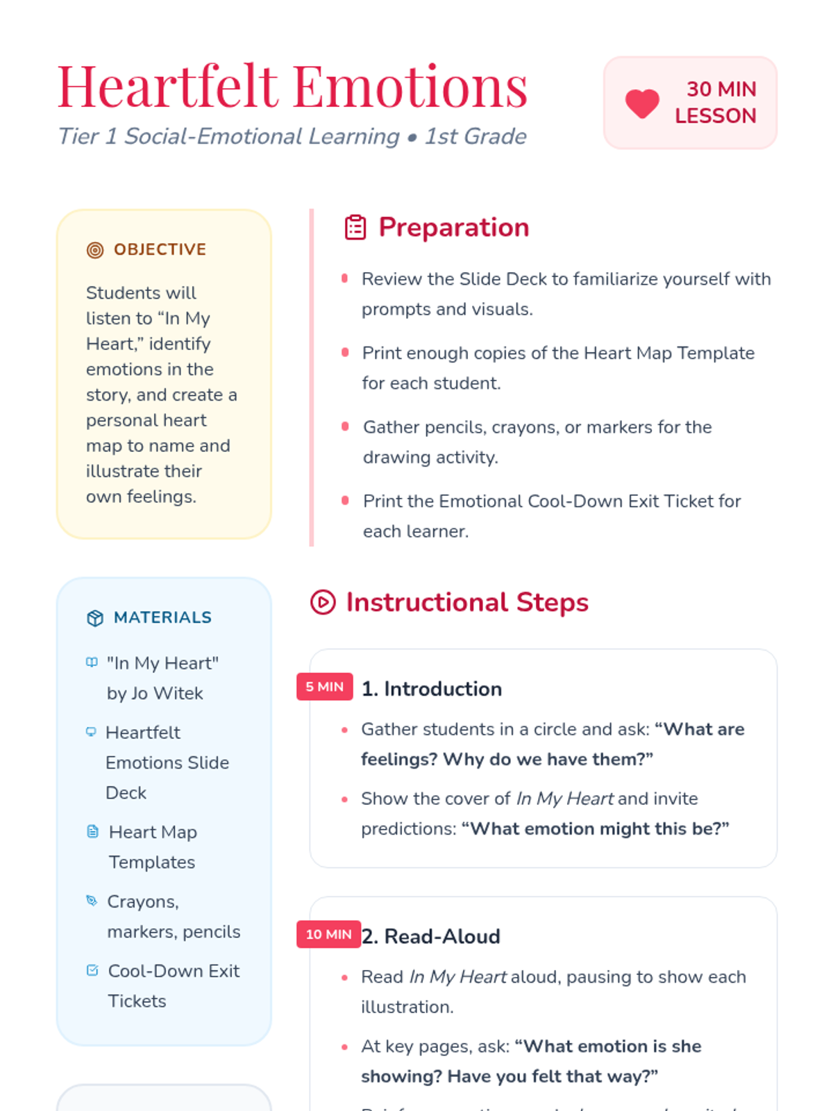 A 30-minute Tier 1 SEL lesson for 1st grade students to explore emotional literacy using the book 'In My Heart' by Jo Witek. Students will identify, name, and illustrate their feelings through a heart-mapping activity and reflection.