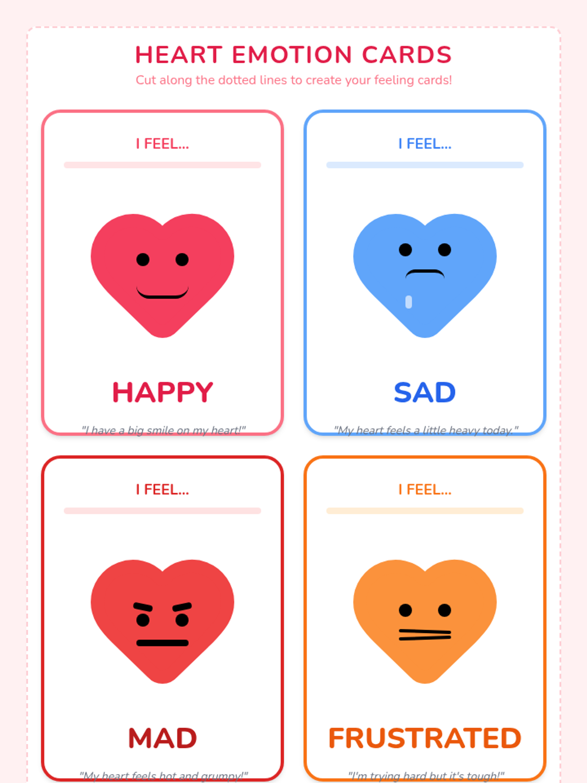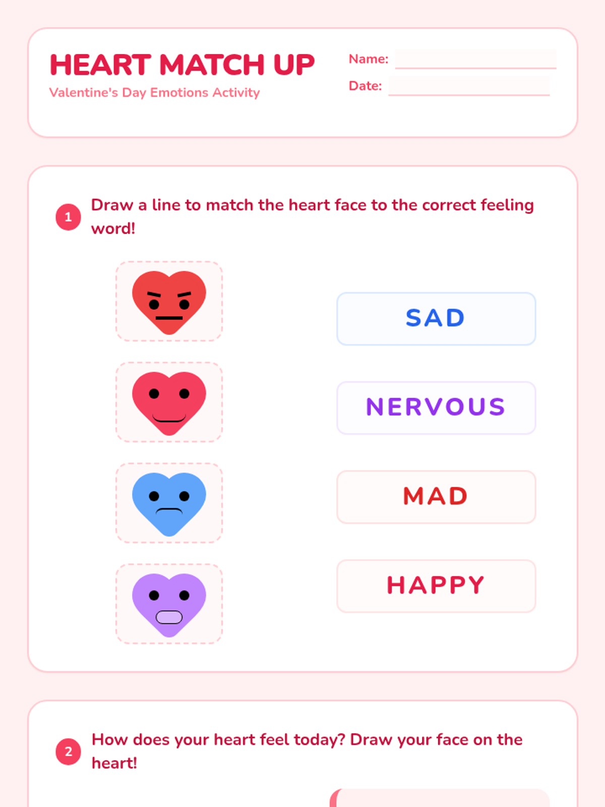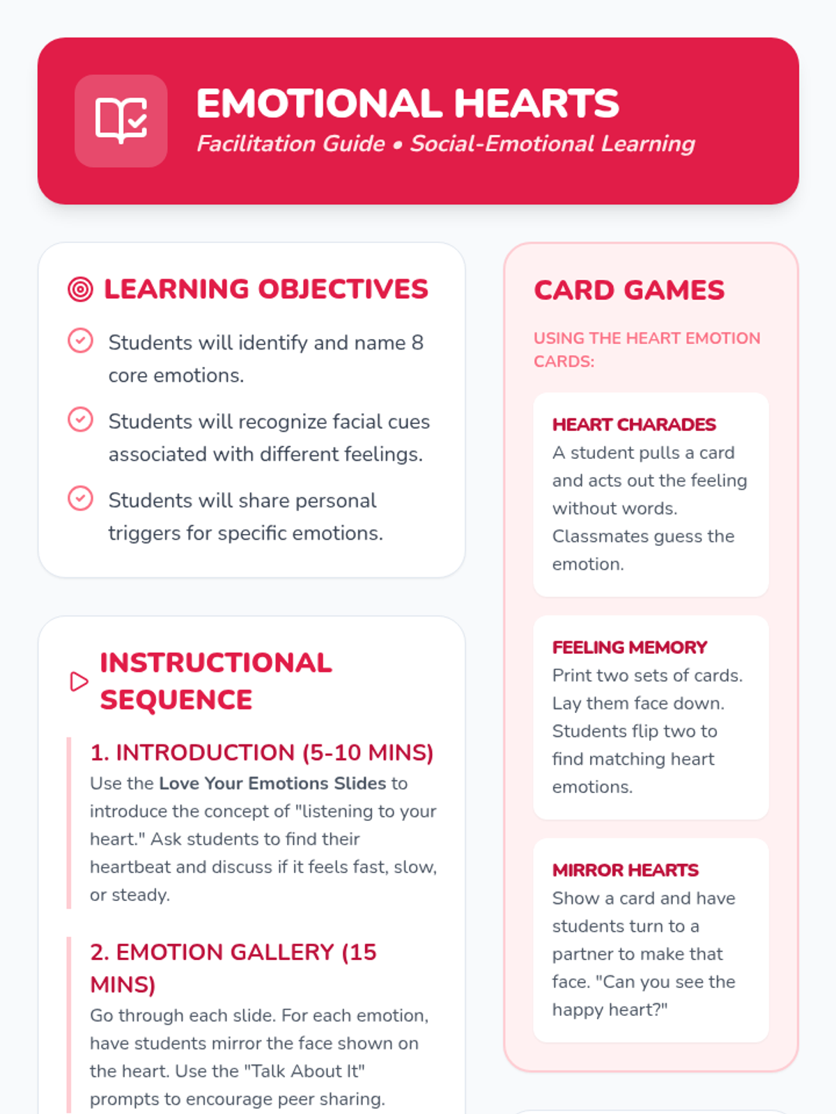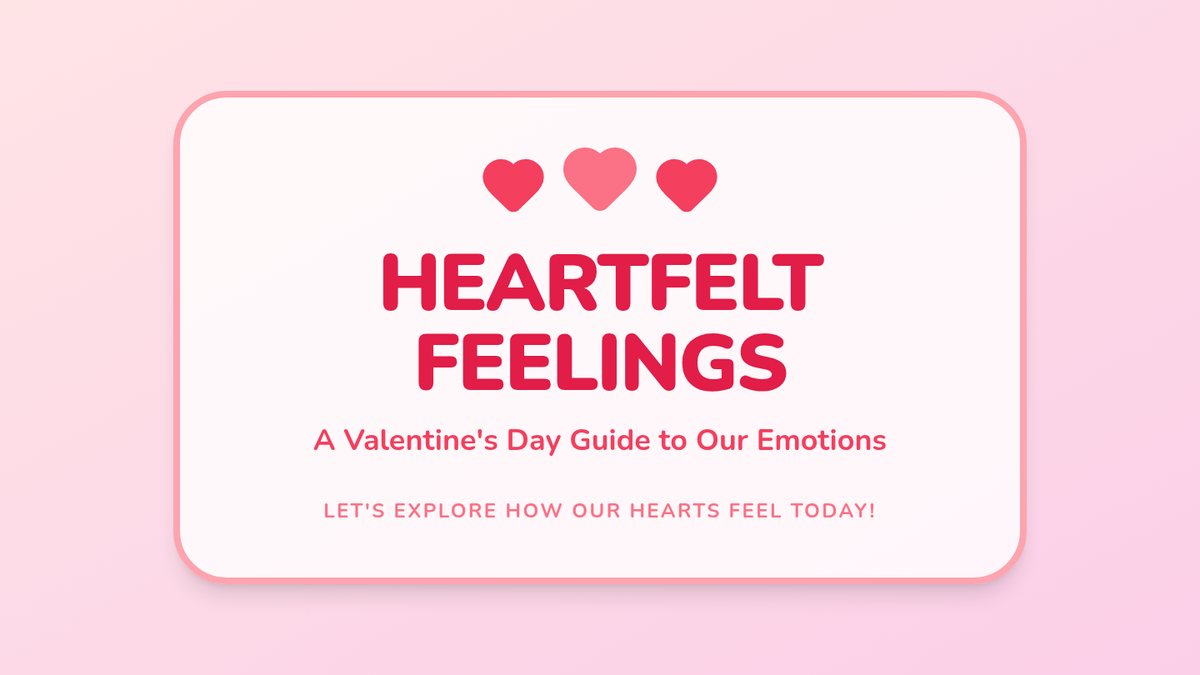 A charming Valentine's Day lesson focused on social-emotional learning, helping students identify and express eight key emotions using heart-themed visuals and interactive activities.