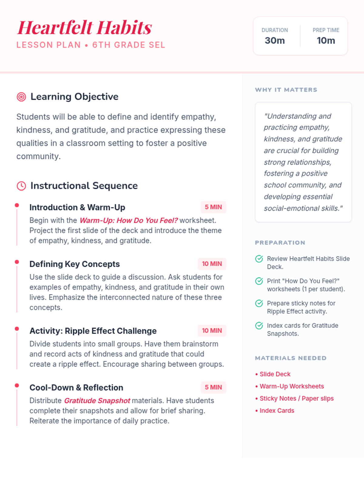 A 30-minute social-emotional learning lesson for 6th graders that explores the interconnected nature of empathy, kindness, and gratitude to foster a positive classroom community.