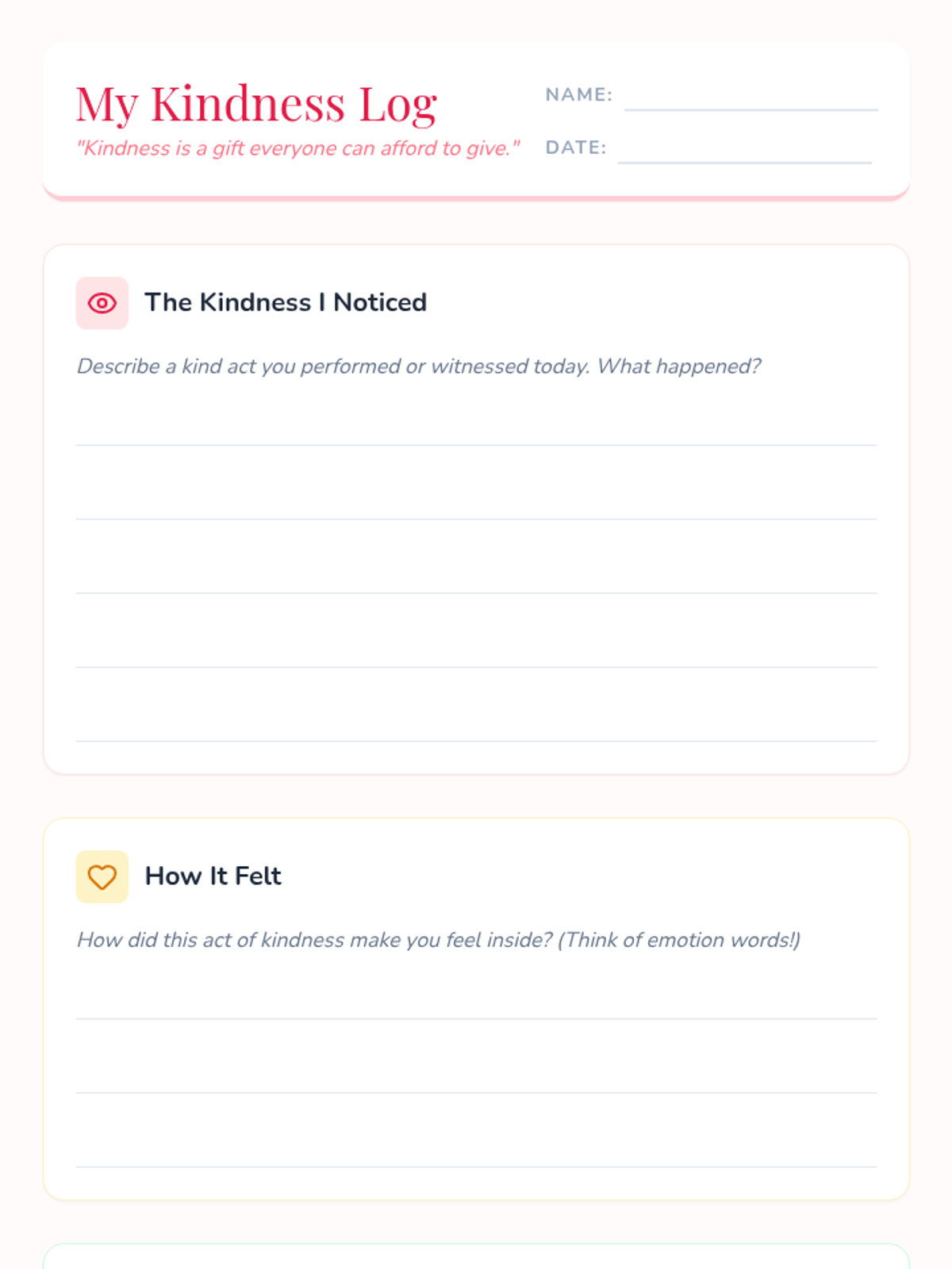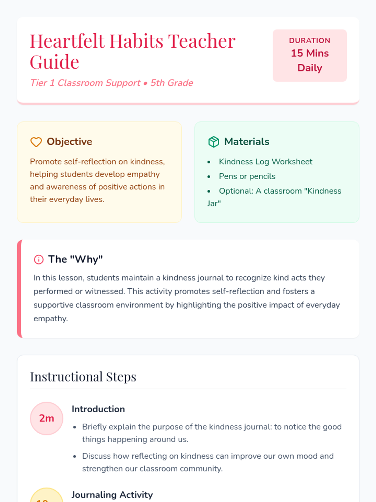 A lesson focused on fostering empathy and self-reflection through daily journaling of kind acts performed or witnessed. Students explore the emotional impact of kindness on themselves and their community.
