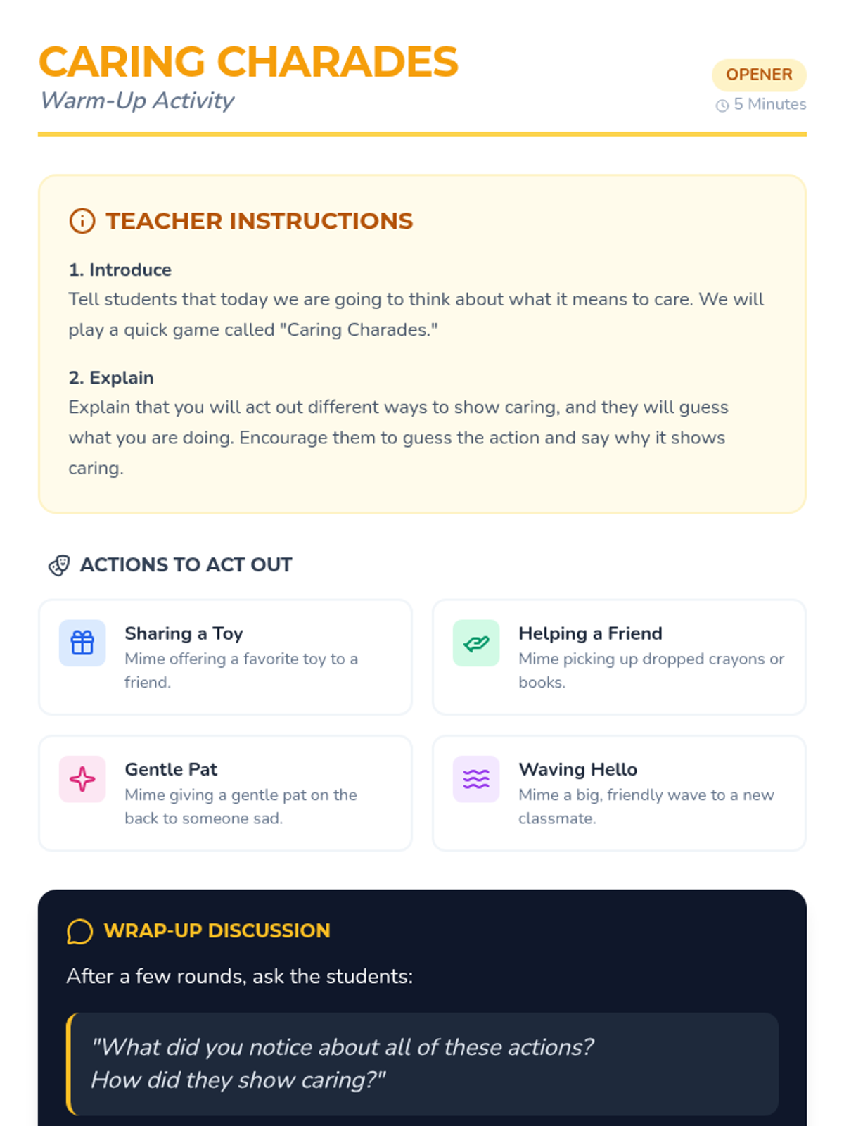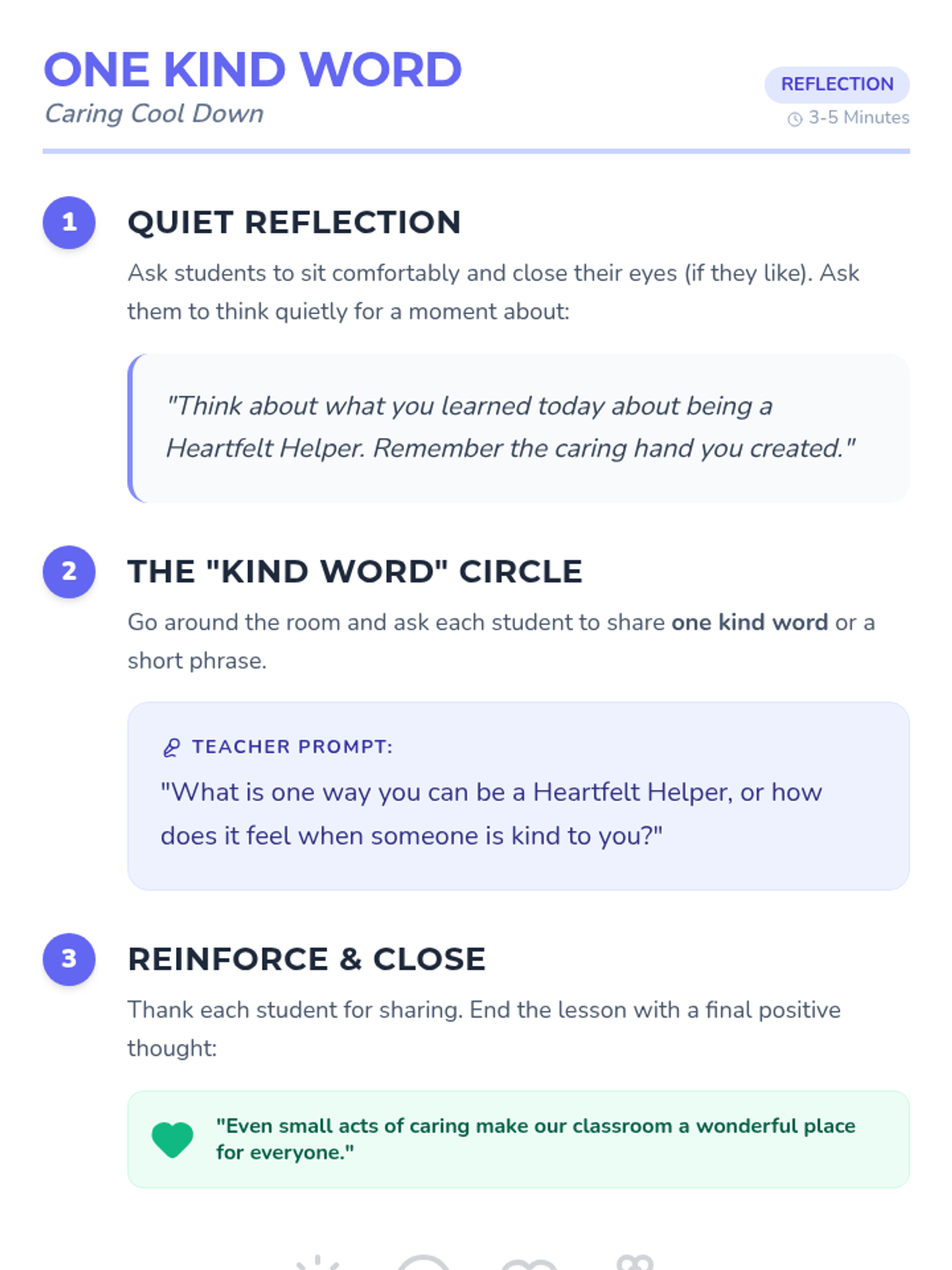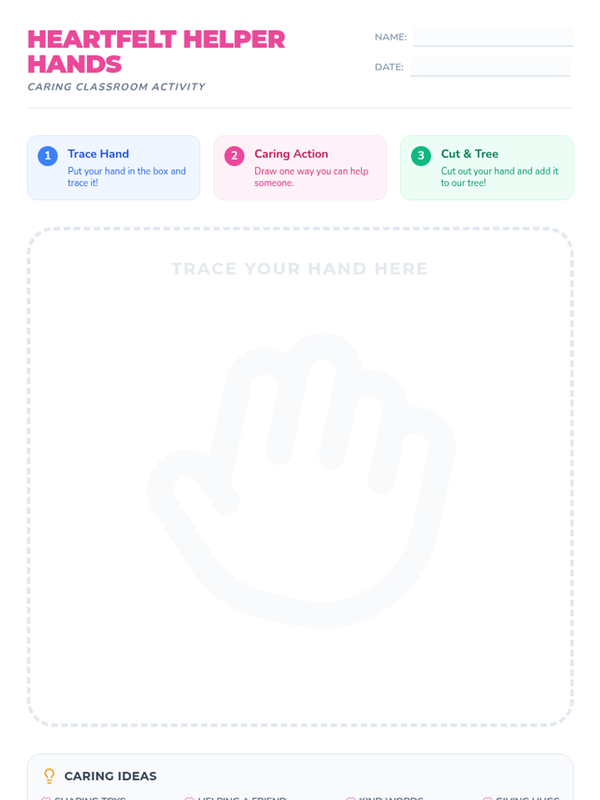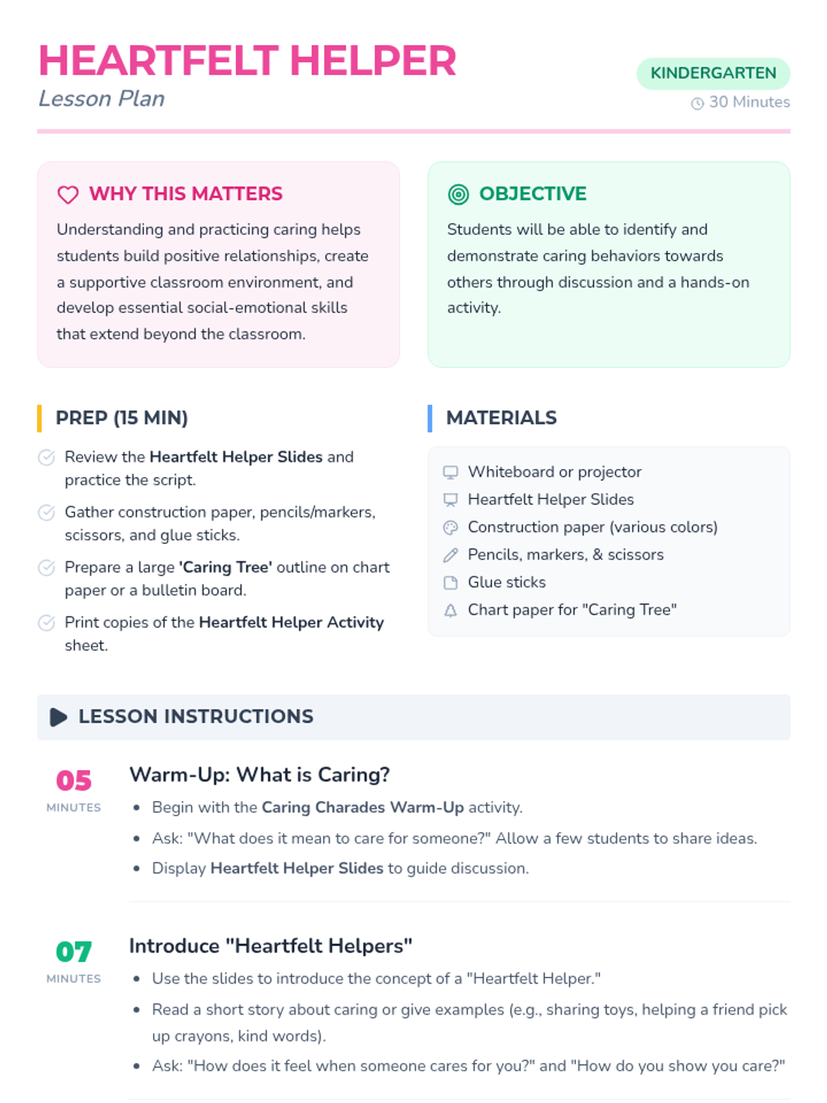 A 30-minute Kindergarten lesson focused on empathy and caring actions. Students learn what it means to be a 'Heartfelt Helper' and create a visual 'Caring Tree' with their handprints.