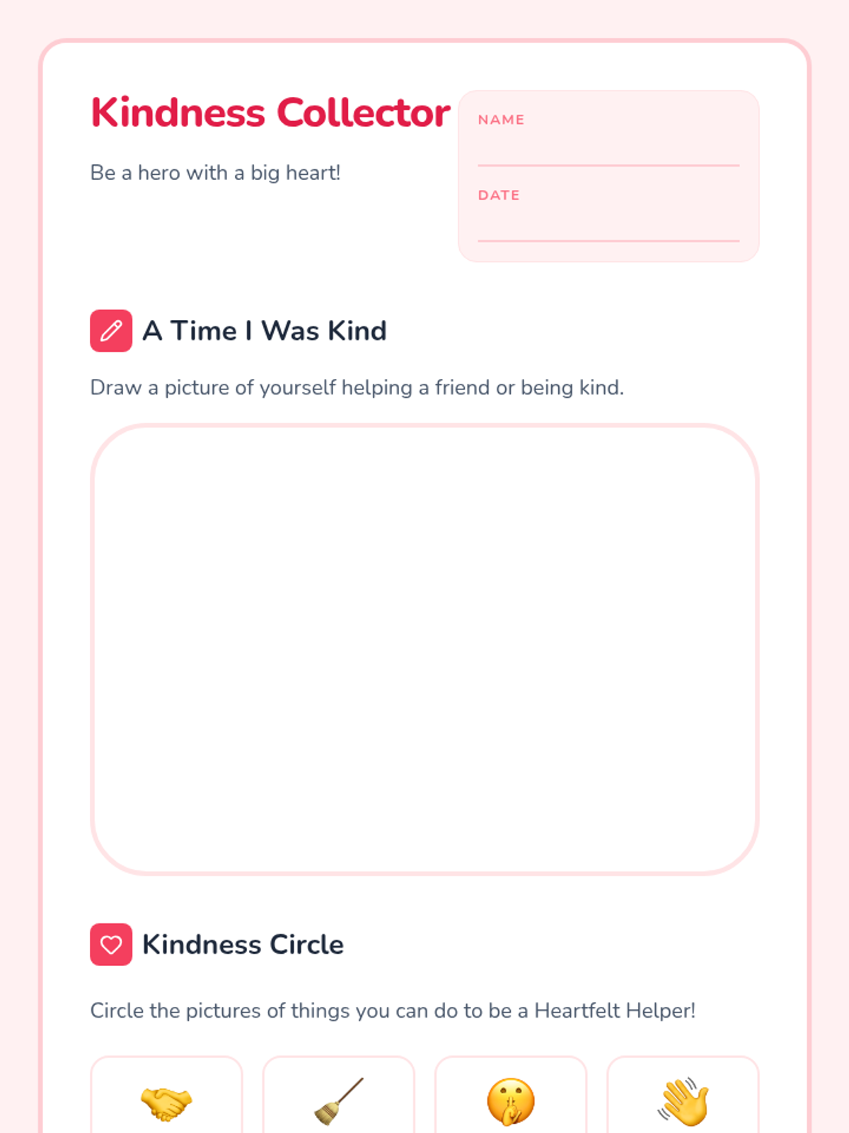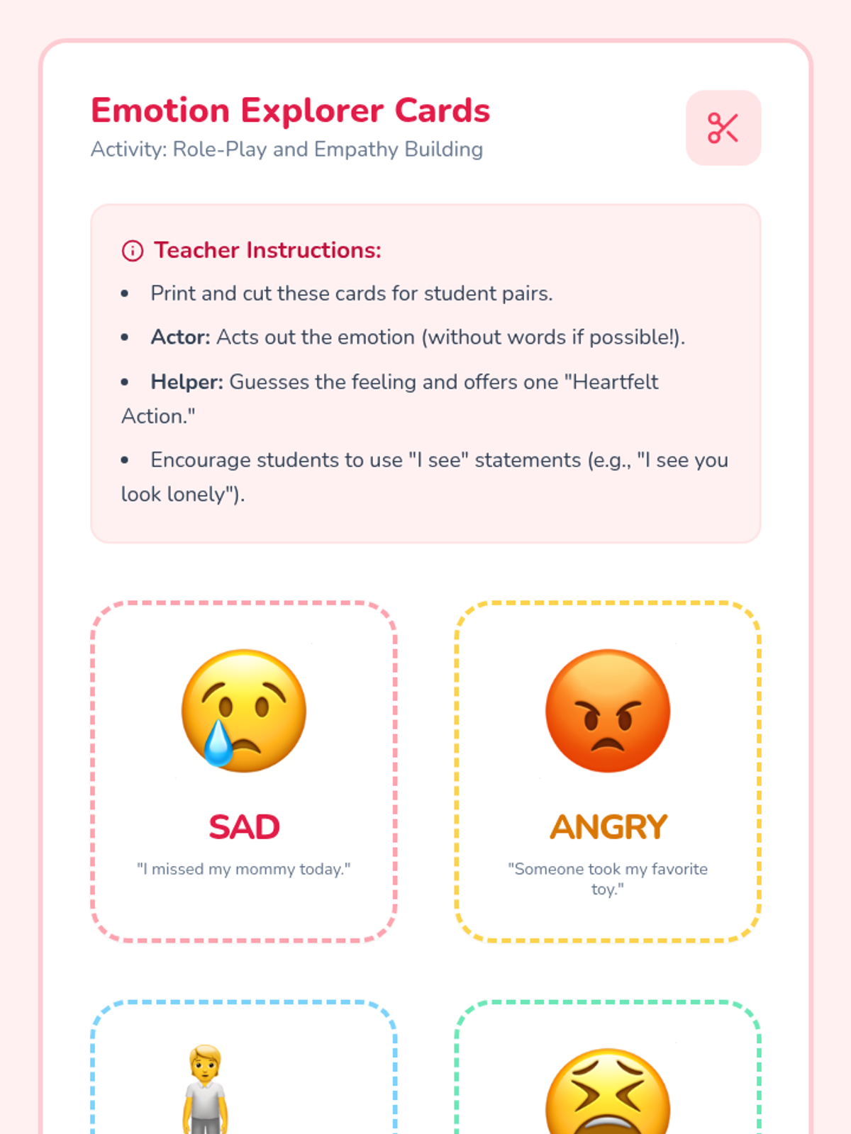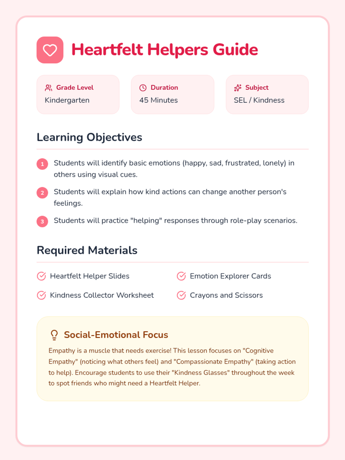 A kindergarten lesson focused on developing empathy and kindness. Students learn to recognize emotions through 'Feeling Cards' and role-playing, helping them understand how their actions impact others and how to be helpful community members.