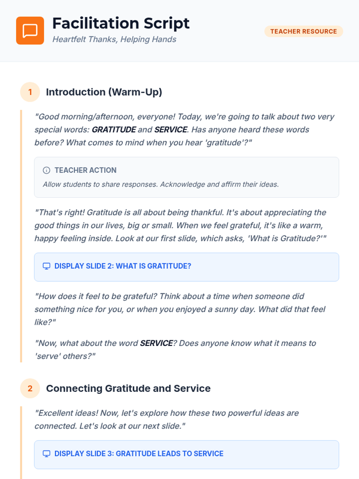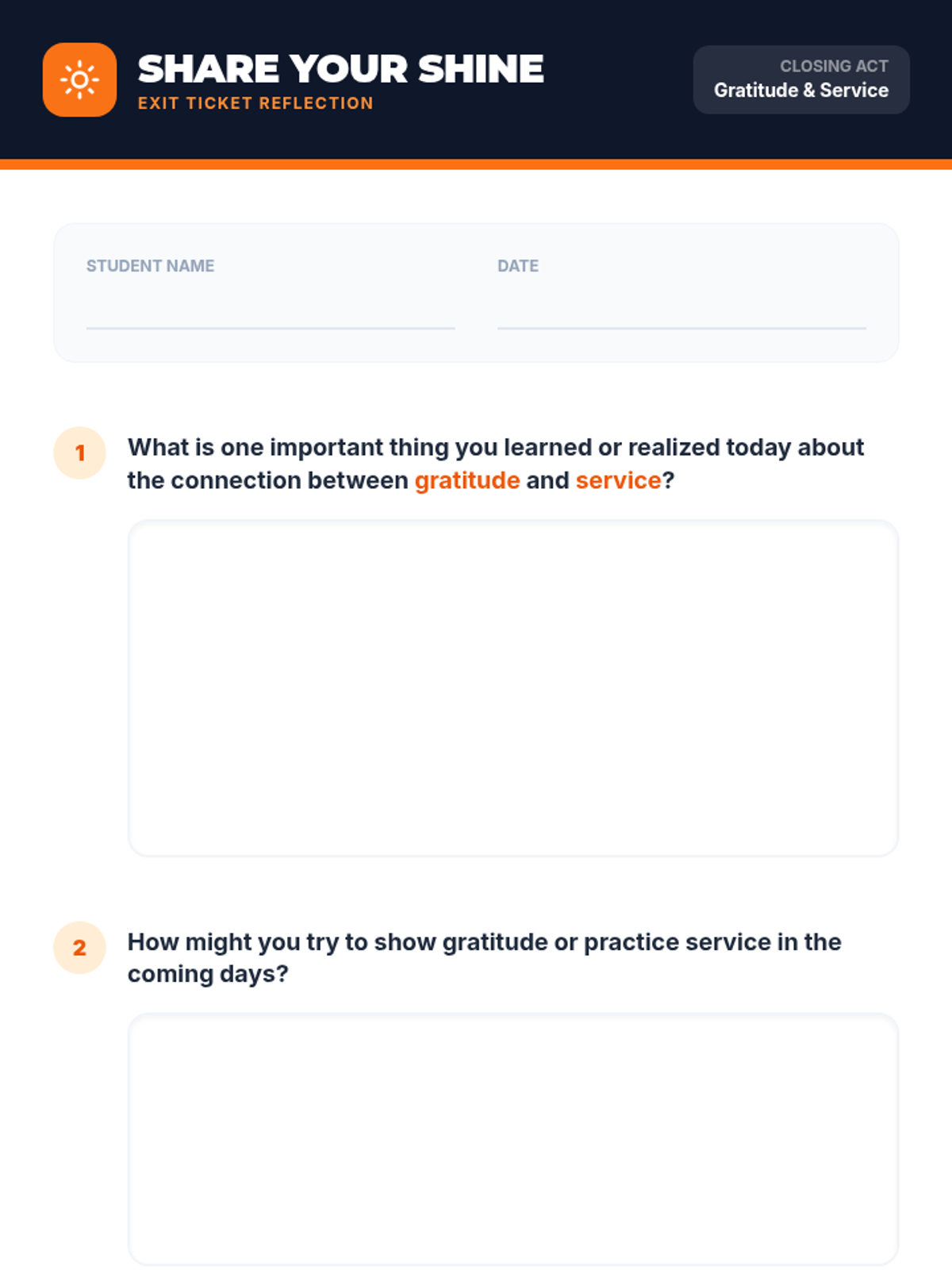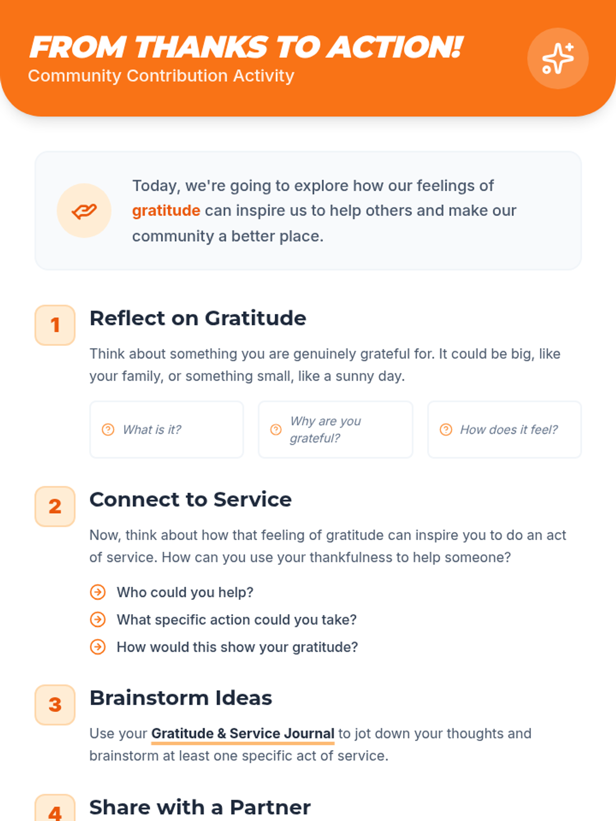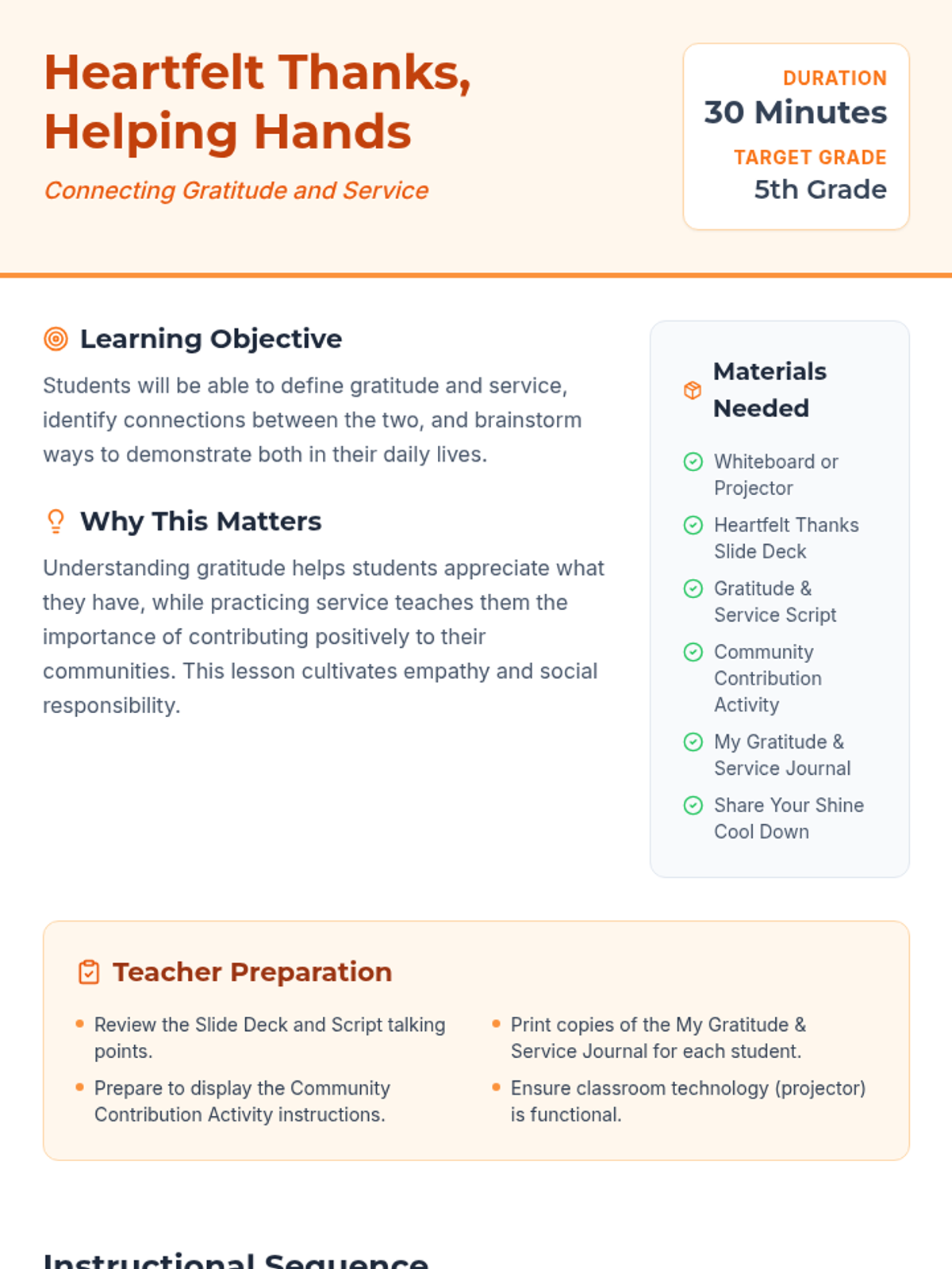 A 30-minute lesson for 5th-grade students exploring the powerful connection between gratitude and service, fostering a deeper understanding of how expressing thanks can inspire actions that benefit others.