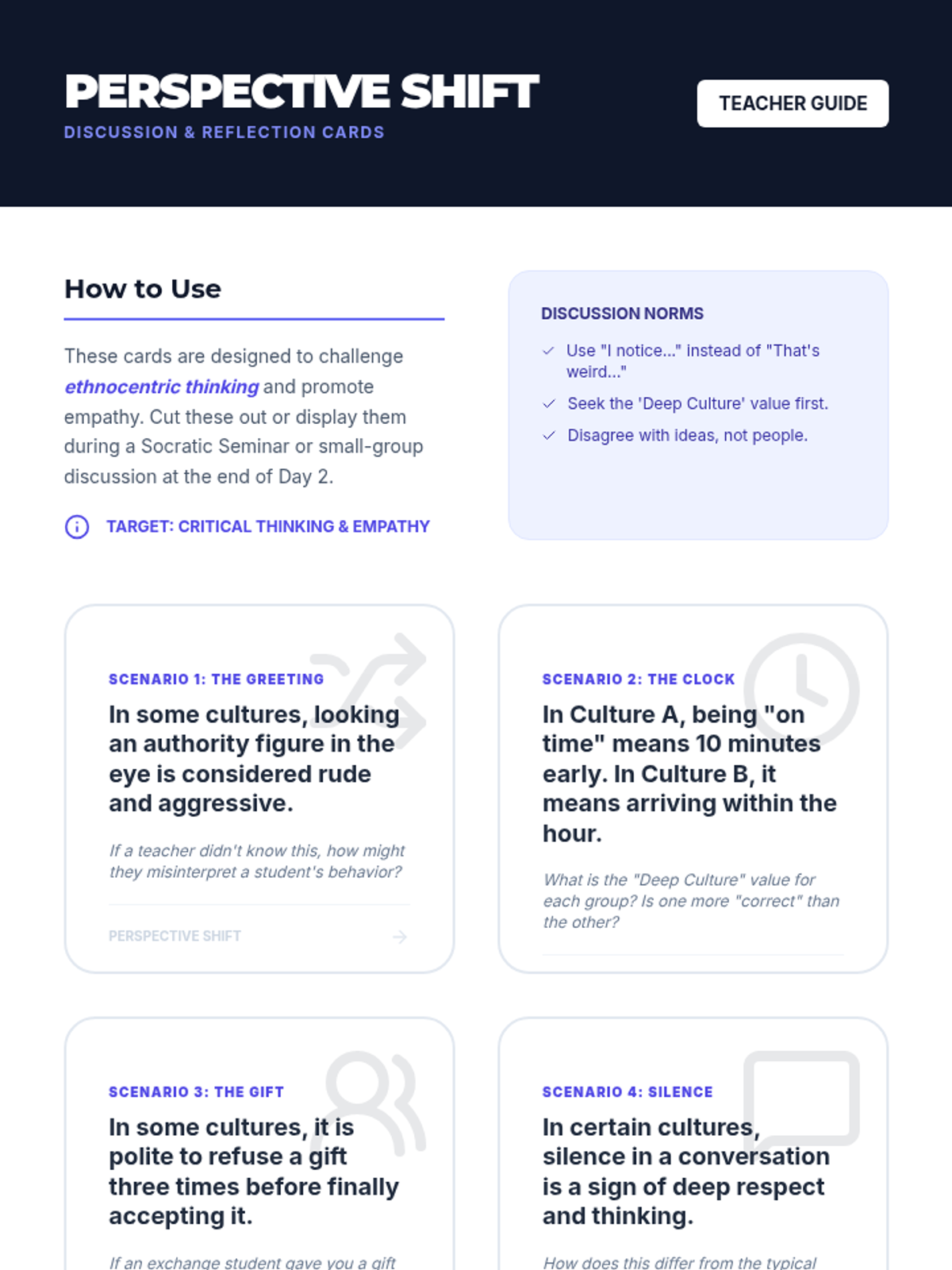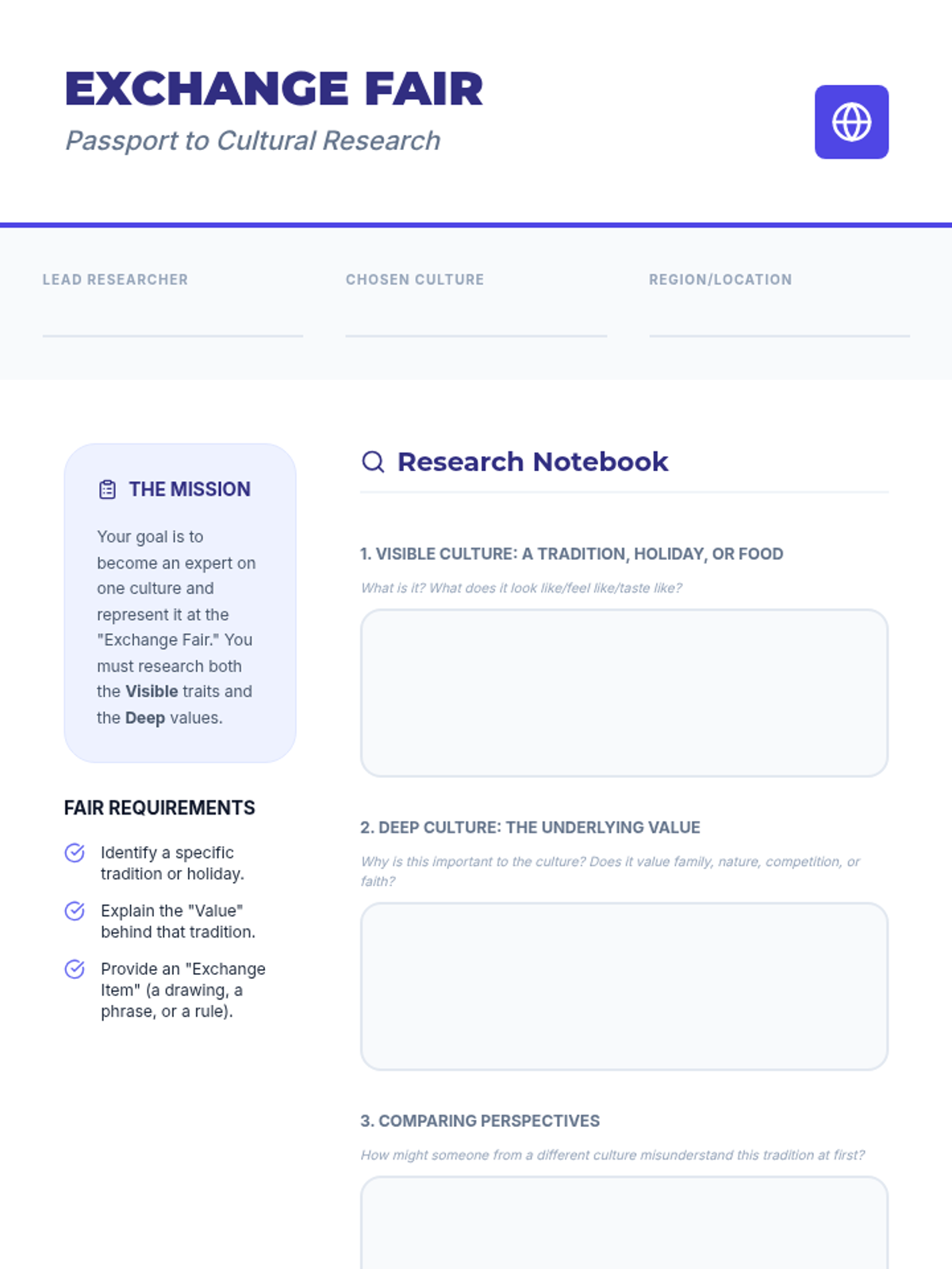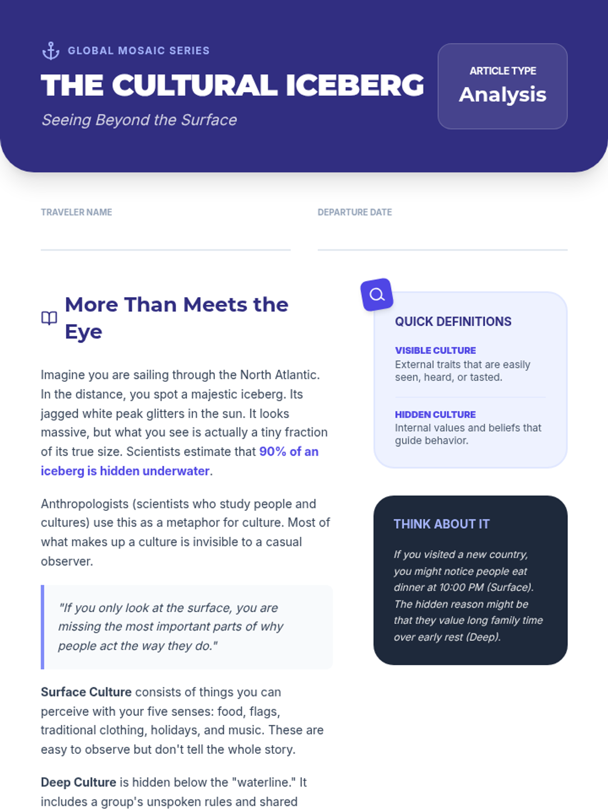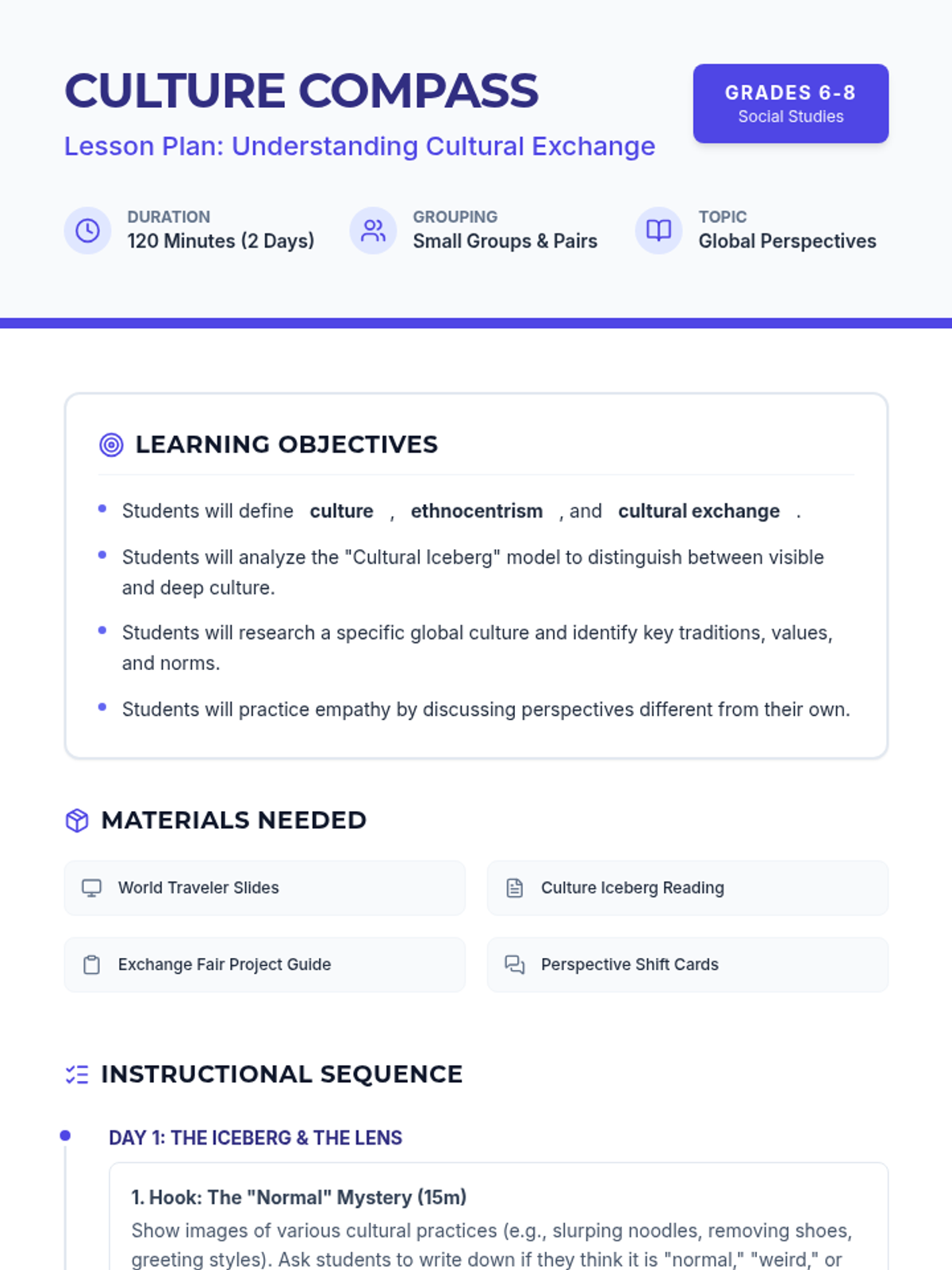 A comprehensive middle school lesson on cultural exchange, exploring the 'cultural iceberg' and challenging ethnocentrism through research and simulation.