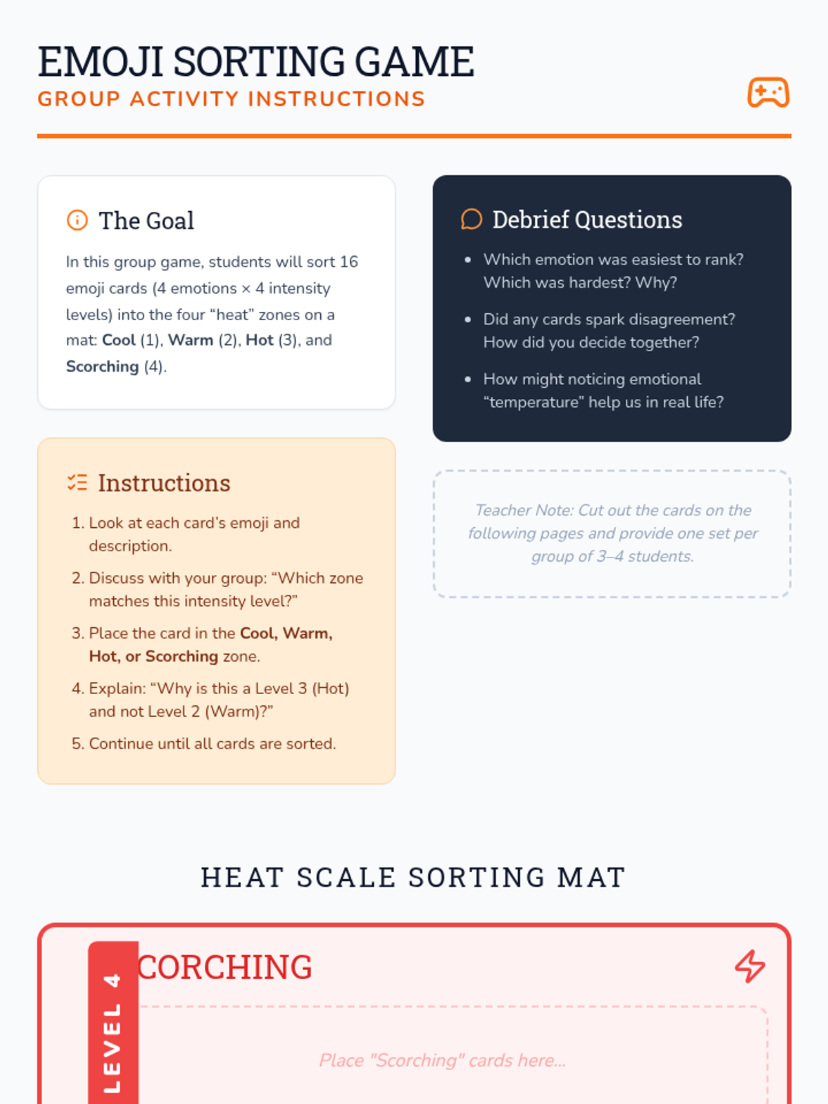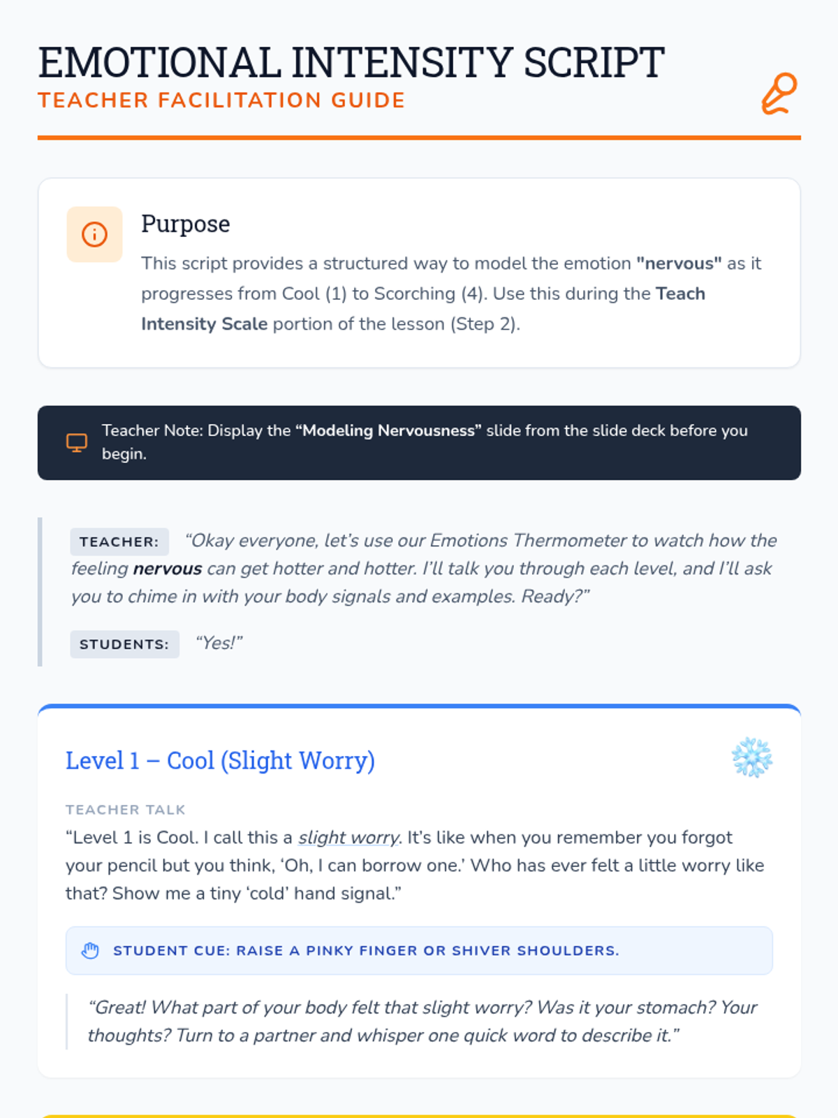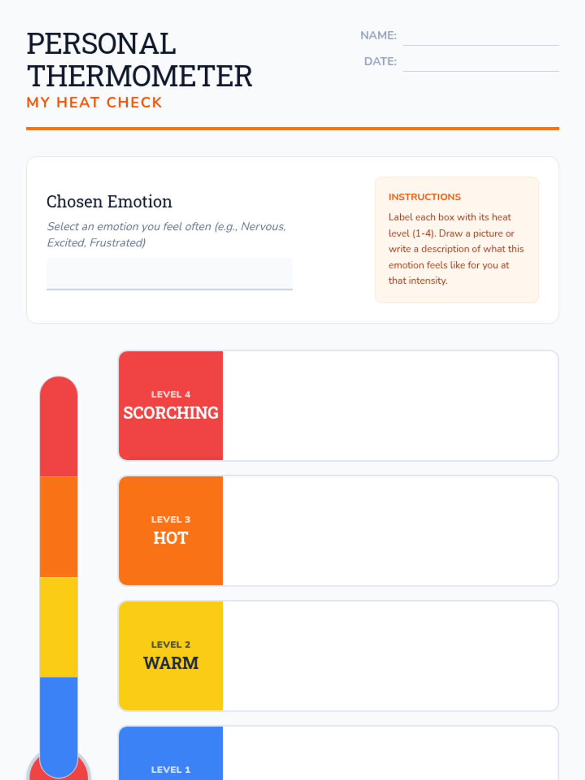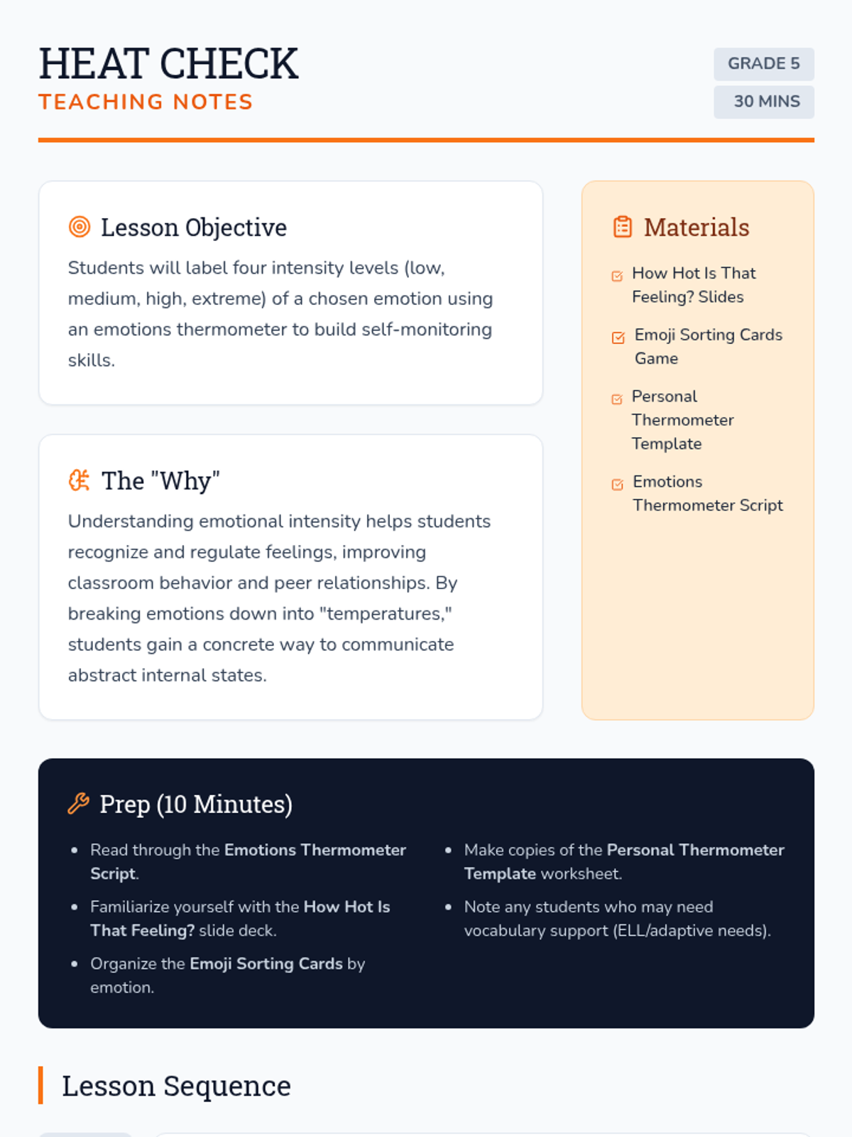 A 30-minute 5th grade lesson where students explore emotional intensity using a four-level 'Heat Scale' (Cool, Warm, Hot, Scorching) to improve self-monitoring and regulation.