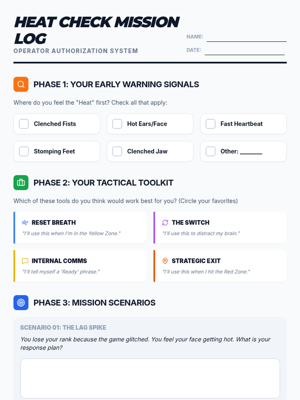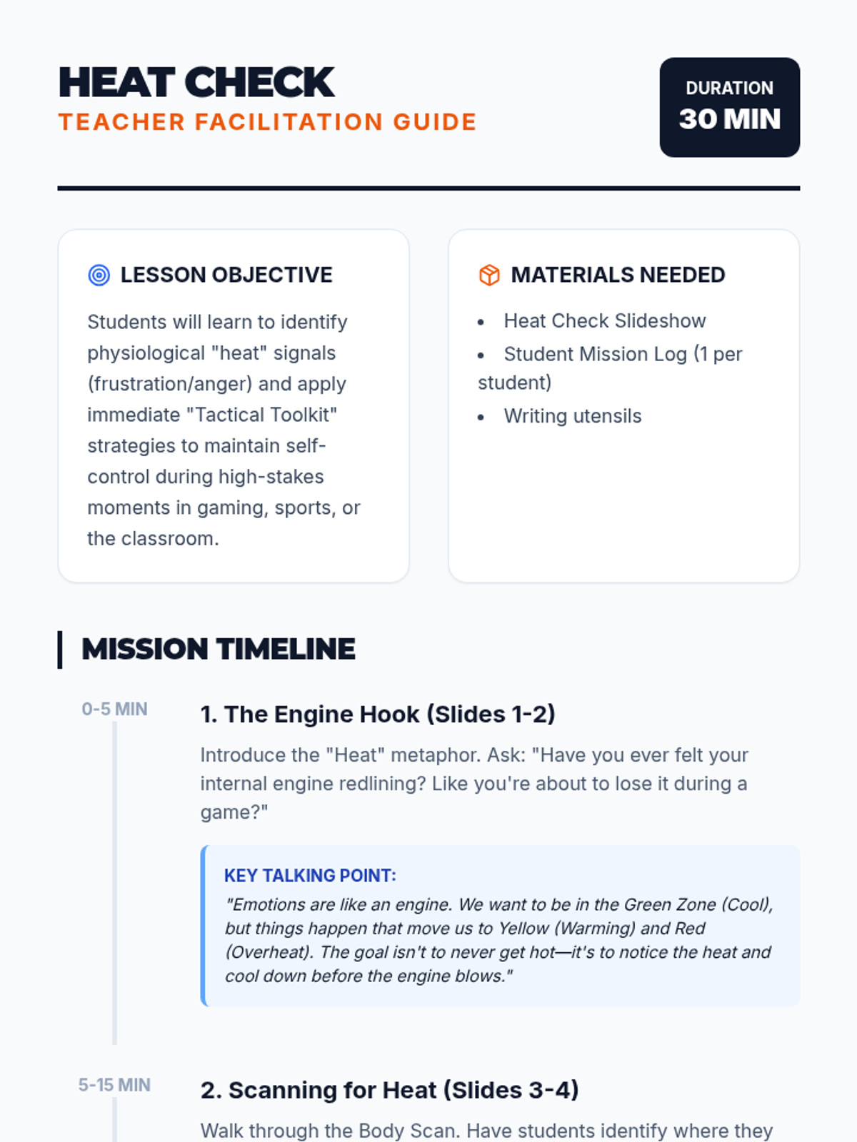 An SEL lesson designed for 5th-grade boys focused on identifying emotional 'heat' levels and applying immediate coping strategies during high-stress moments. The lesson uses relatable sports and gaming metaphors to engage students in self-regulation practice.