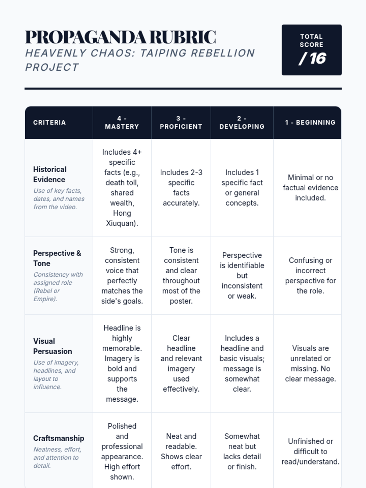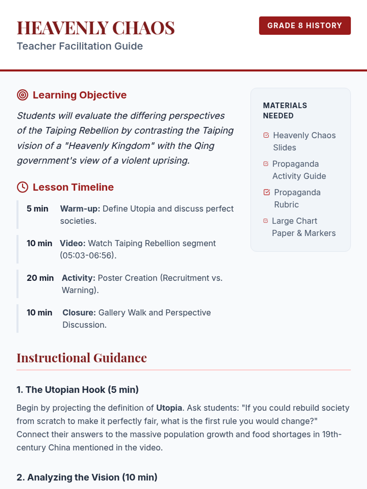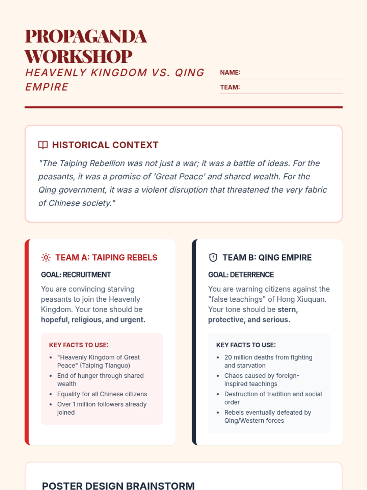 Students investigate the Taiping Rebellion by analyzing the conflicting perspectives of the Taiping 'Heavenly Kingdom' and the Qing Government through creative propaganda design.