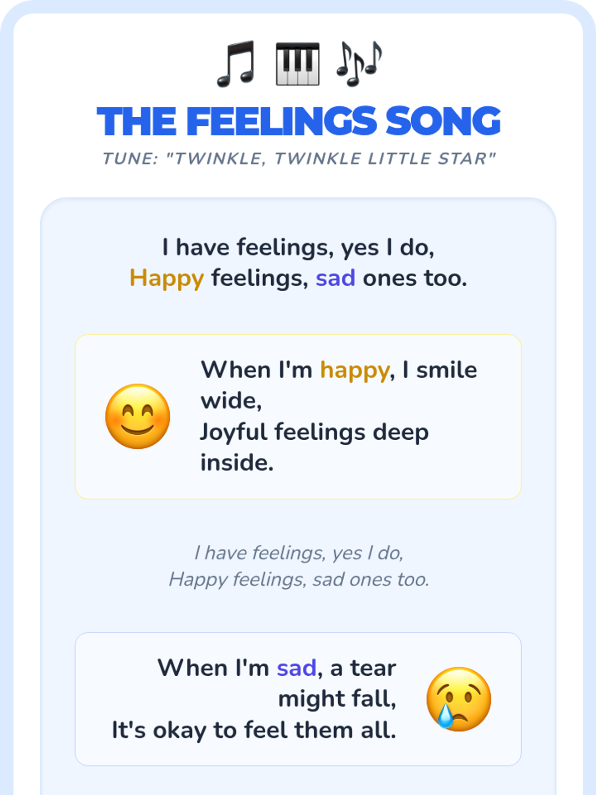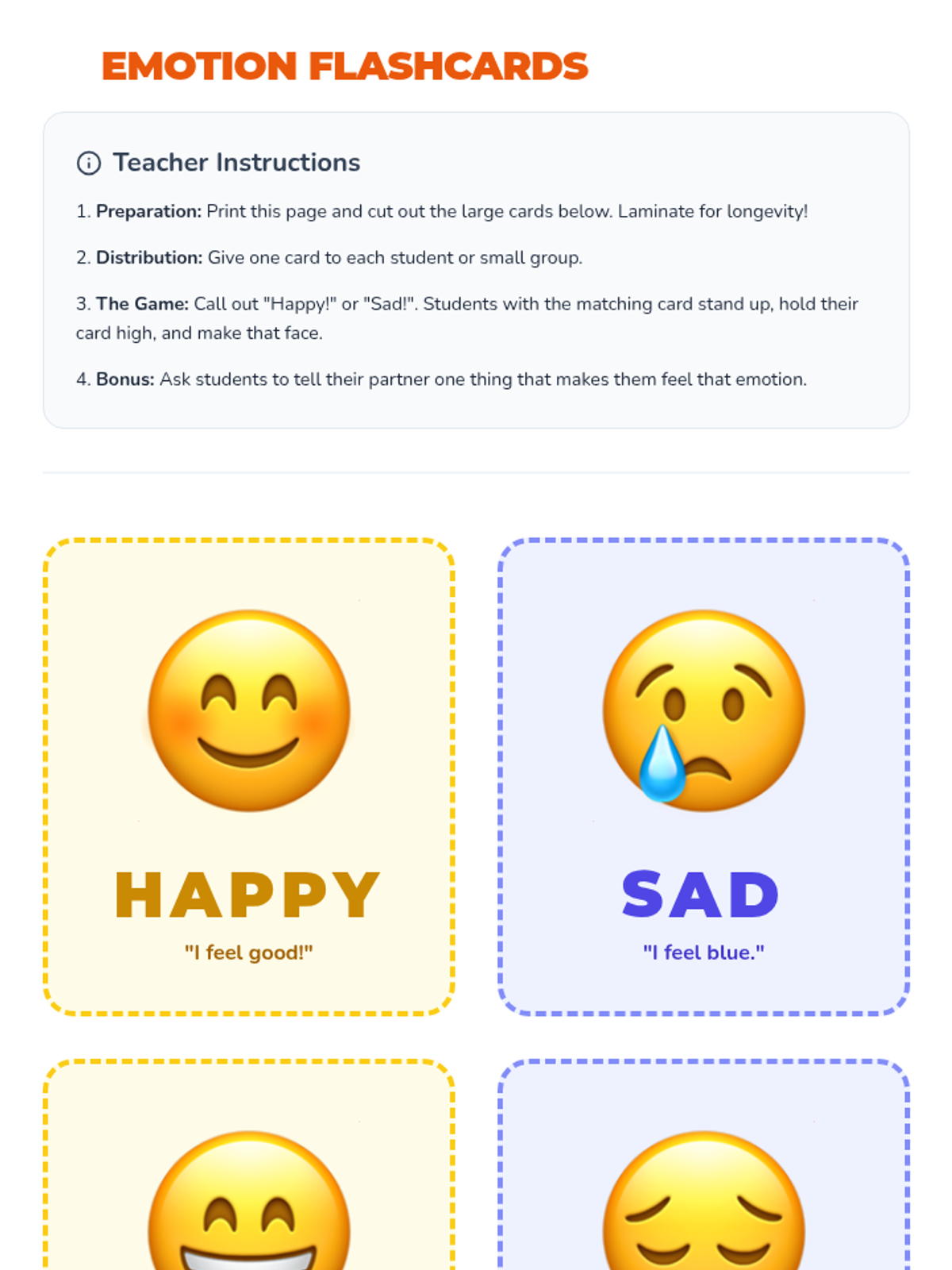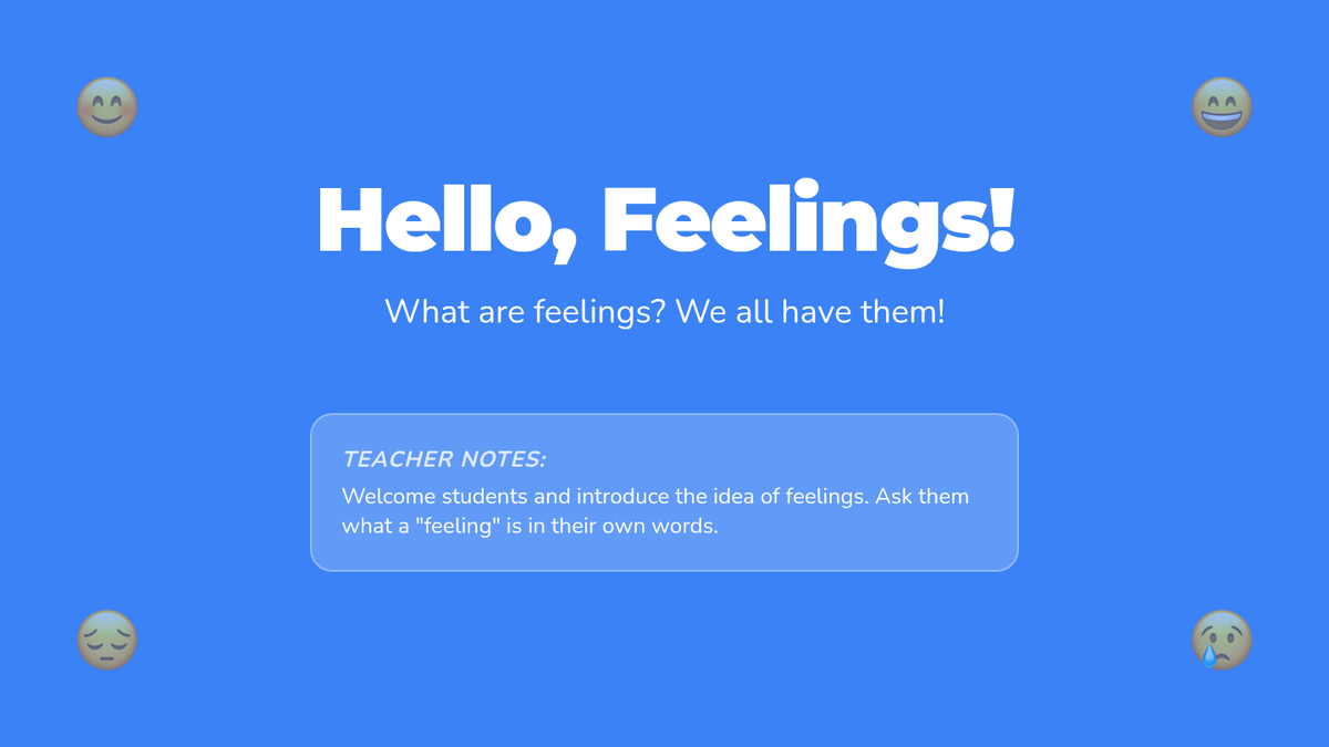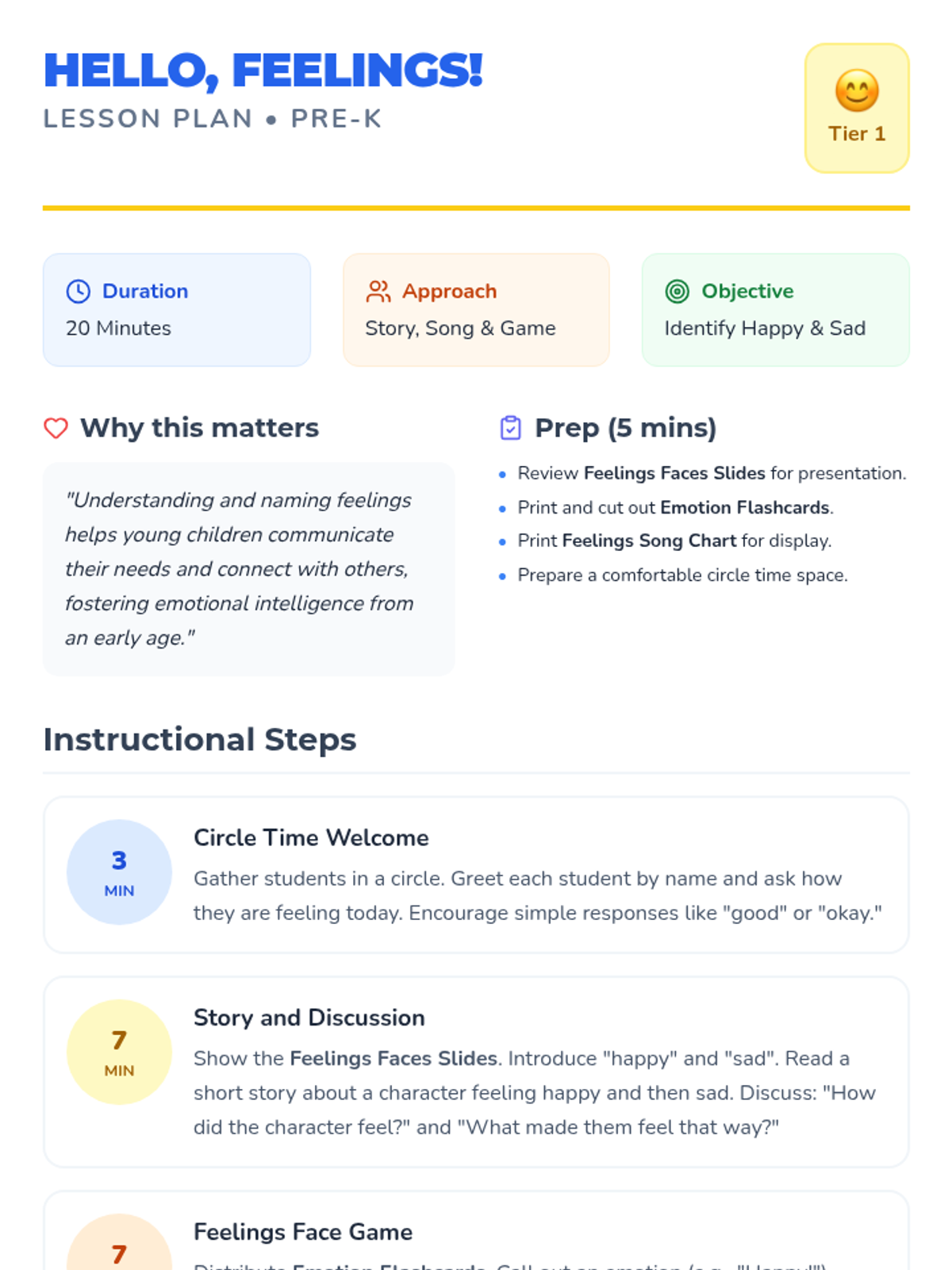 A gentle introduction for Pre-K students to recognize and name happy and sad emotions through stories, songs, and games.
