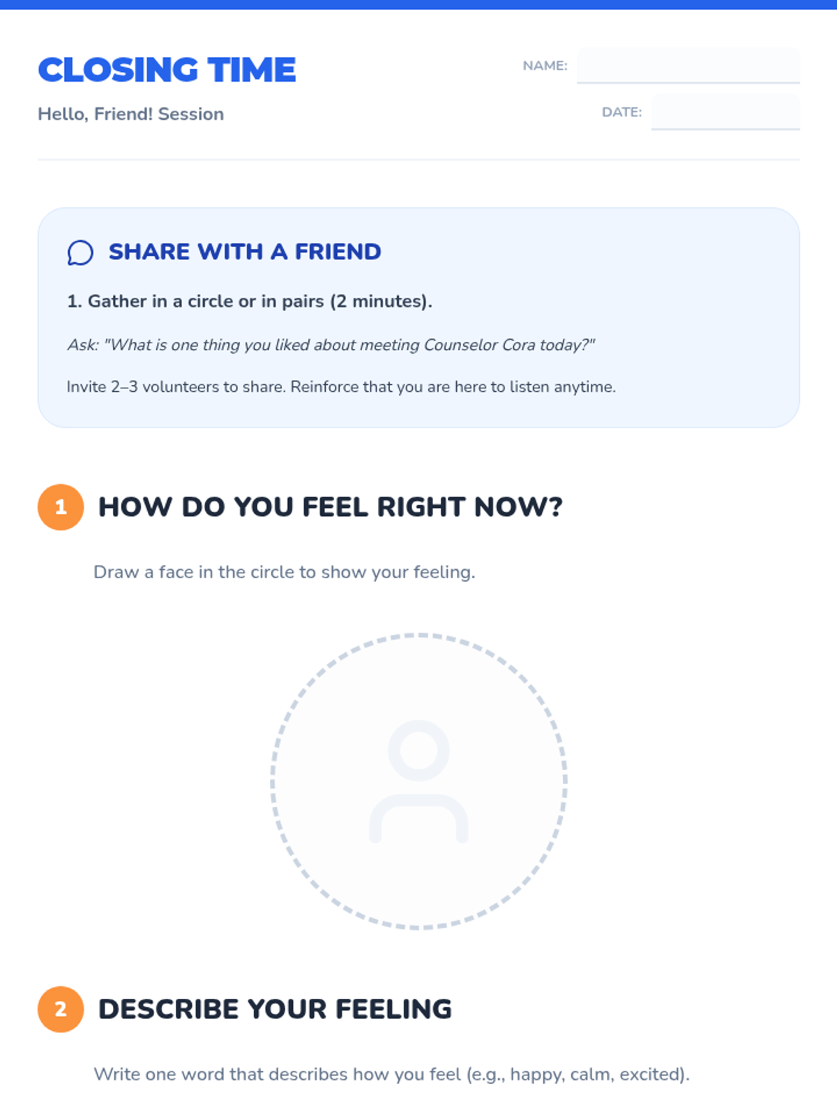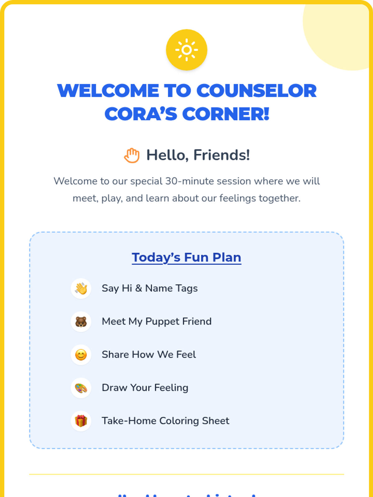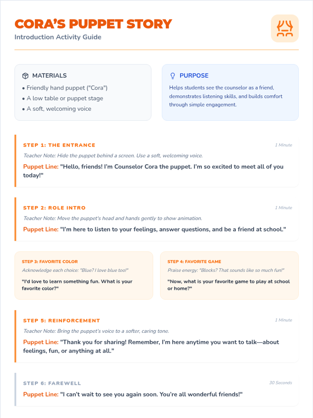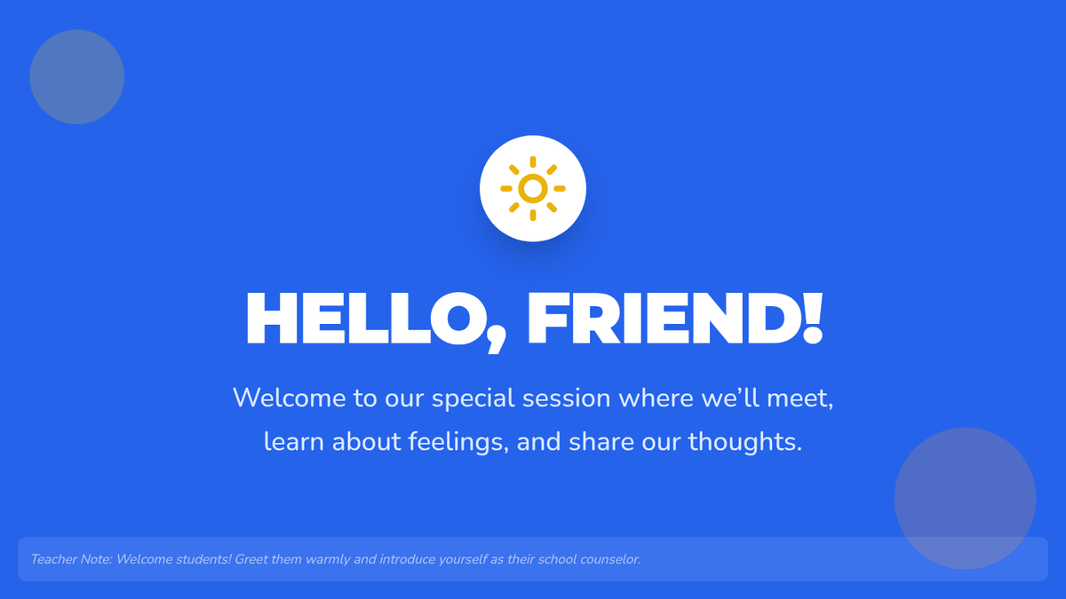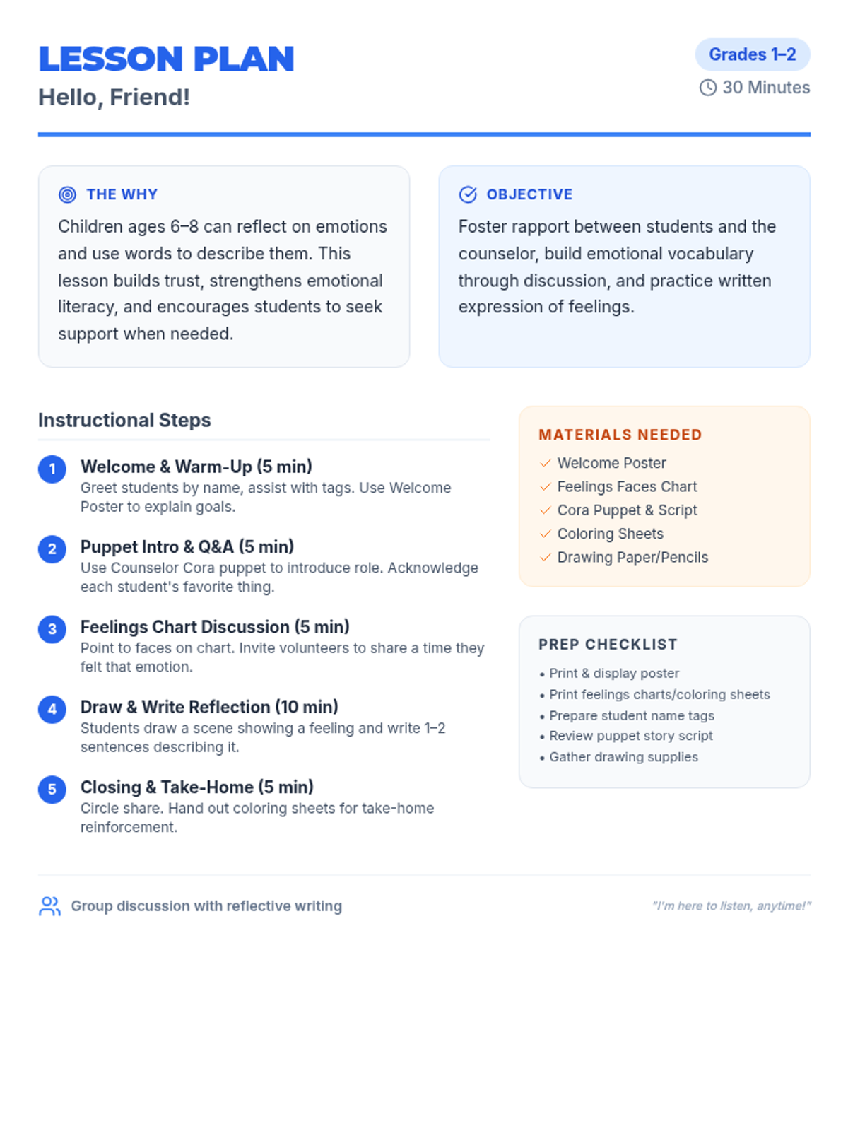 A fun 30-minute introductory session where early elementary students meet their school counselor, build trust, and learn to identify feelings. This Tier 1 lesson helps young learners feel comfortable, supported, and excited about reaching out for help.