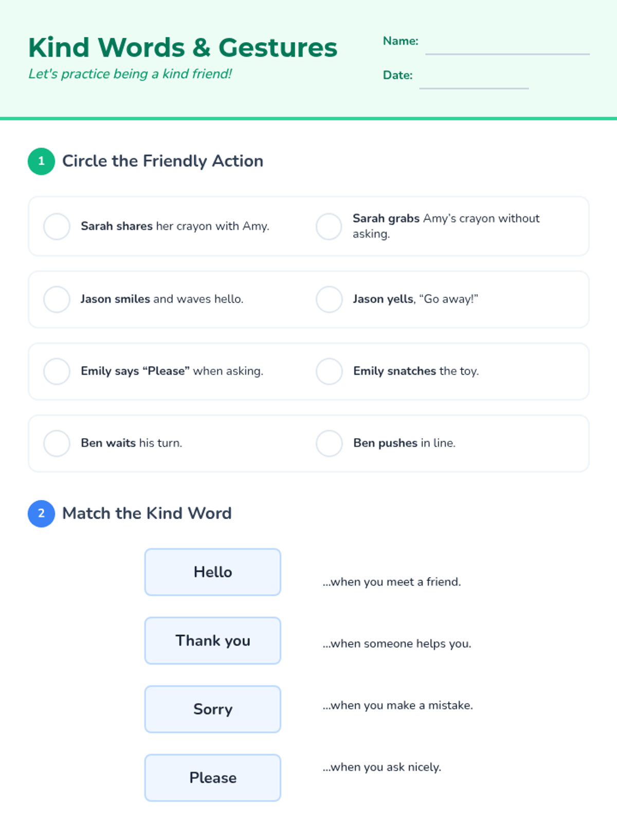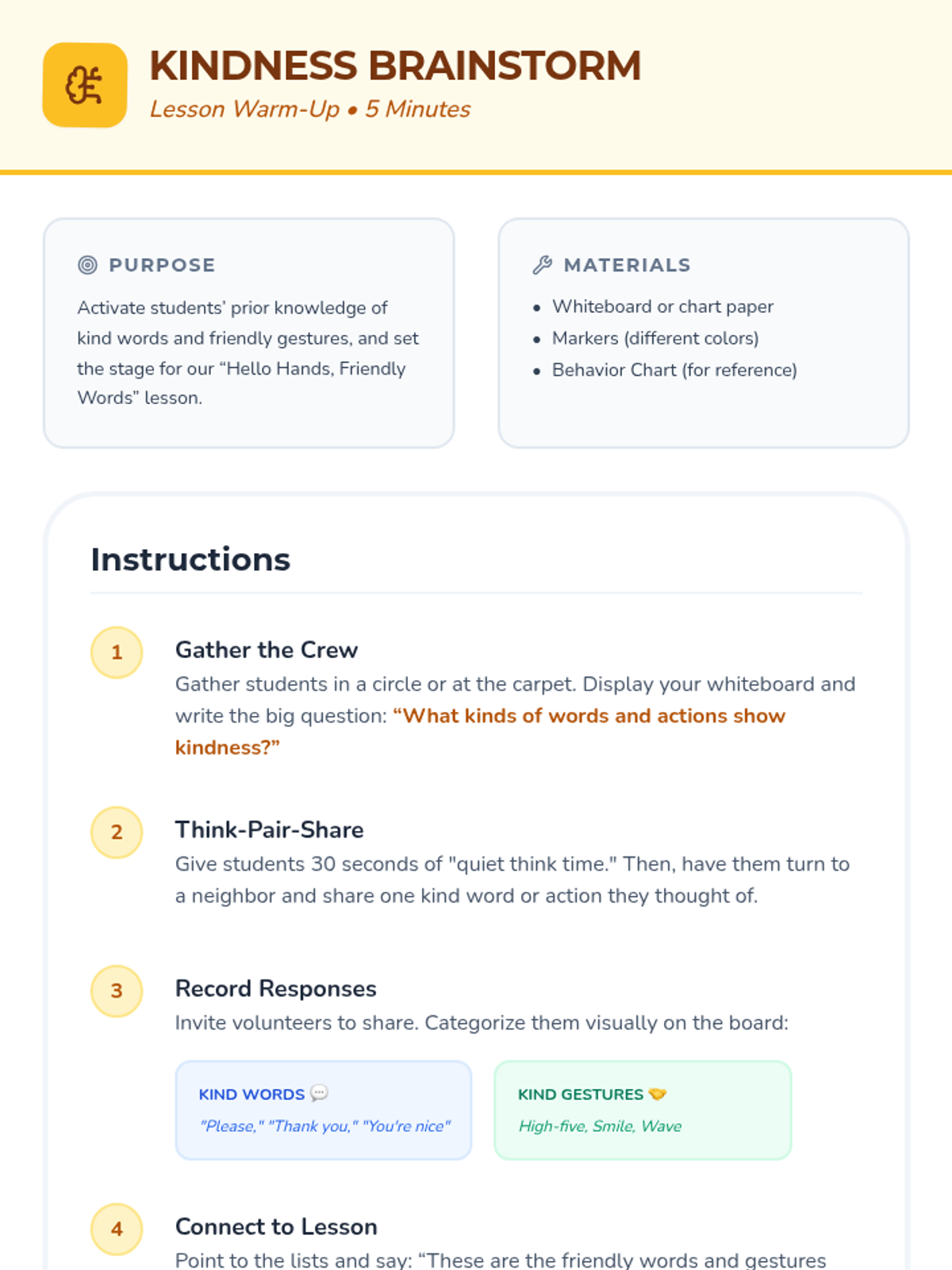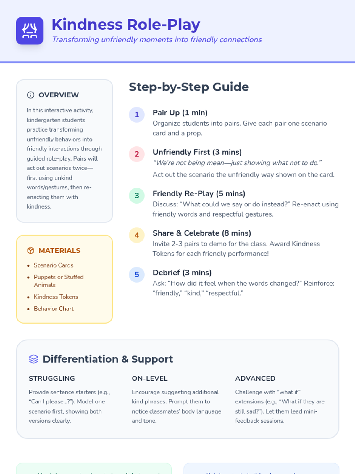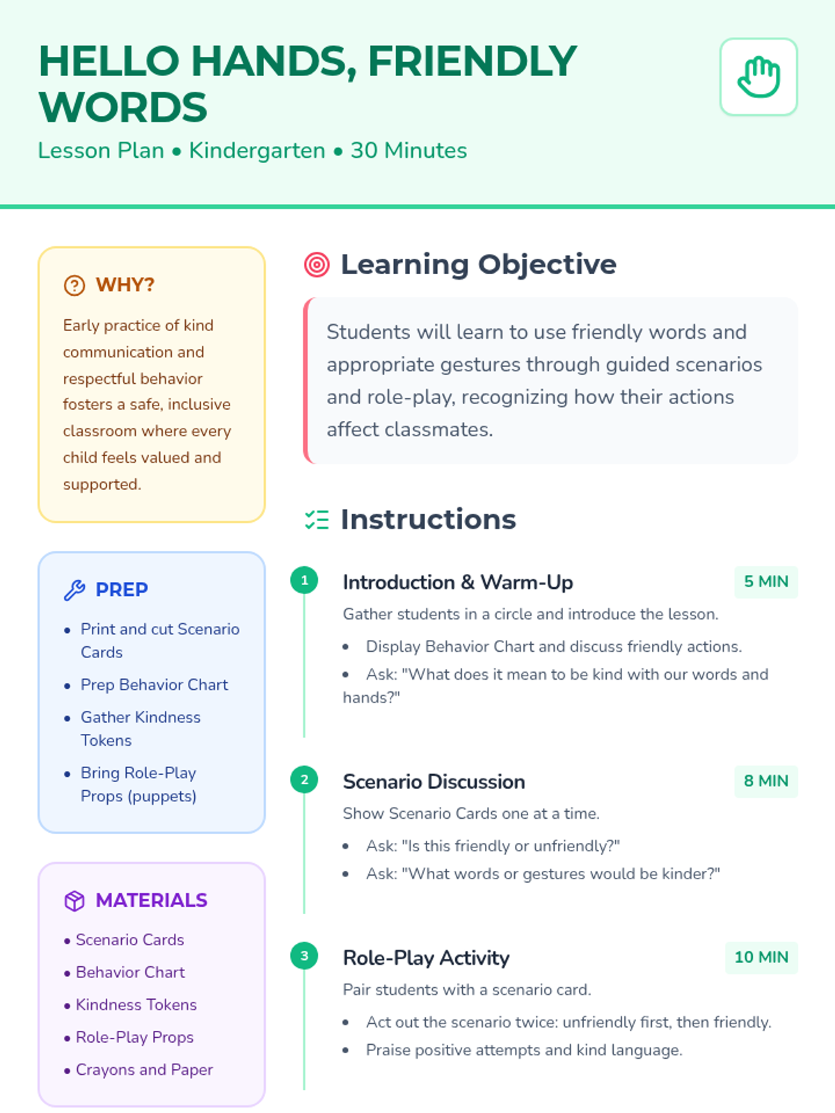 A 30-minute lesson for Kindergarten focused on using kind words and respectful gestures to build a safe and inclusive classroom community. Students explore scenarios through role-play, discussion, and interactive activities.