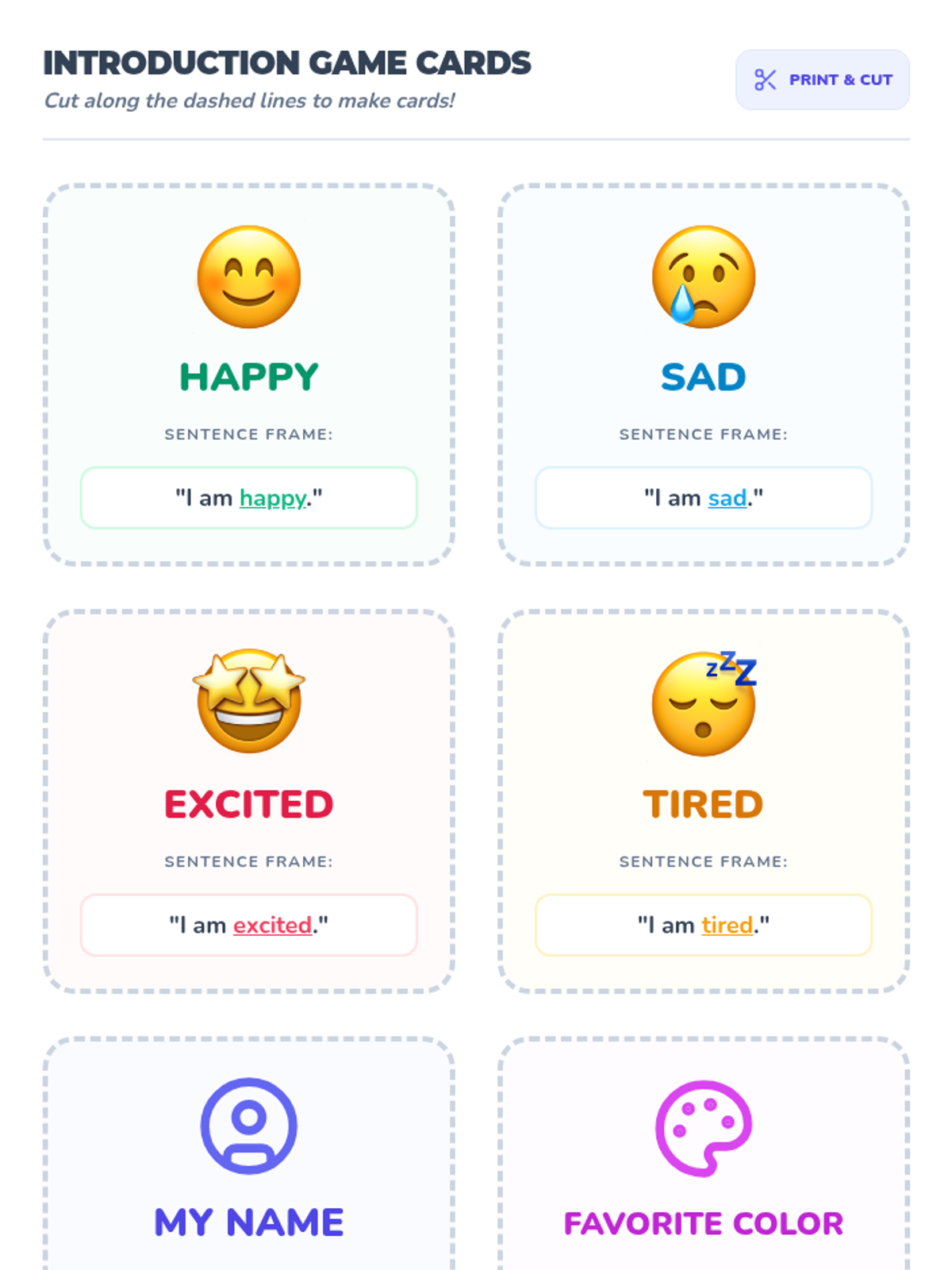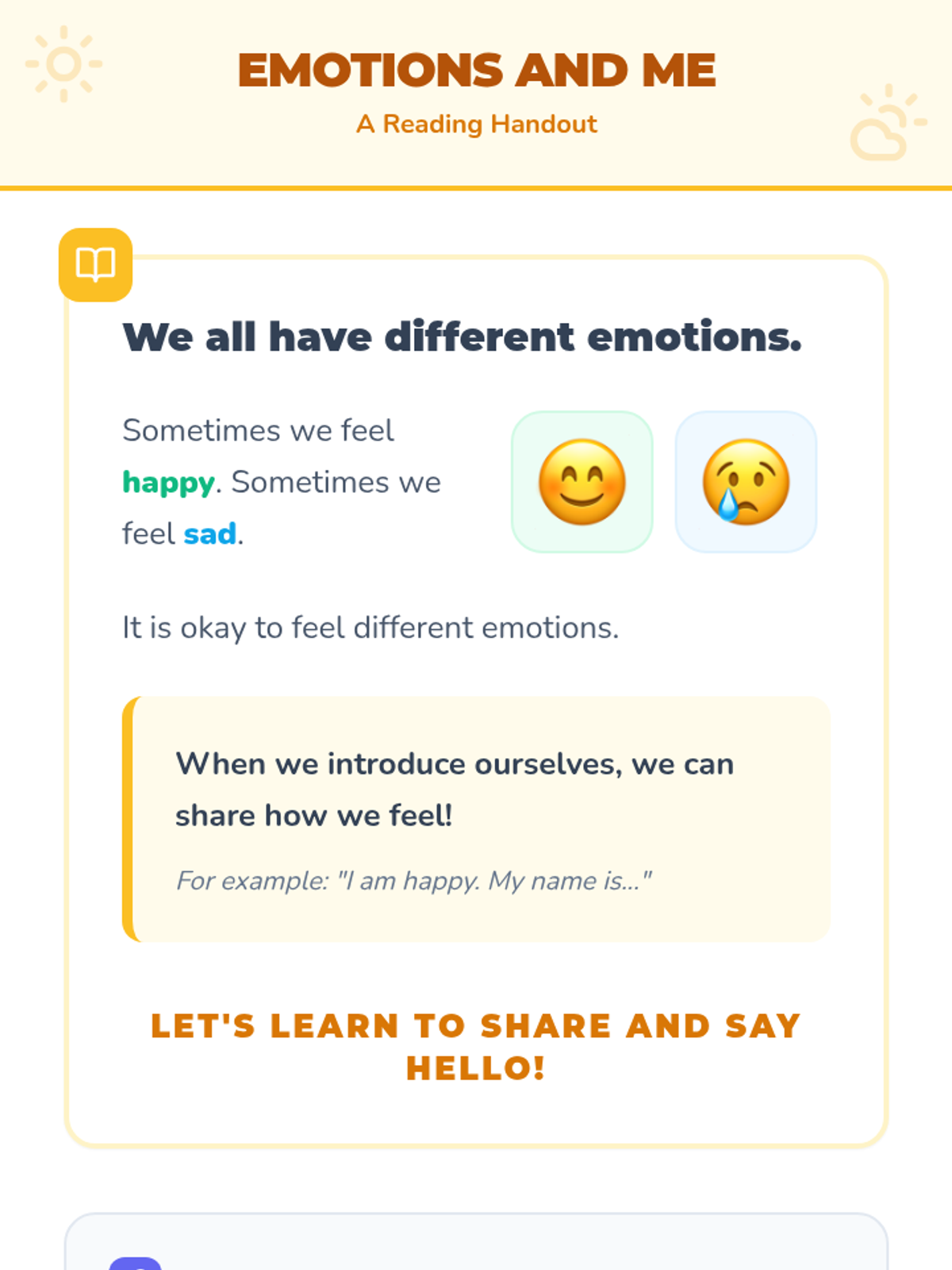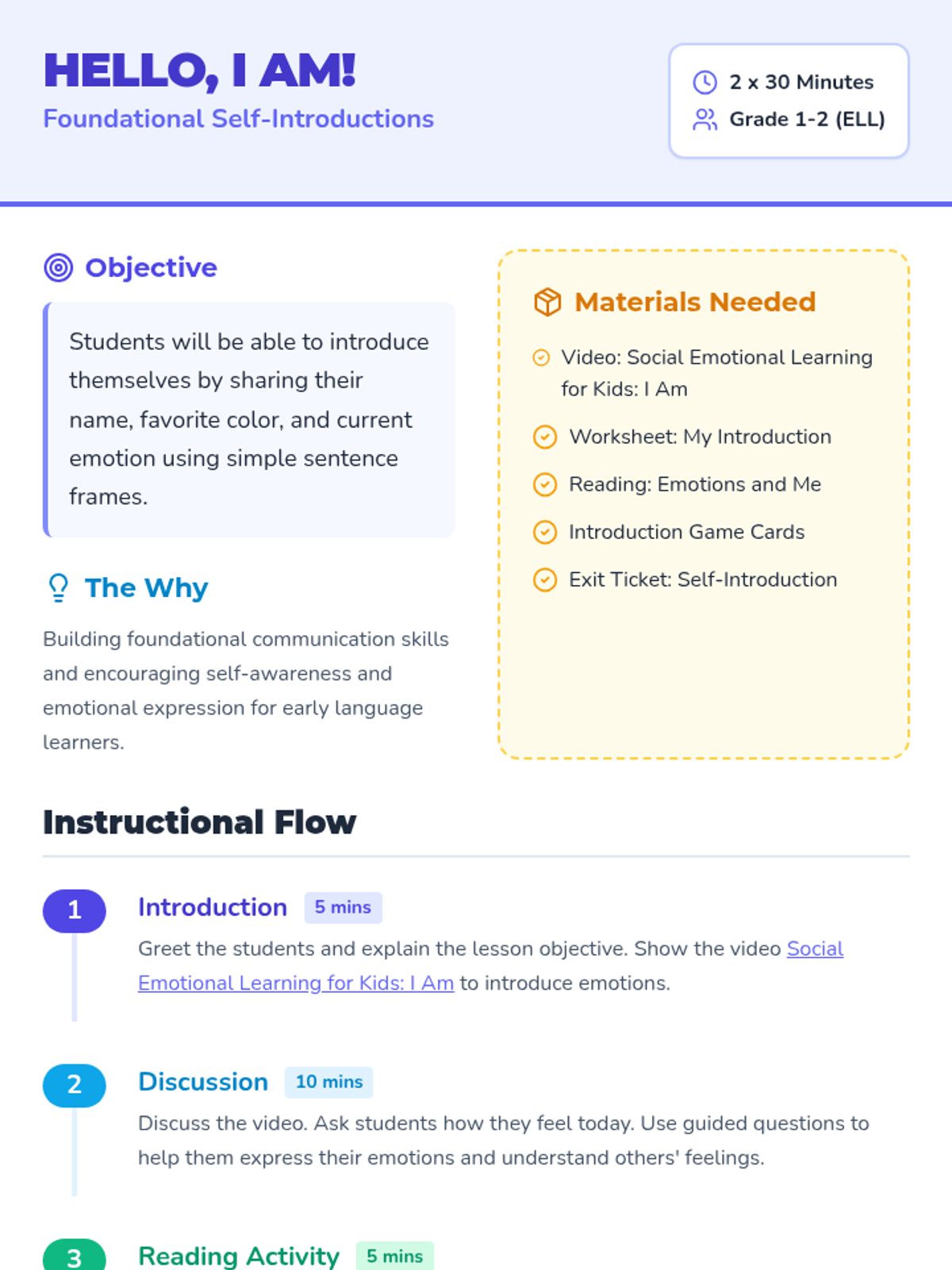 A foundational lesson for Grade 1 and 2 students with limited language ability to learn self-introductions and expressing emotions through video, reading, and interactive play.