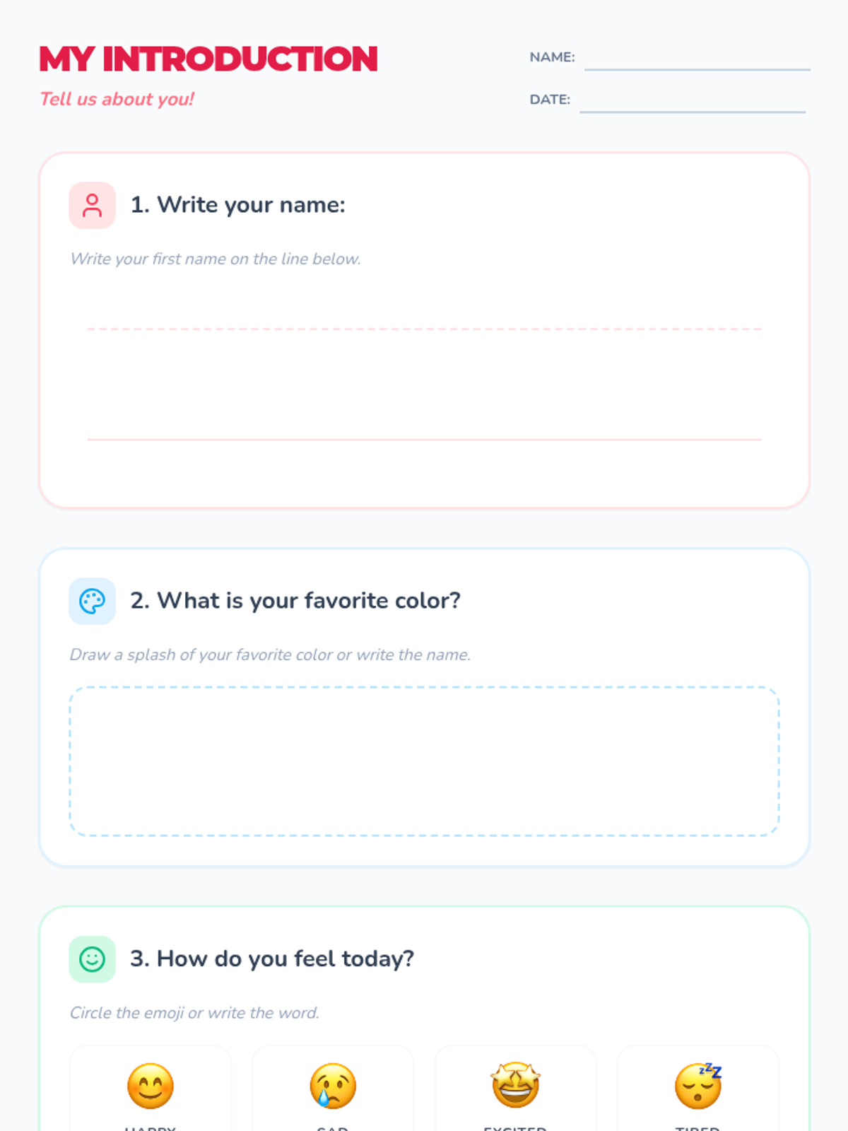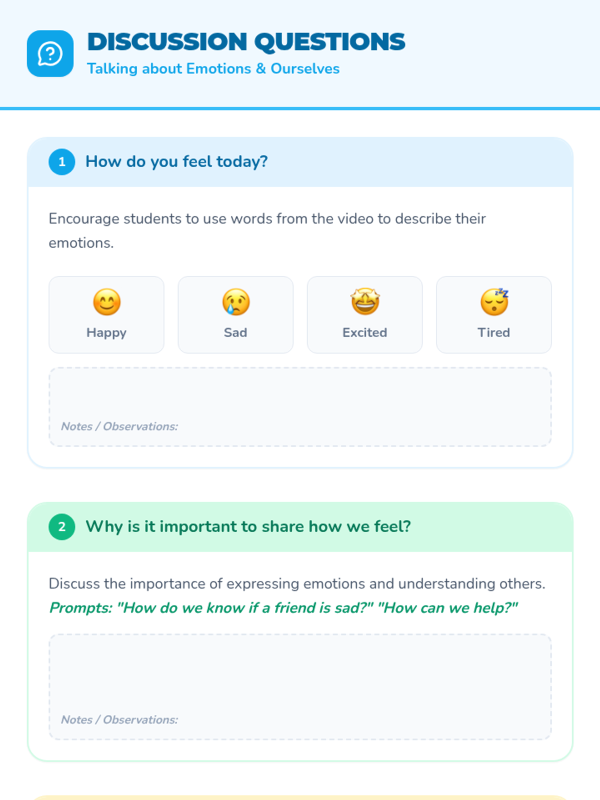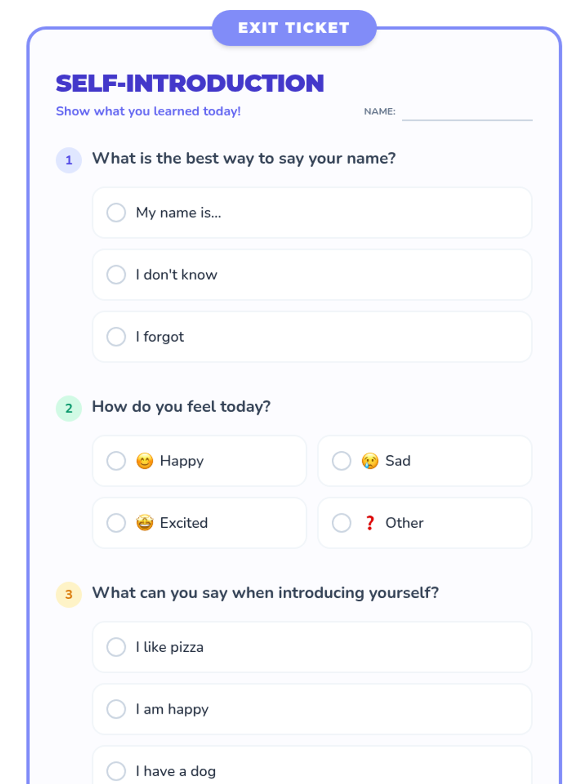 A foundational lesson for Grade 1 and 2 students with limited language ability to learn self-introductions and expressing emotions through video, reading, and interactive play.