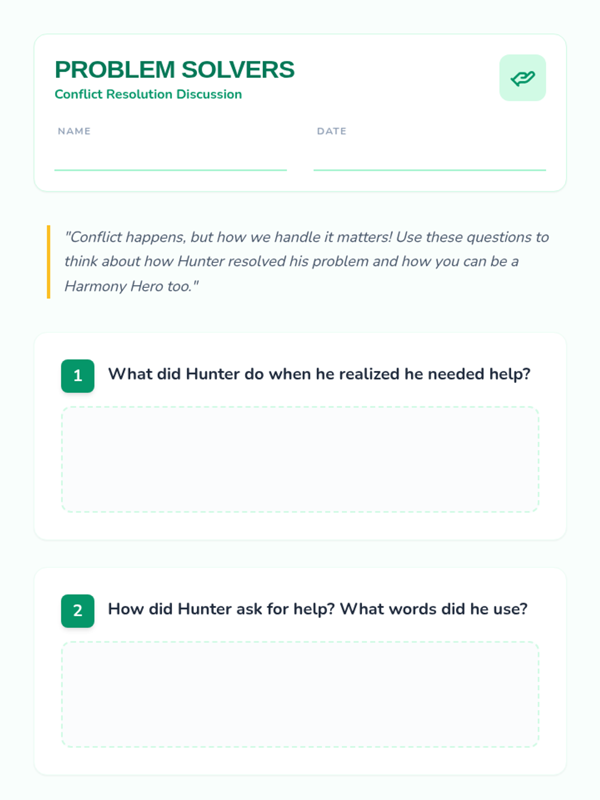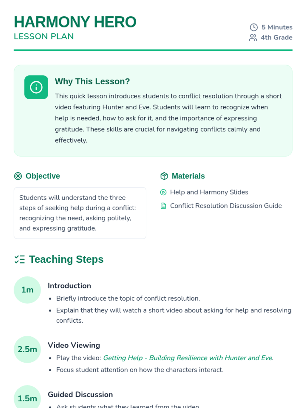 A quick 5-minute lesson for 4th graders on conflict resolution, focusing on asking for help, being polite, and expressing gratitude.
