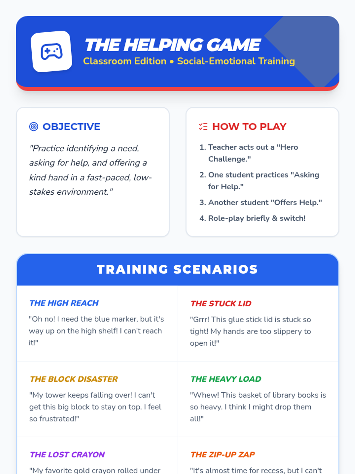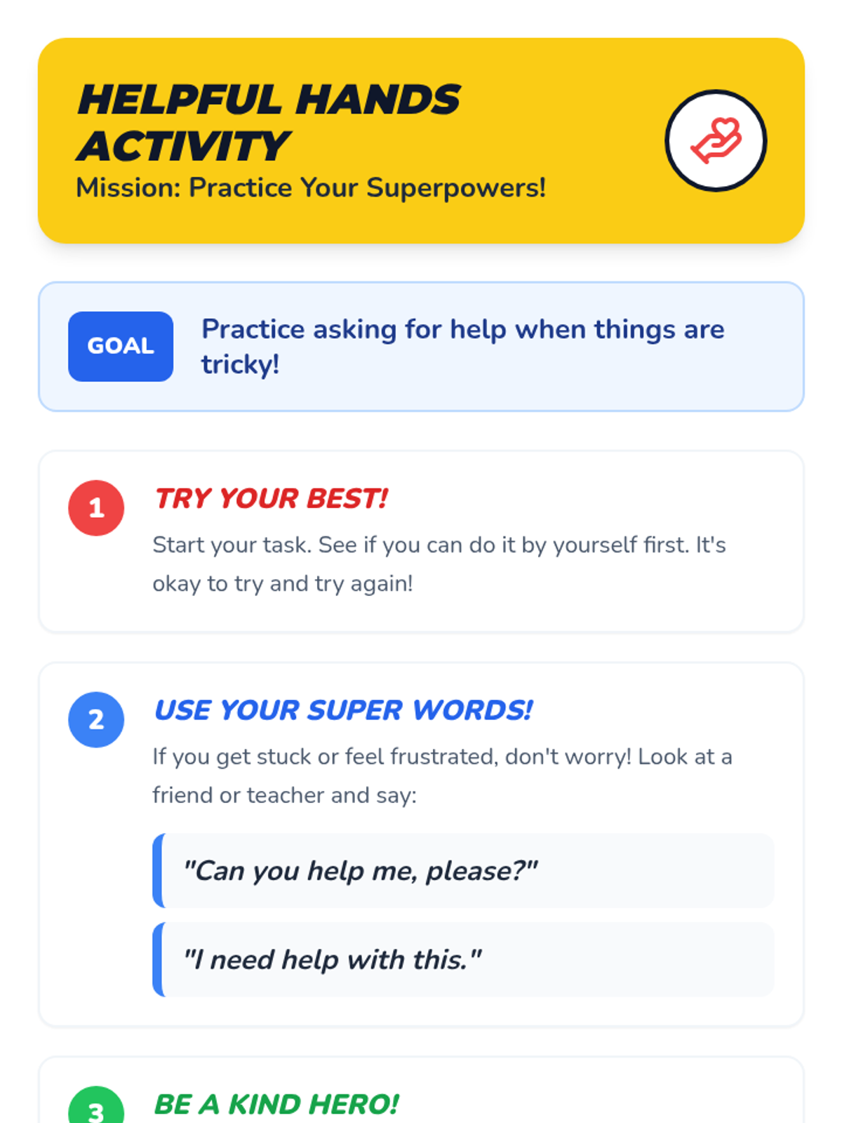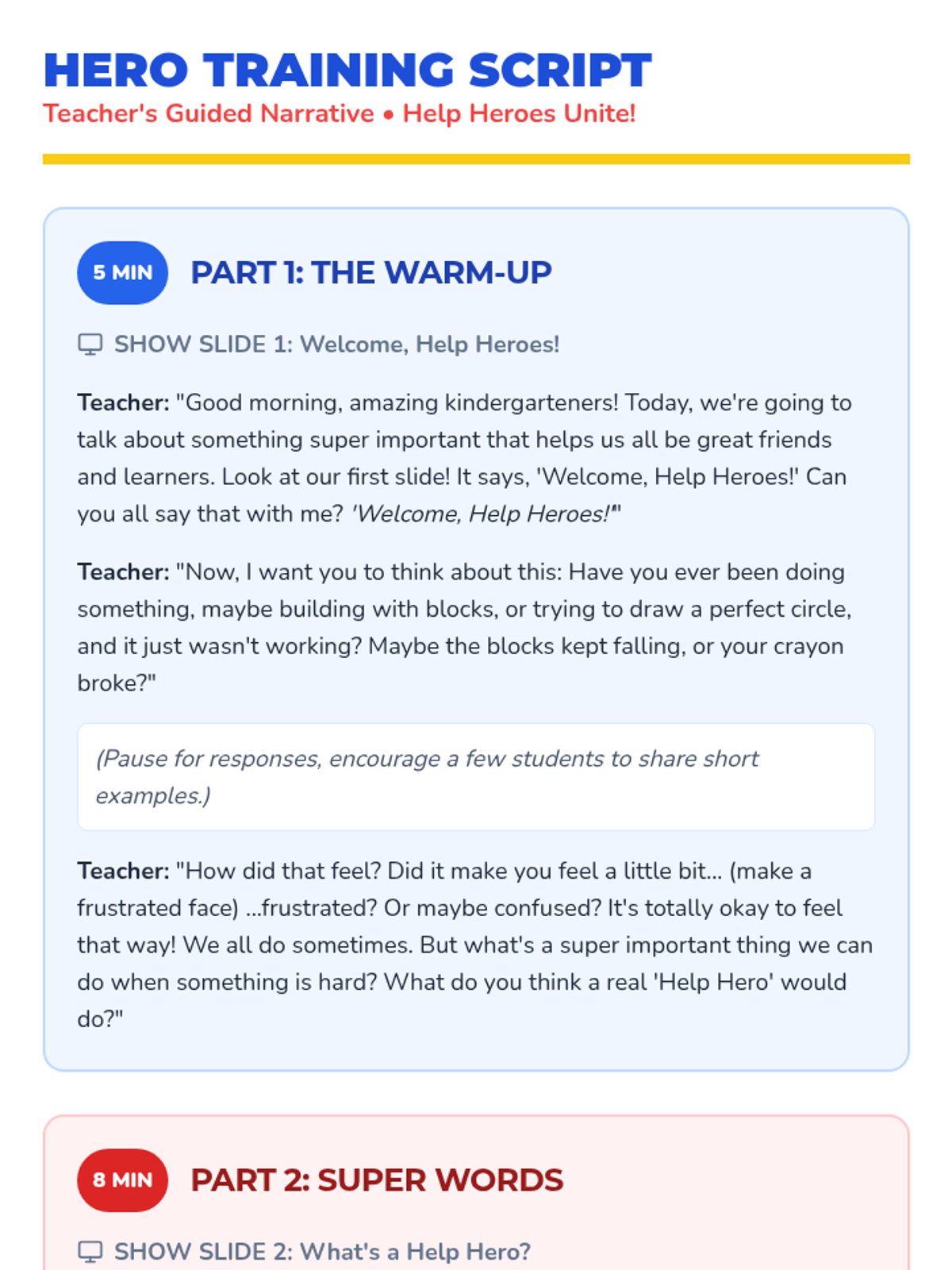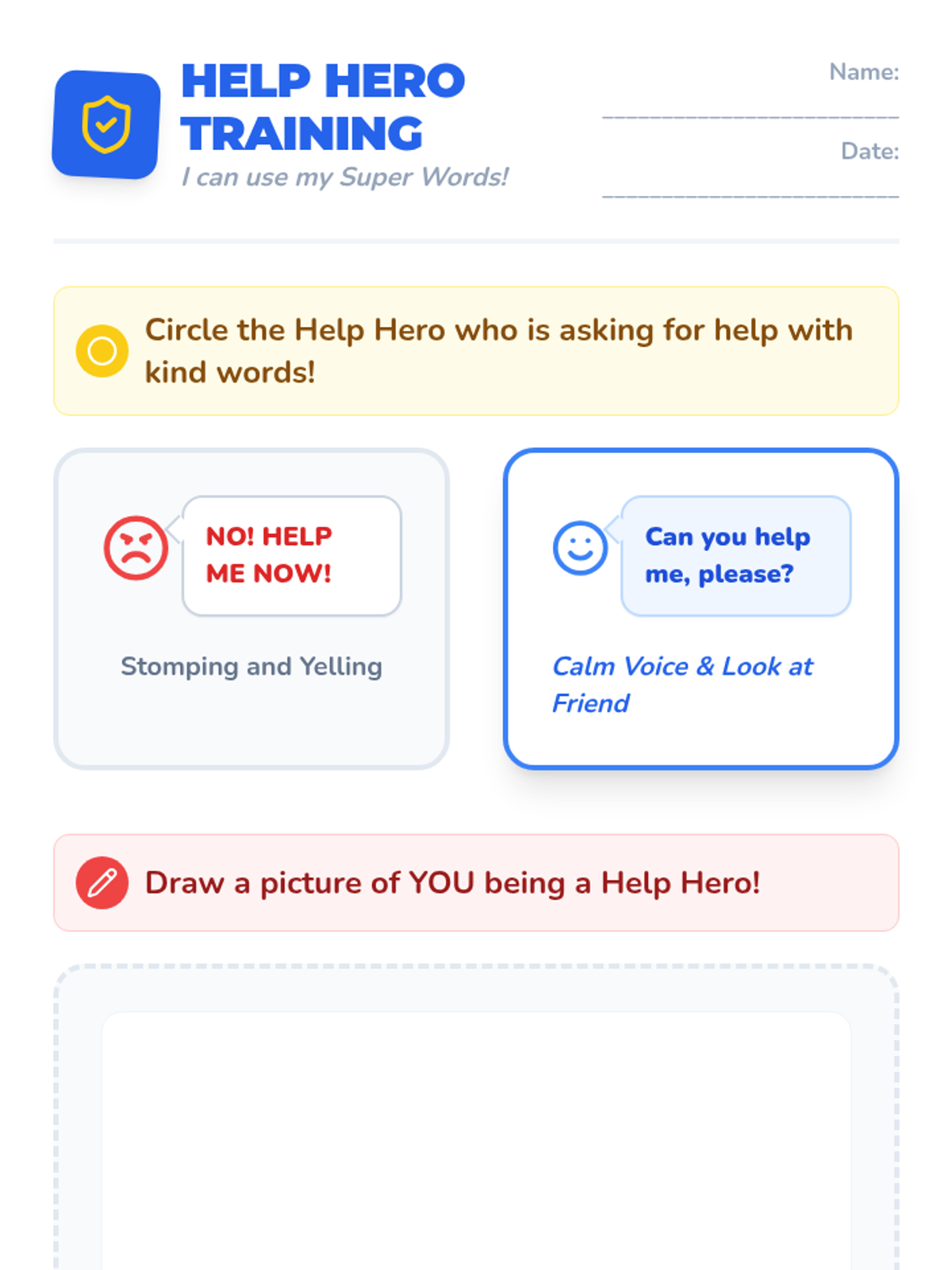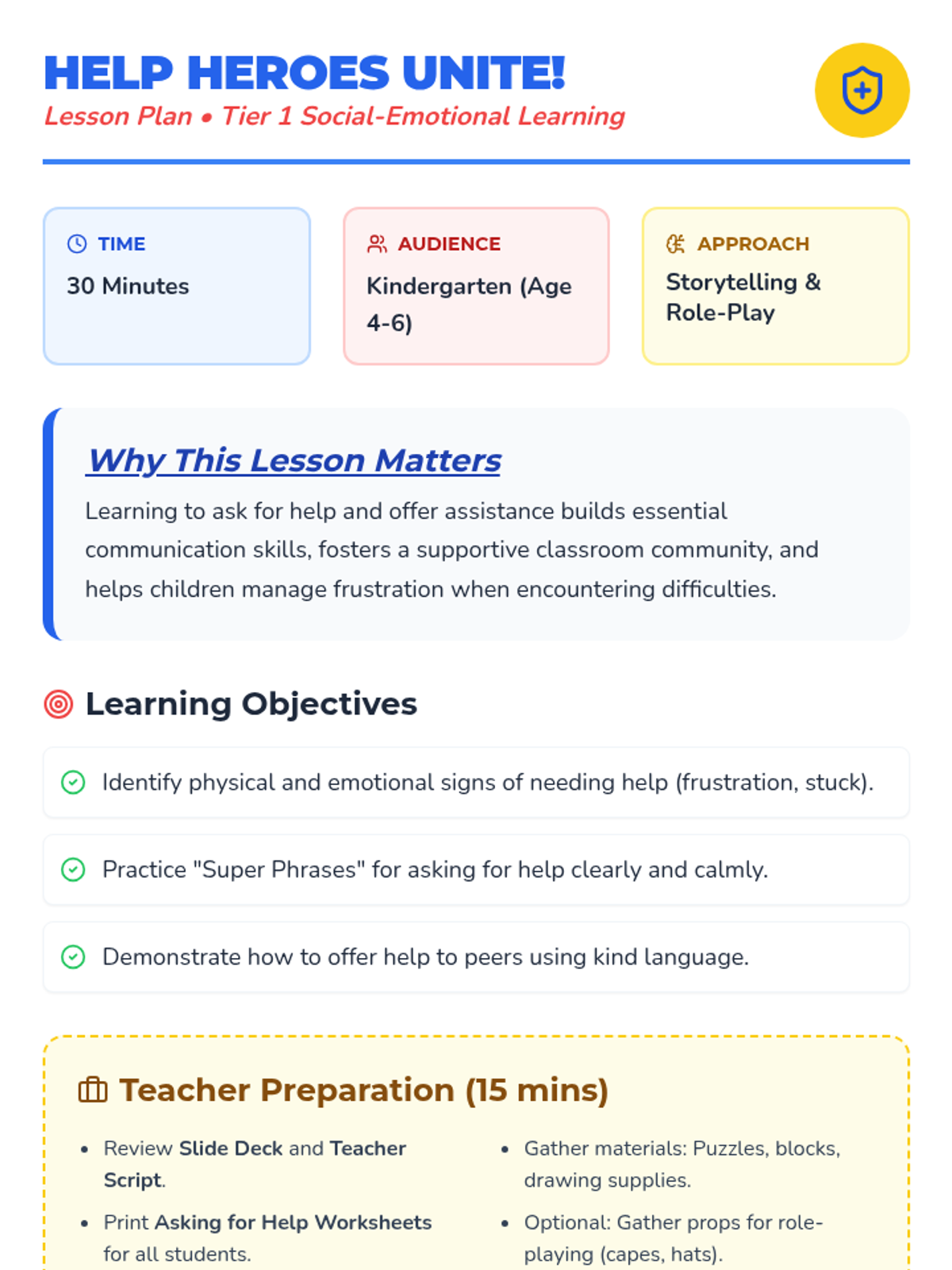 A 30-minute interactive lesson for Kindergarten students to learn the 'superpowers' of asking for help and offering assistance to others, fostering social-emotional skills and classroom community.