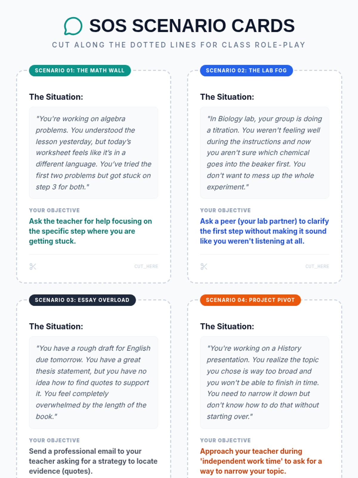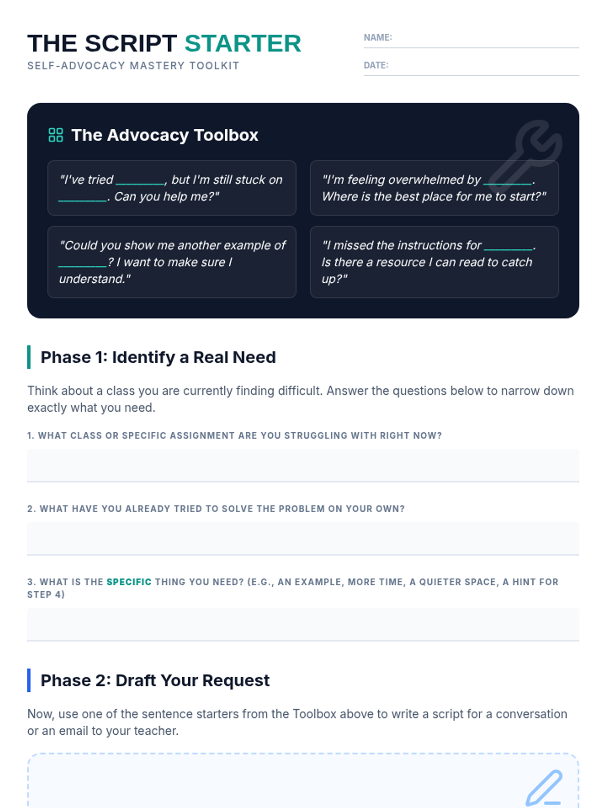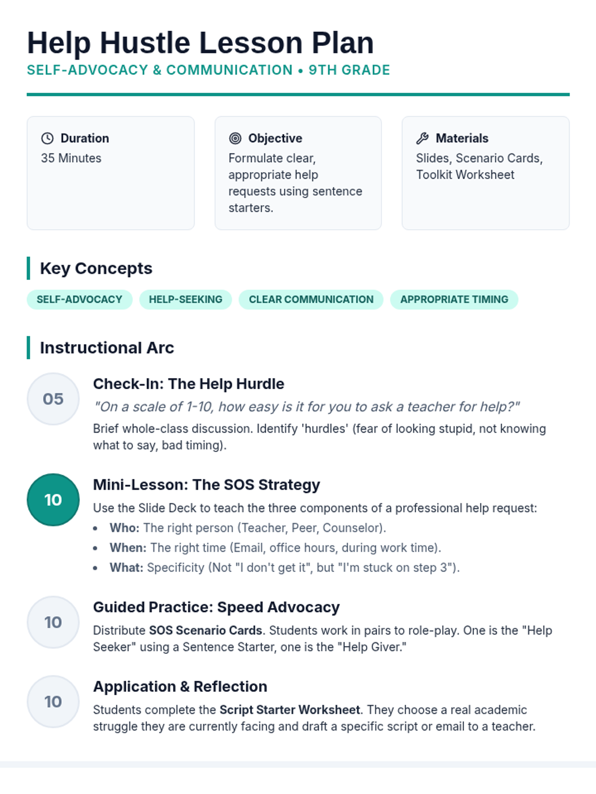 A 35-minute lesson for 9th graders focusing on self-advocacy and the mechanics of asking for help effectively using professional sentence starters.