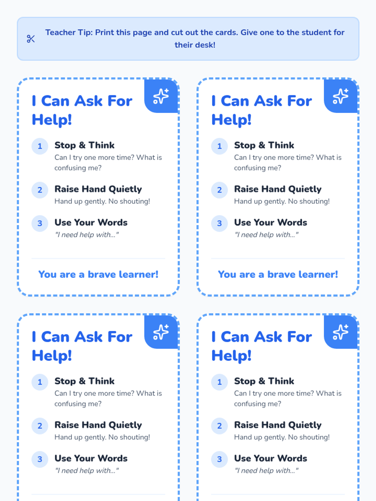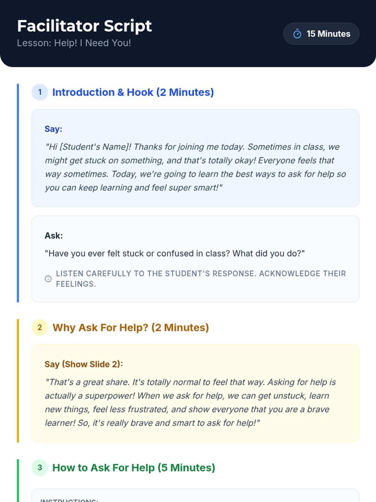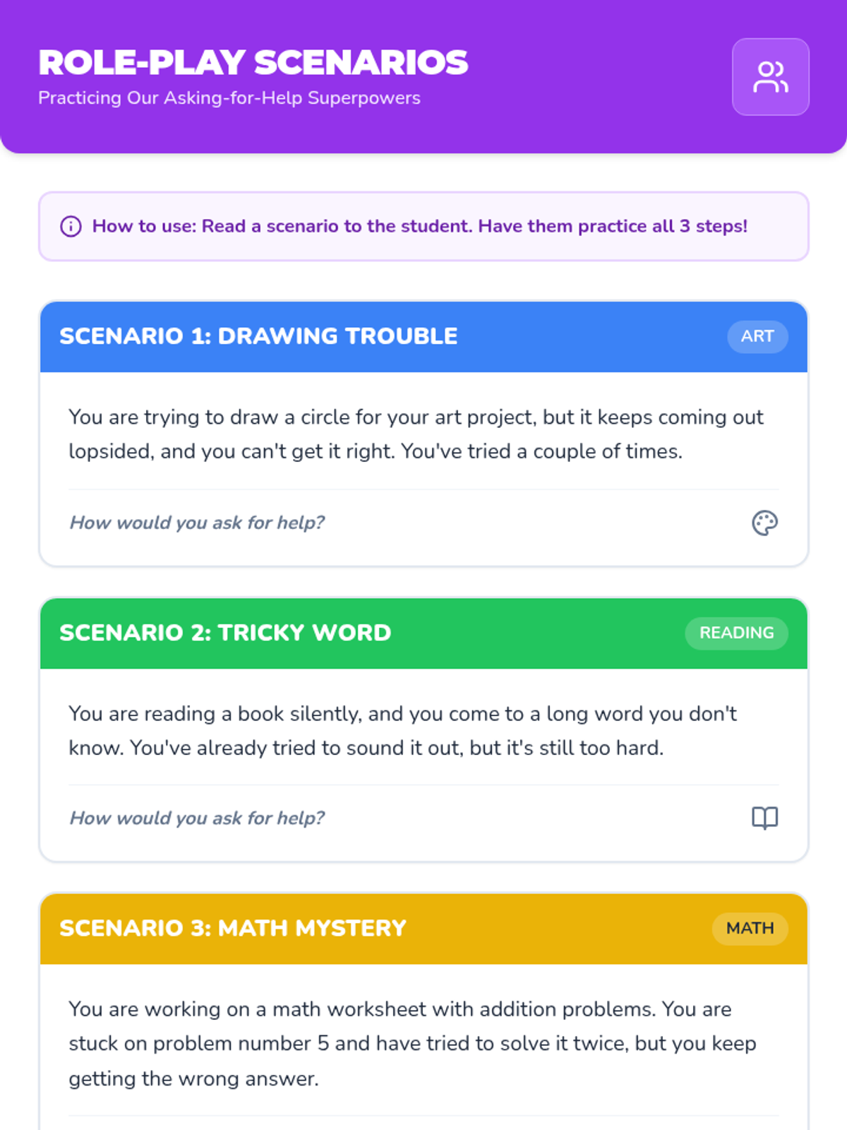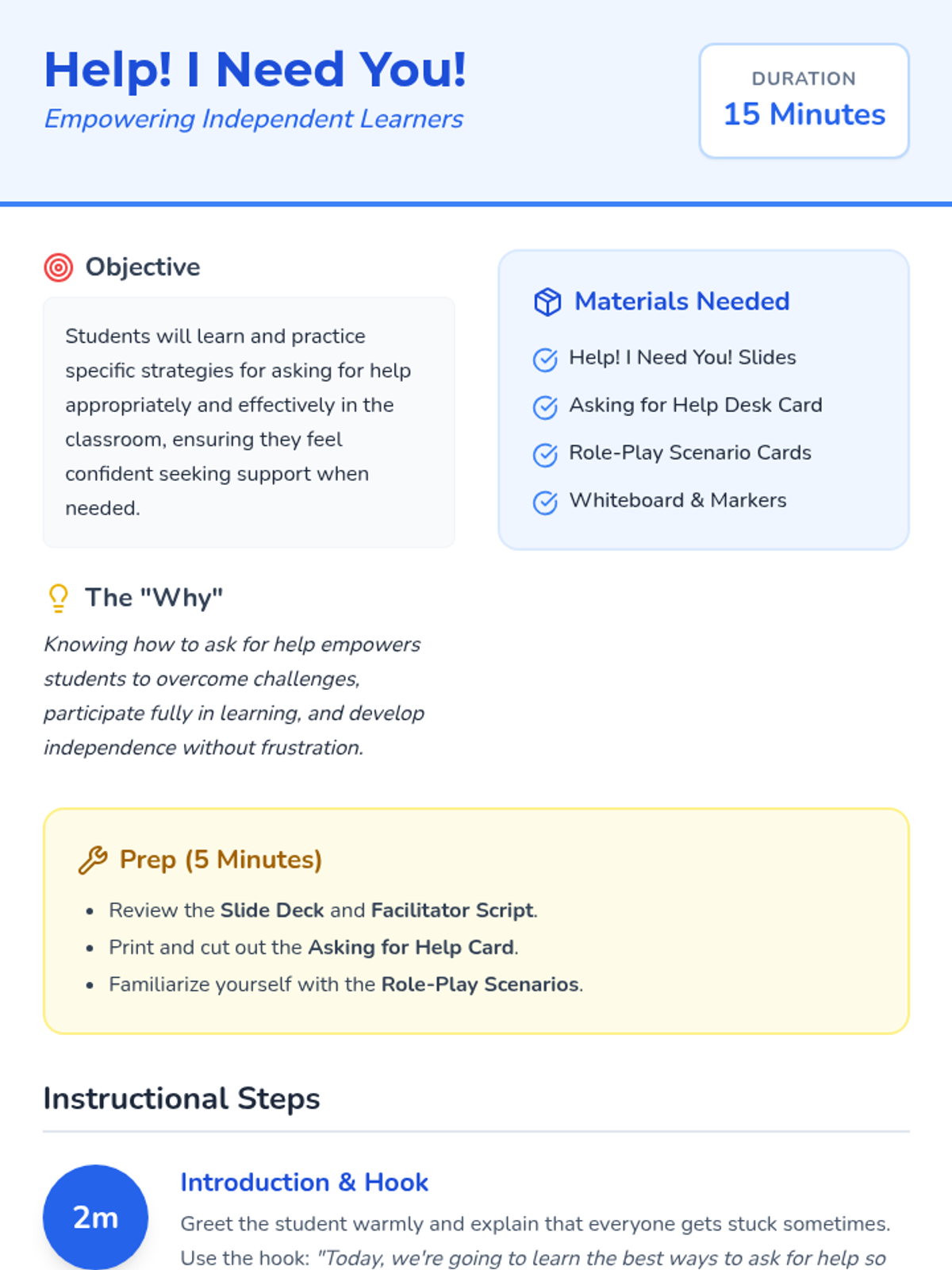 A 15-minute, one-on-one Tier 3 intervention for 1st-grade students to learn and practice effective, appropriate strategies for seeking help in the classroom.