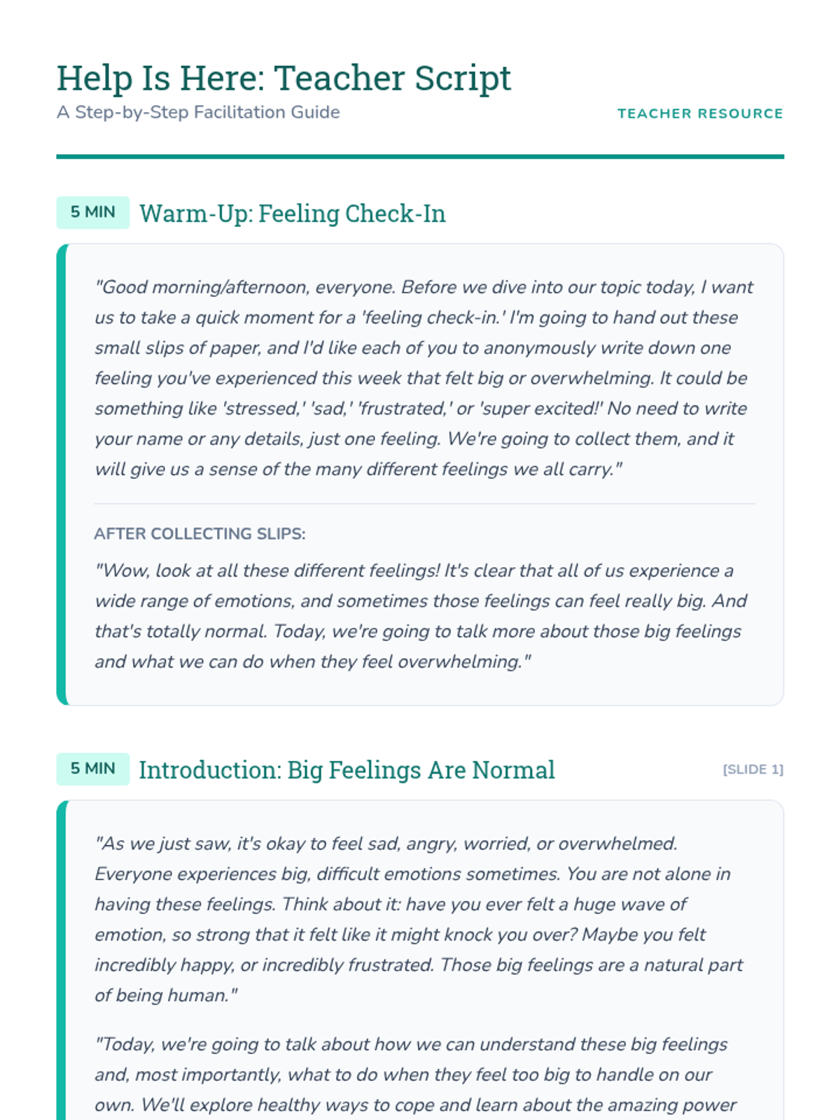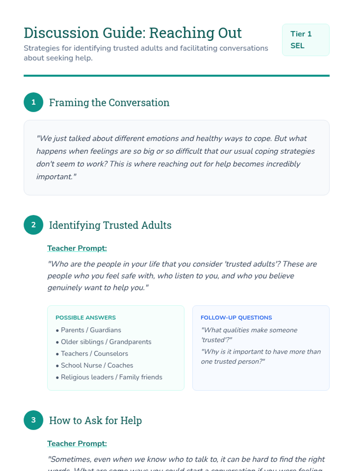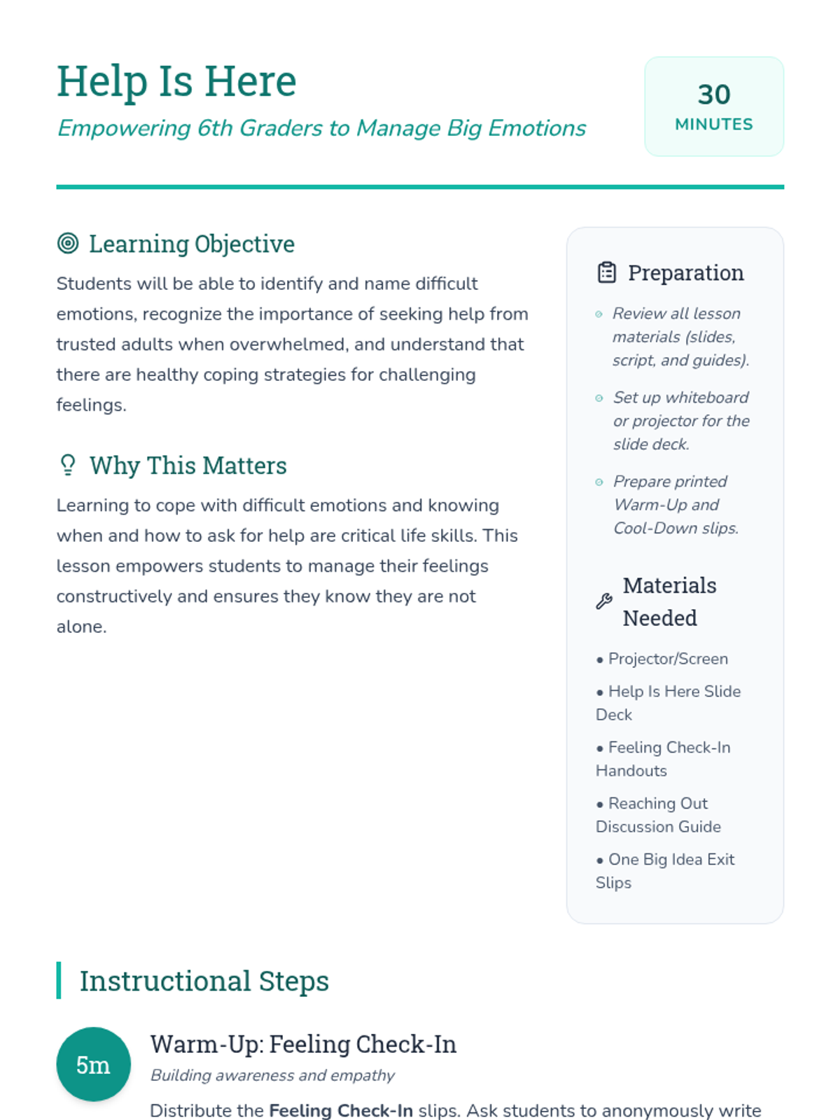 A 30-minute lesson for 6th graders on identifying difficult emotions, practicing healthy coping strategies, and reaching out to trusted adults for support.
