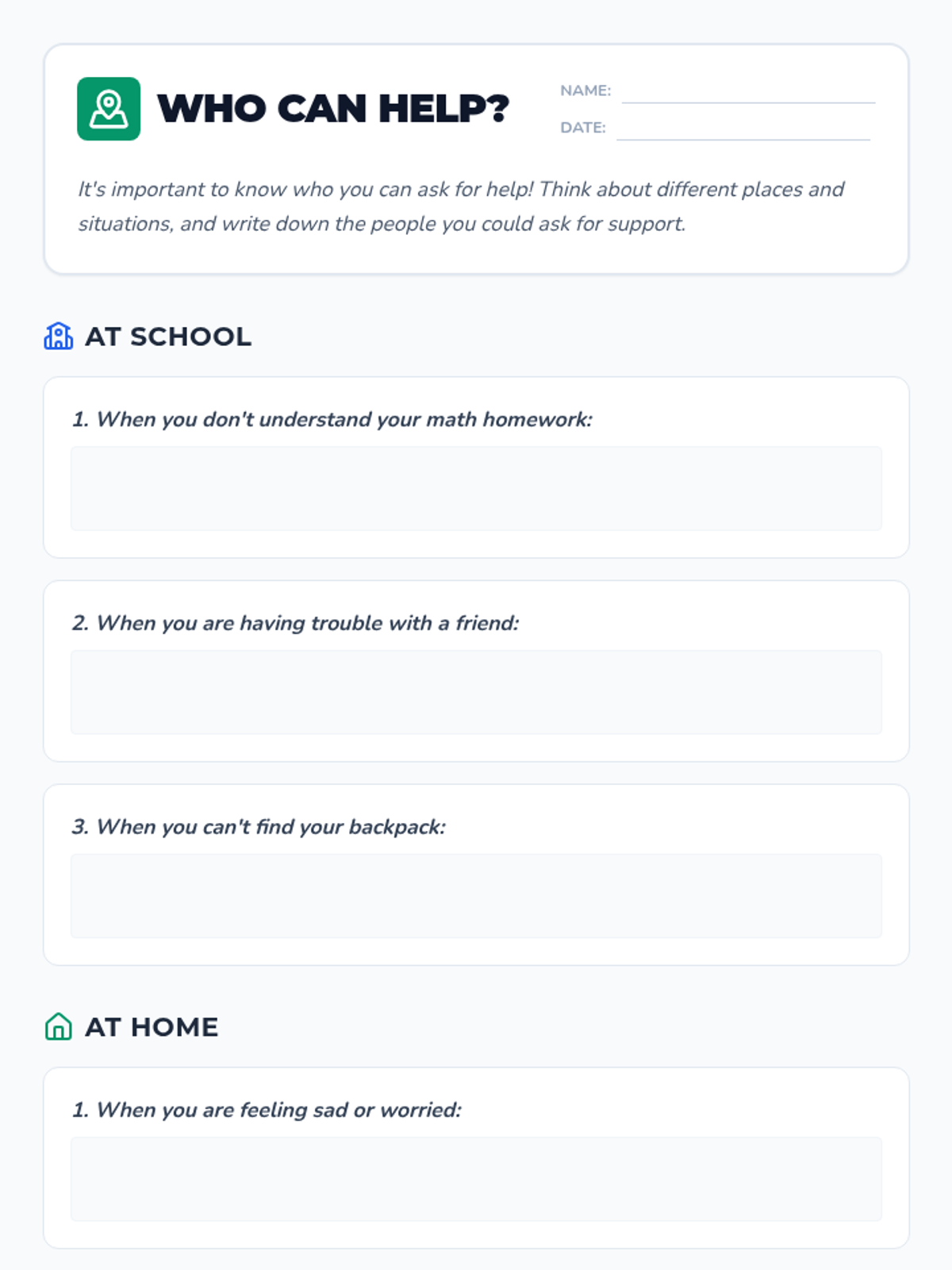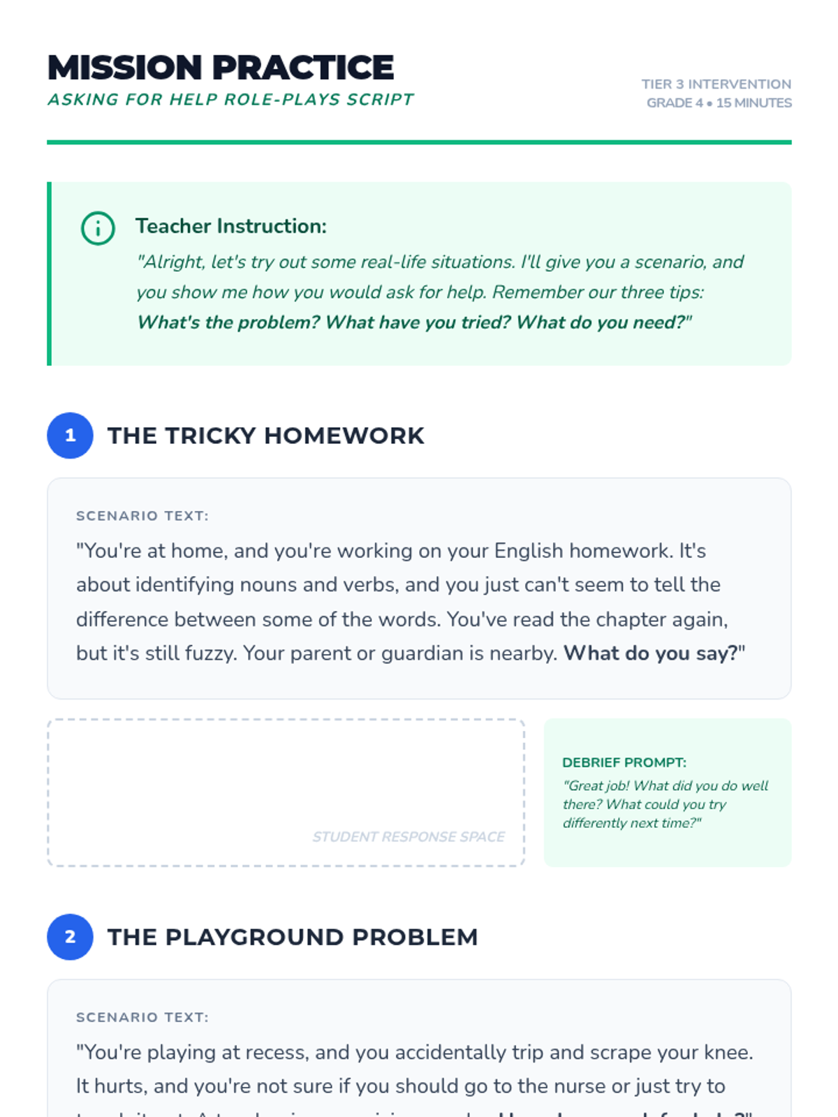 A 40-minute Tier 3 lesson for 4th graders on how to confidently and clearly ask for help. Through discussion, role-plays, and activities, students learn that seeking support is a strength and gain practical tools for self-advocacy.