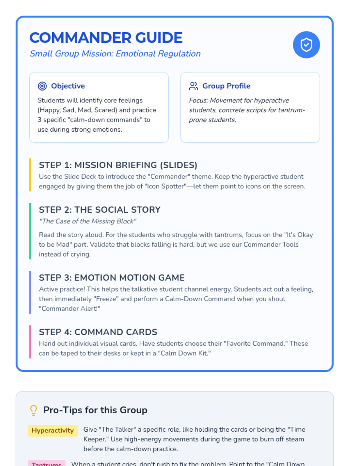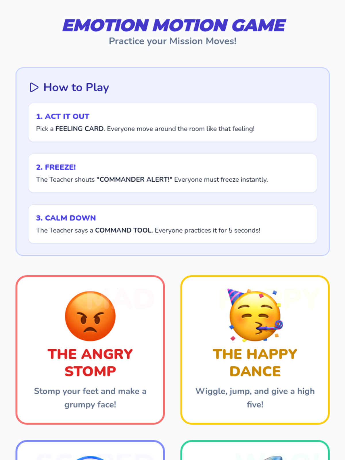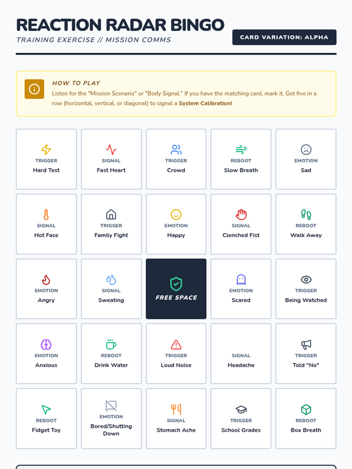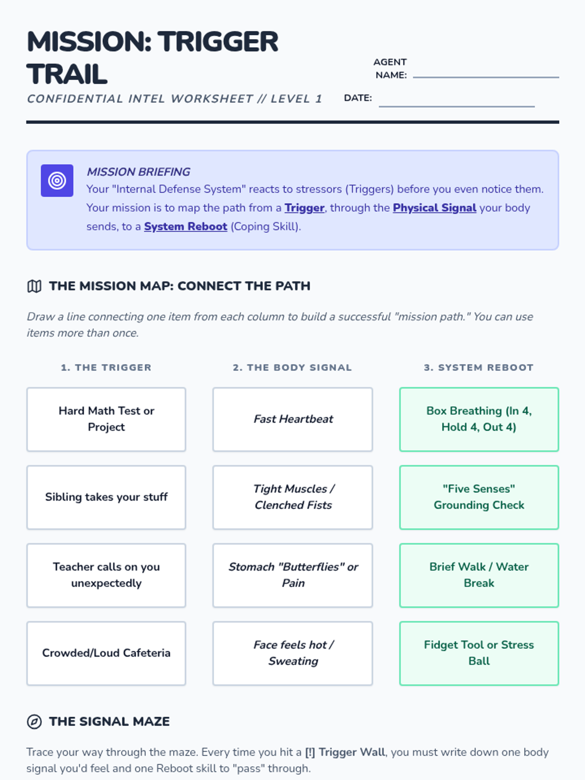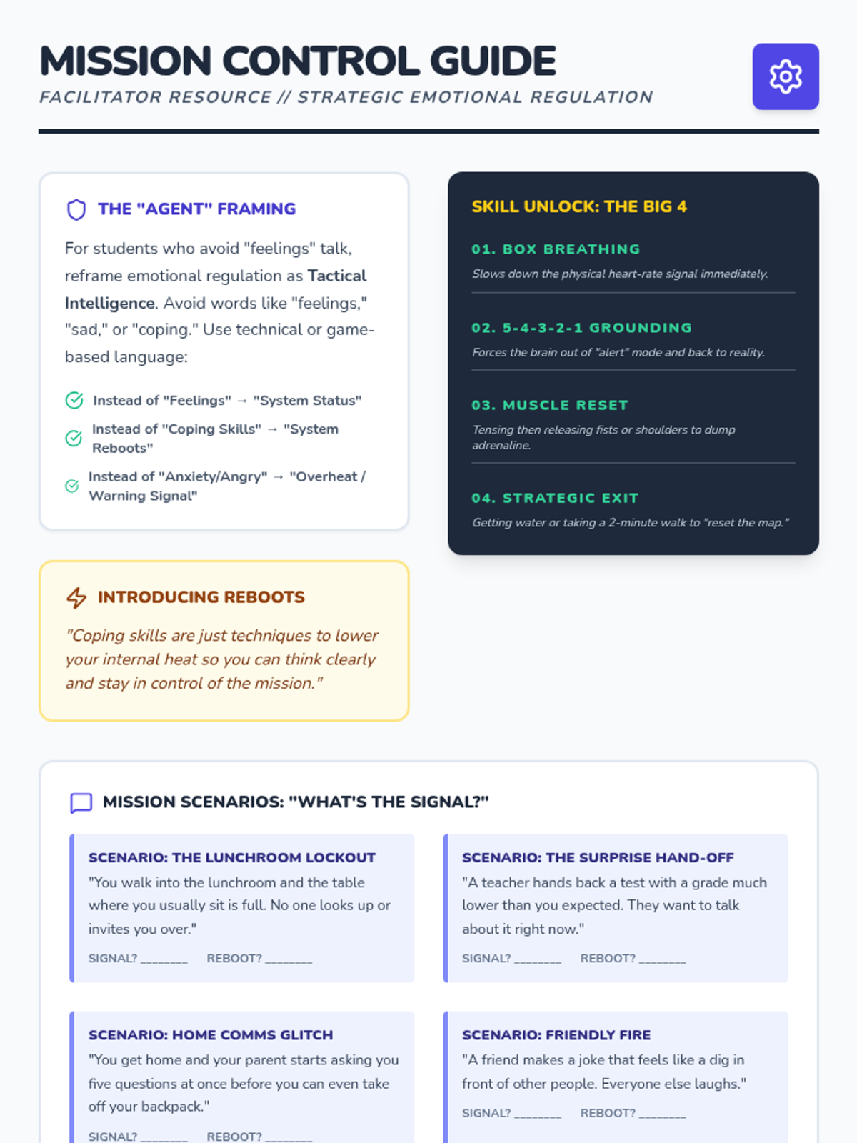 A game-based approach to identifying emotional triggers and introducing coping skills for middle school students who may be resistant to traditional talk therapy. This lesson uses a 'Mission Briefing' theme to frame emotional regulation as a tactical skill.