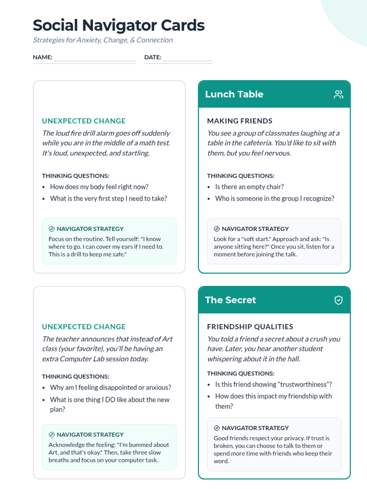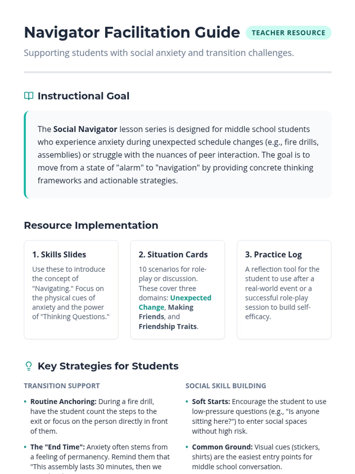 A set of resources designed to help 6th grade students navigate social anxiety, unexpected changes like fire drills, and the nuances of building healthy friendships.