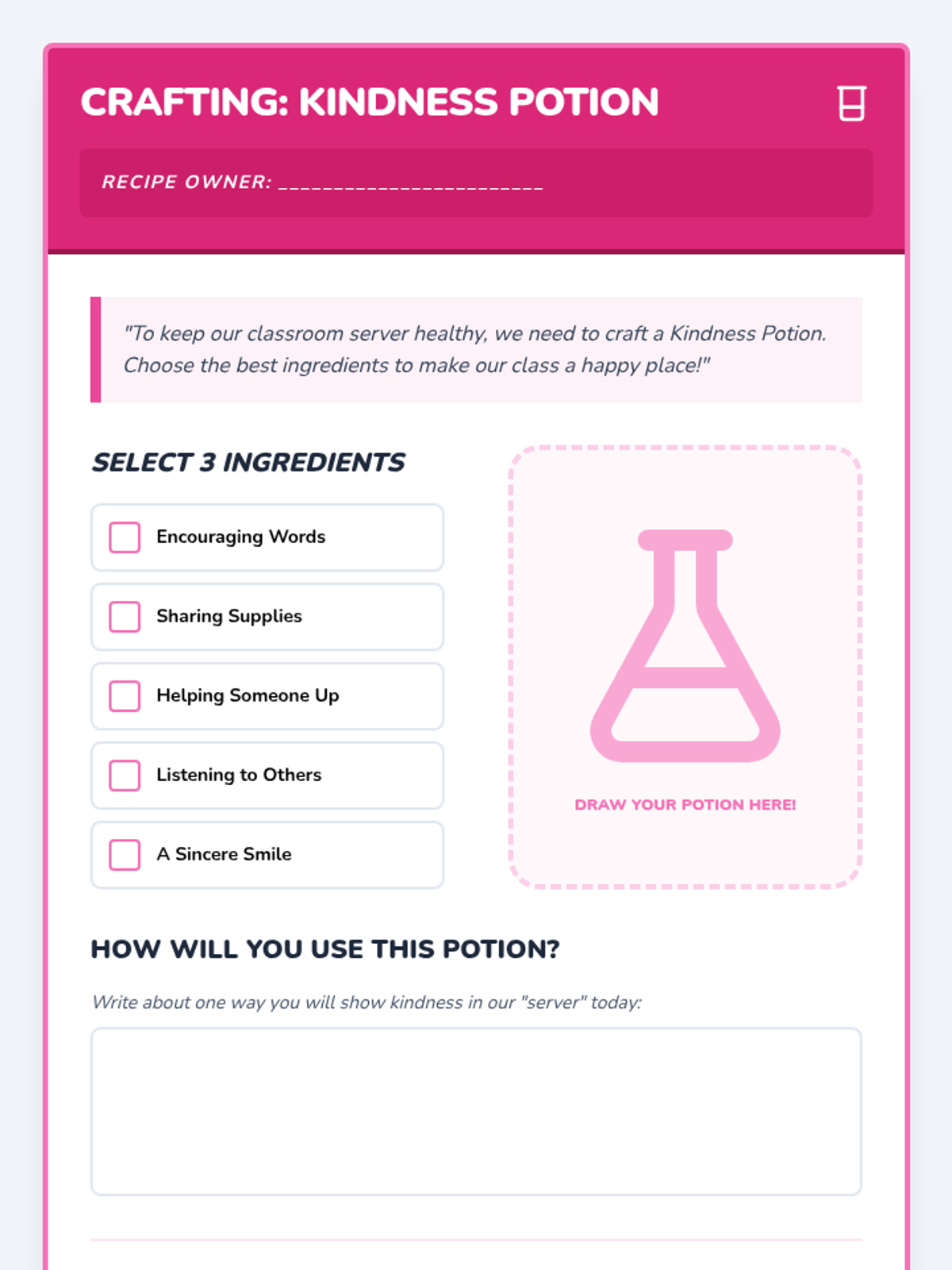 A celebration of the quest. Students reflect on their learning and commit to being 'Kindness Champions' in their daily lives.