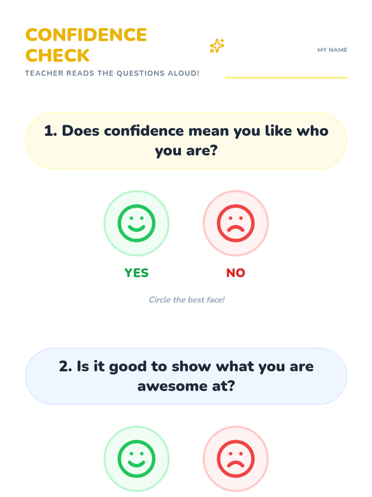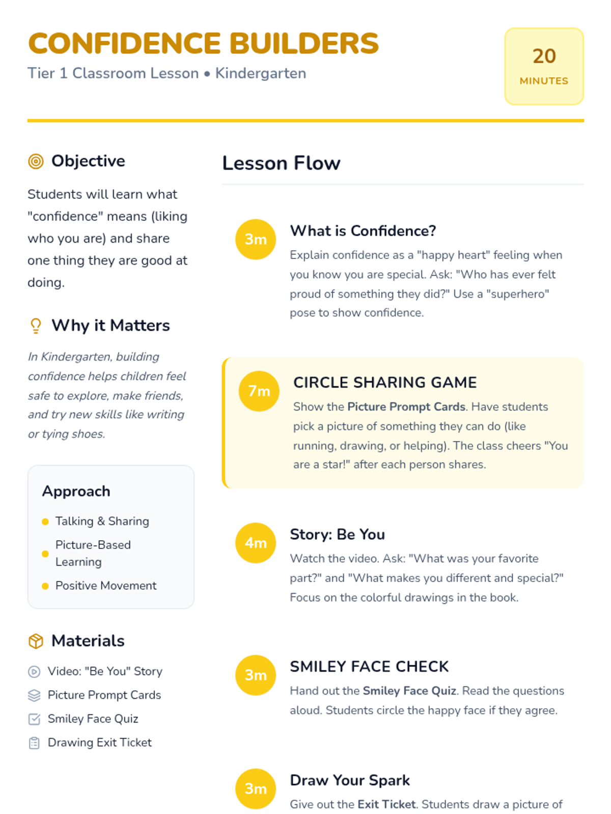 A 20-minute lesson for kindergarteners focused on building self-esteem and confidence through a collaborative game, a video story, and personal reflection. Students learn to identify their unique strengths and practice positive self-talk.