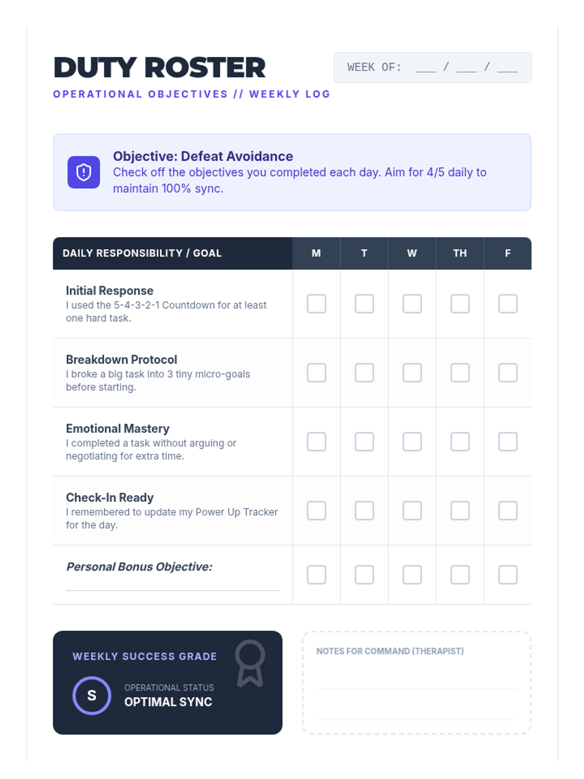 A comprehensive therapy toolkit designed for a middle school student to address avoidance of non-preferred demands. This lesson includes a collaborative contract, a visual progress tracker, and a responsibility checklist to foster accountability and skill-building.