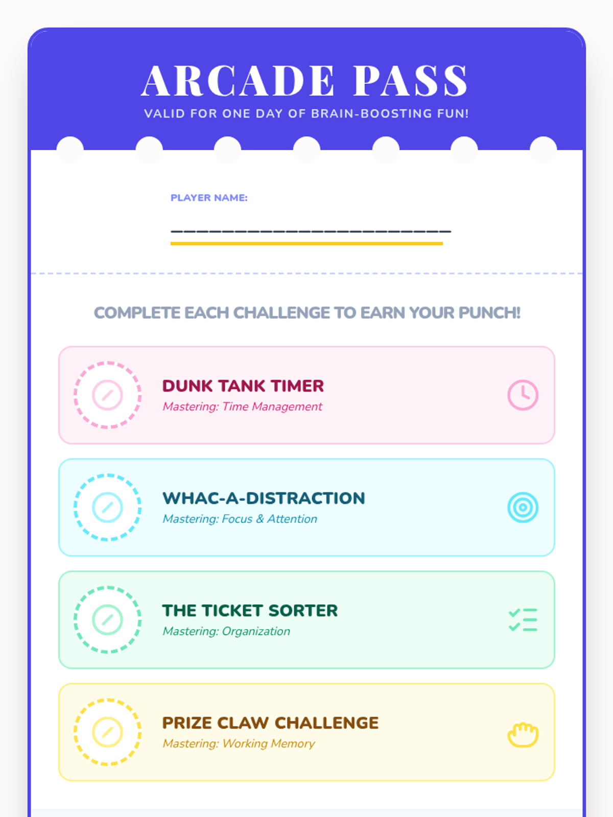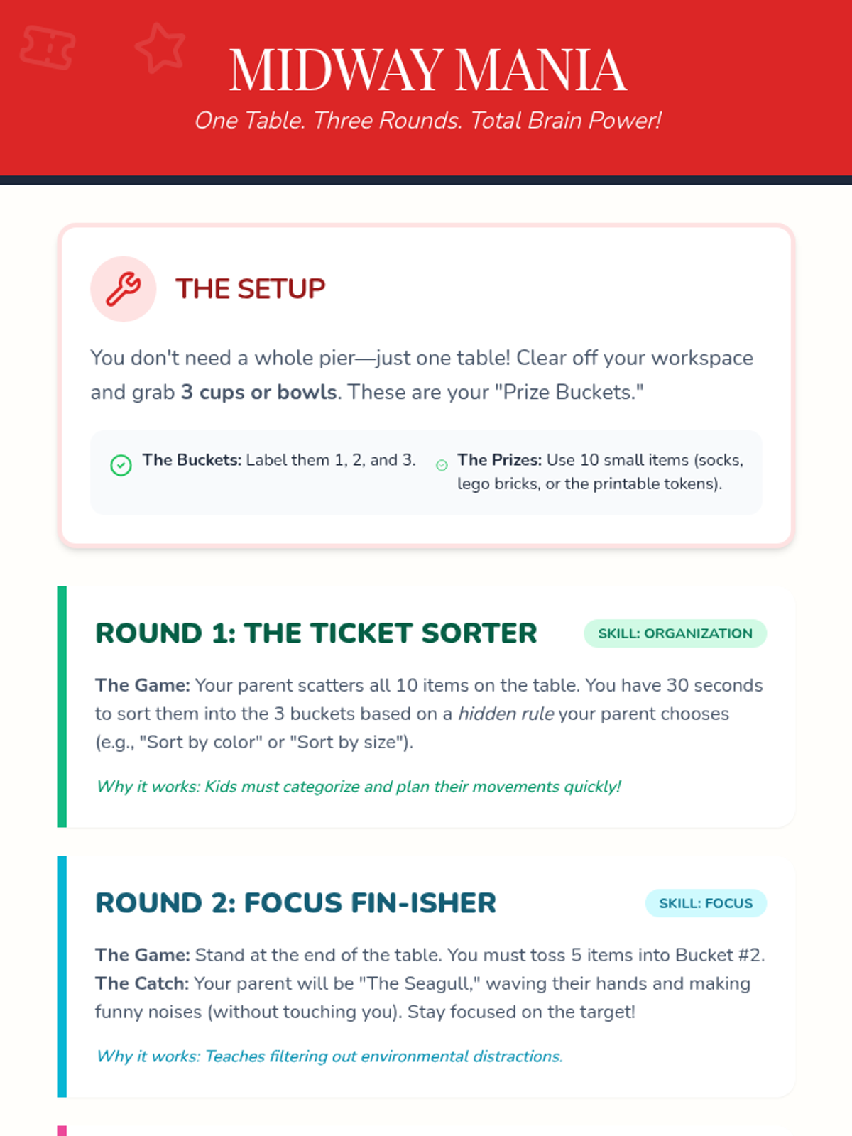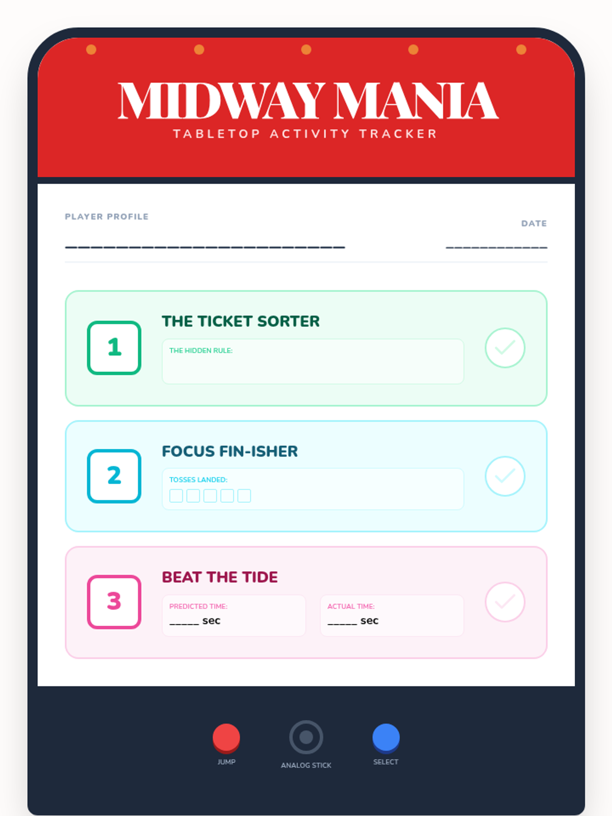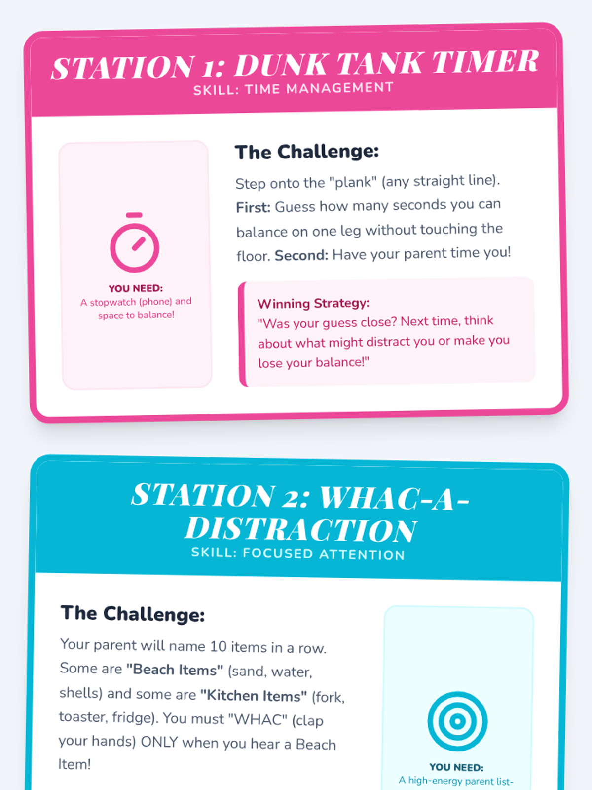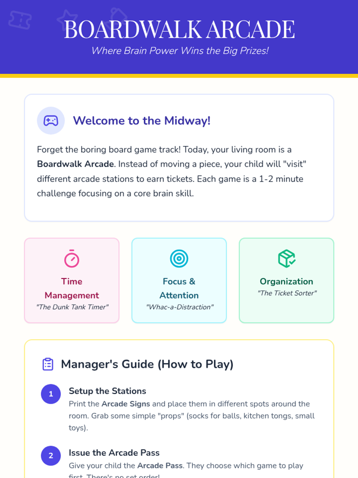 A fun, boardwalk-themed game for K-5 students and parents to practice executive functioning skills like time management, focus, and organization.