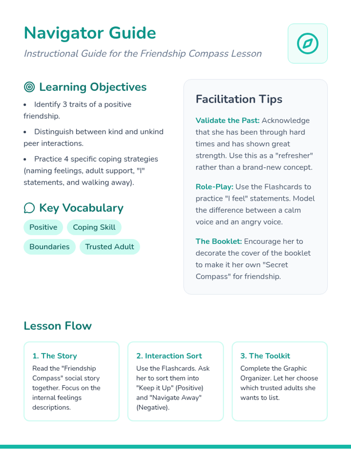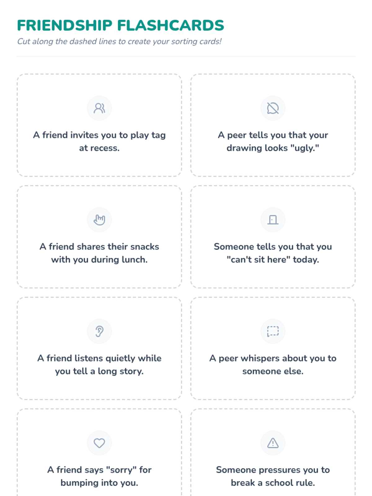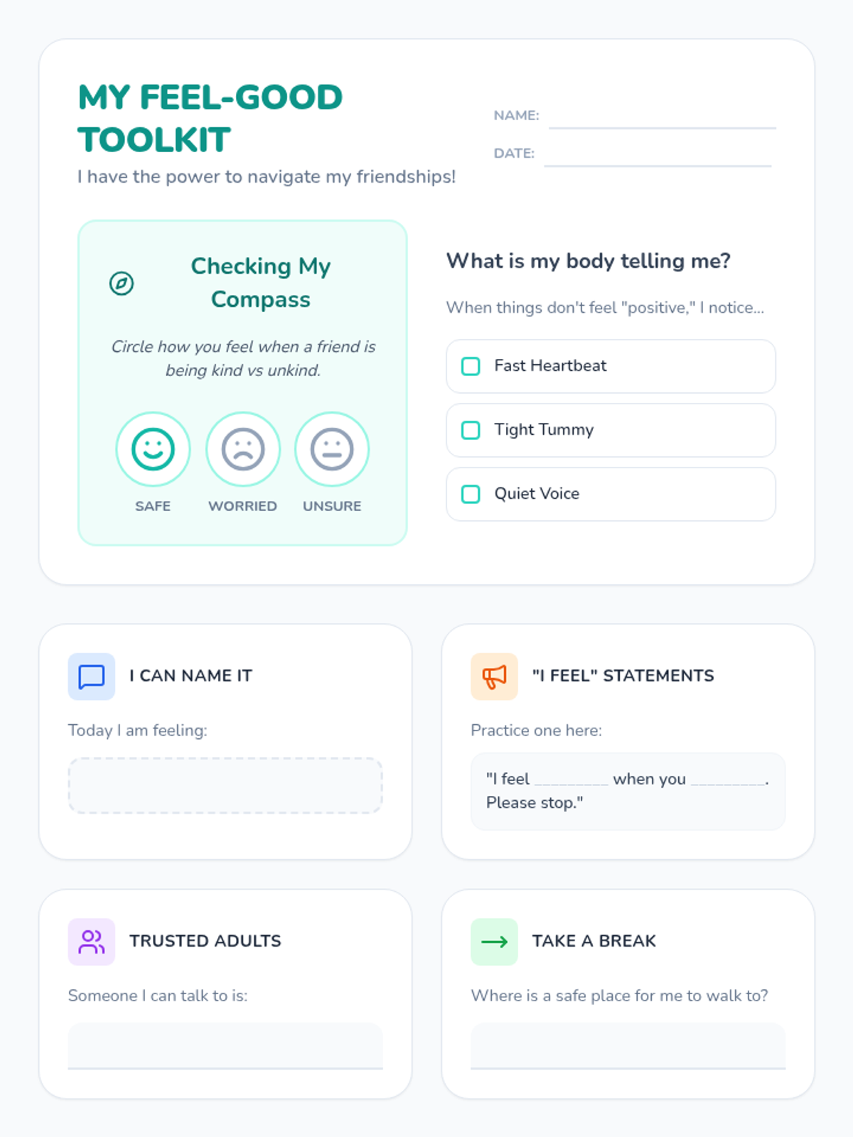 This lesson helps a 3rd-grade student distinguish between positive and negative peer relationships while building a toolkit of coping strategies for difficult social situations. It focuses on validating past experiences and empowering the student with 'I feel' statements and self-regulation techniques.