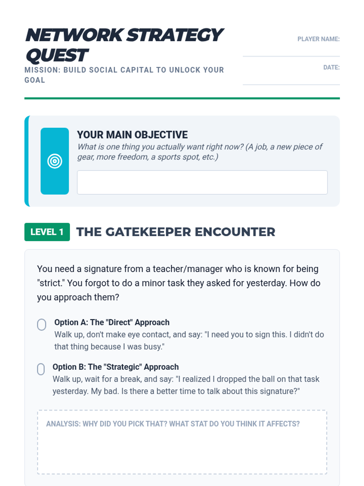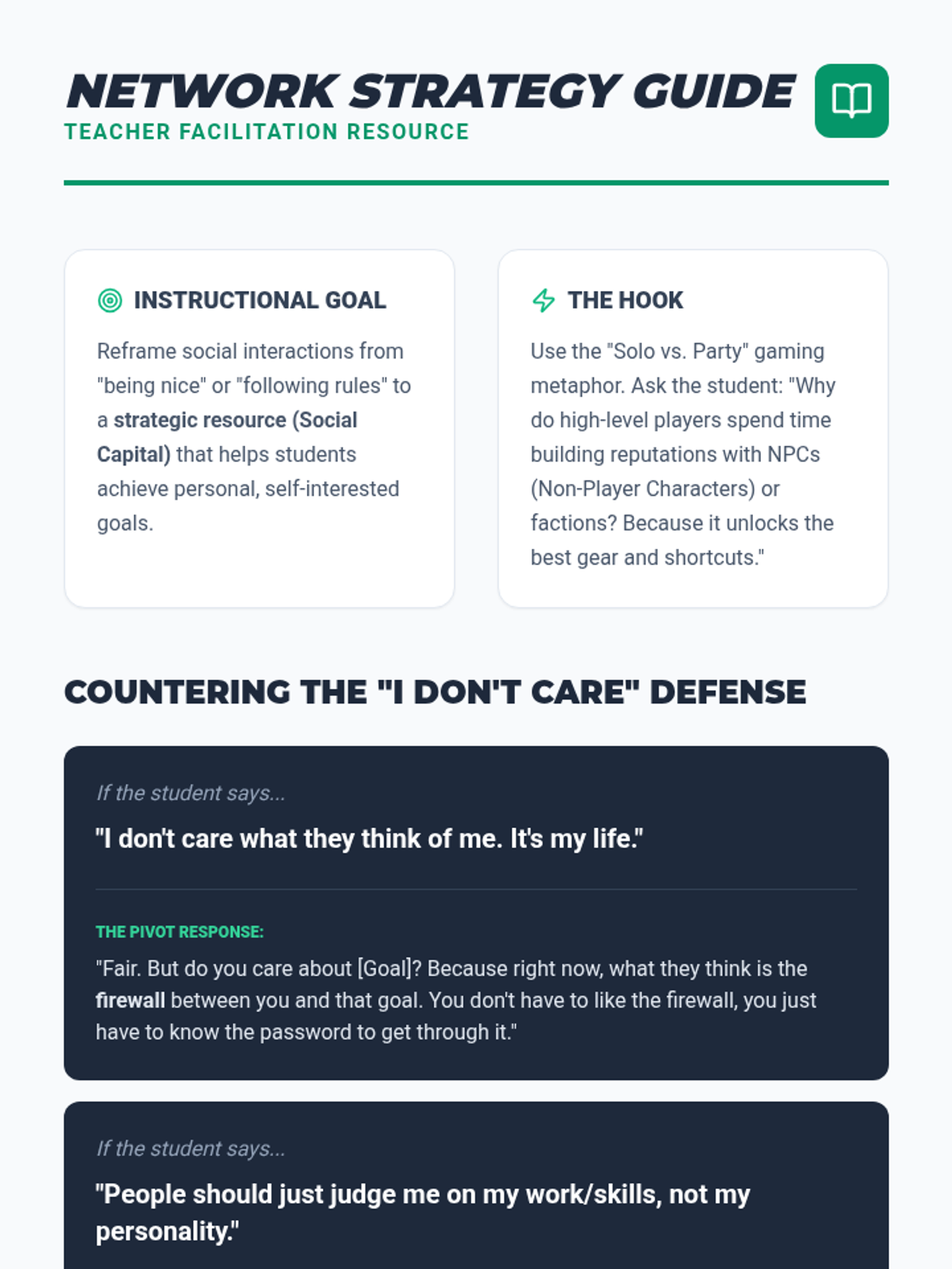 A high-impact lesson for students who may be skeptical of social norms, reframing social relationships as a strategic 'Social Capital' that helps unlock personal goals and shortcuts in life.