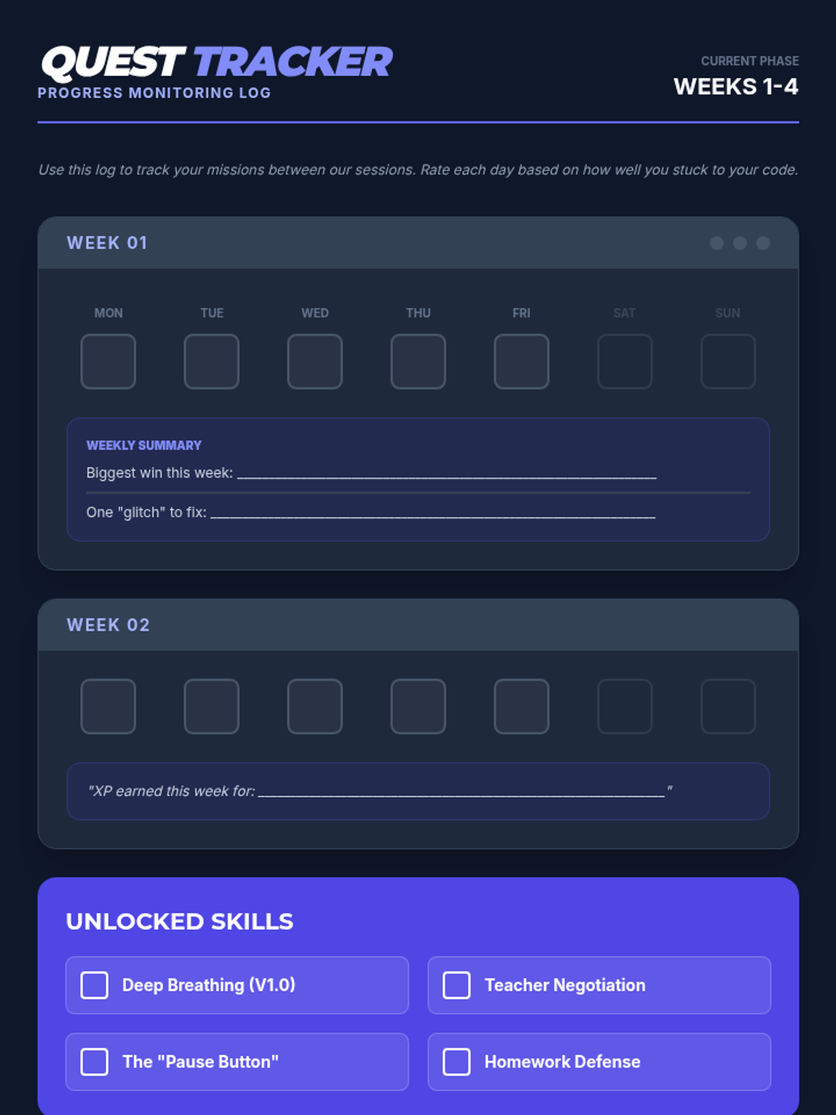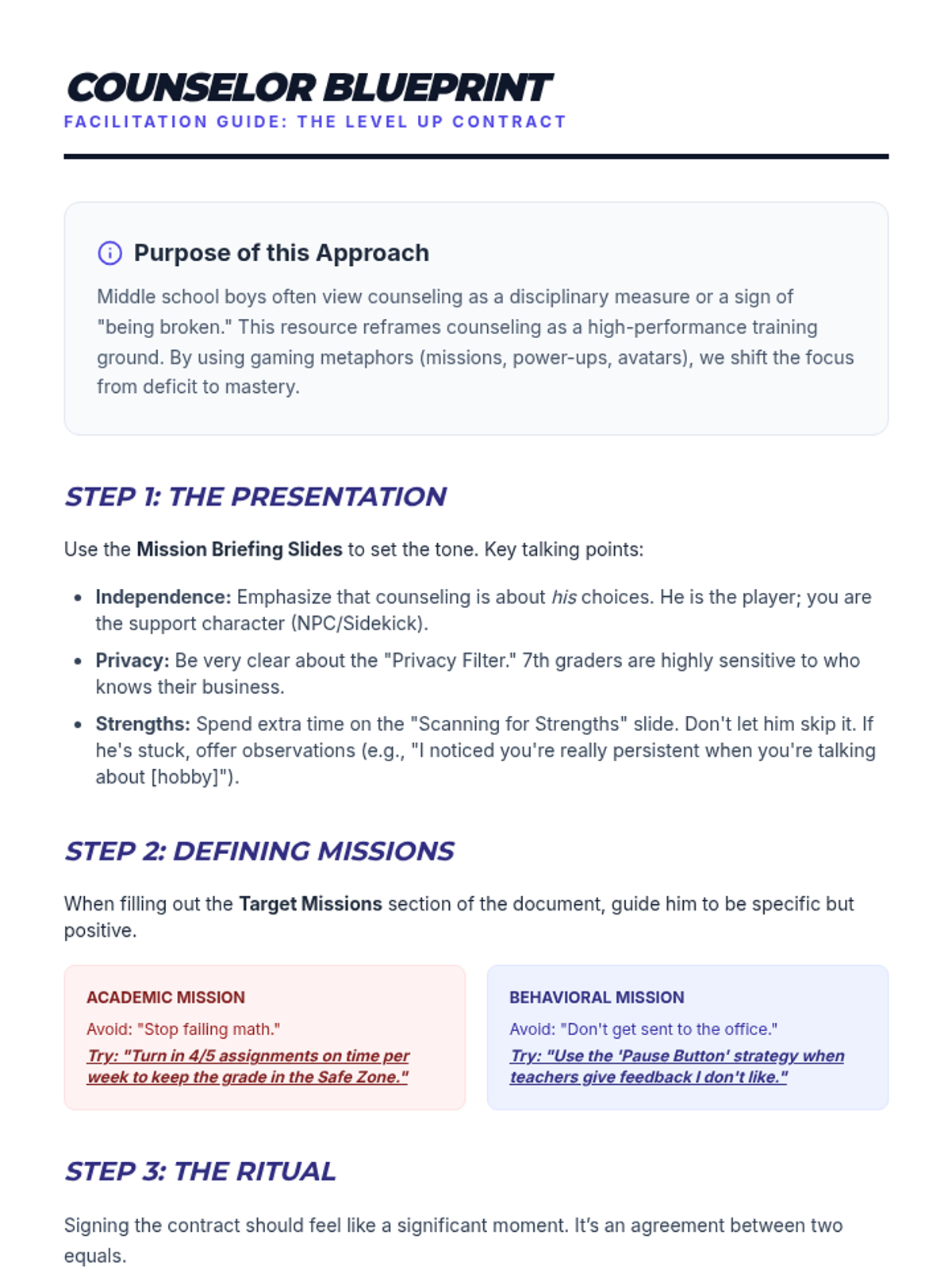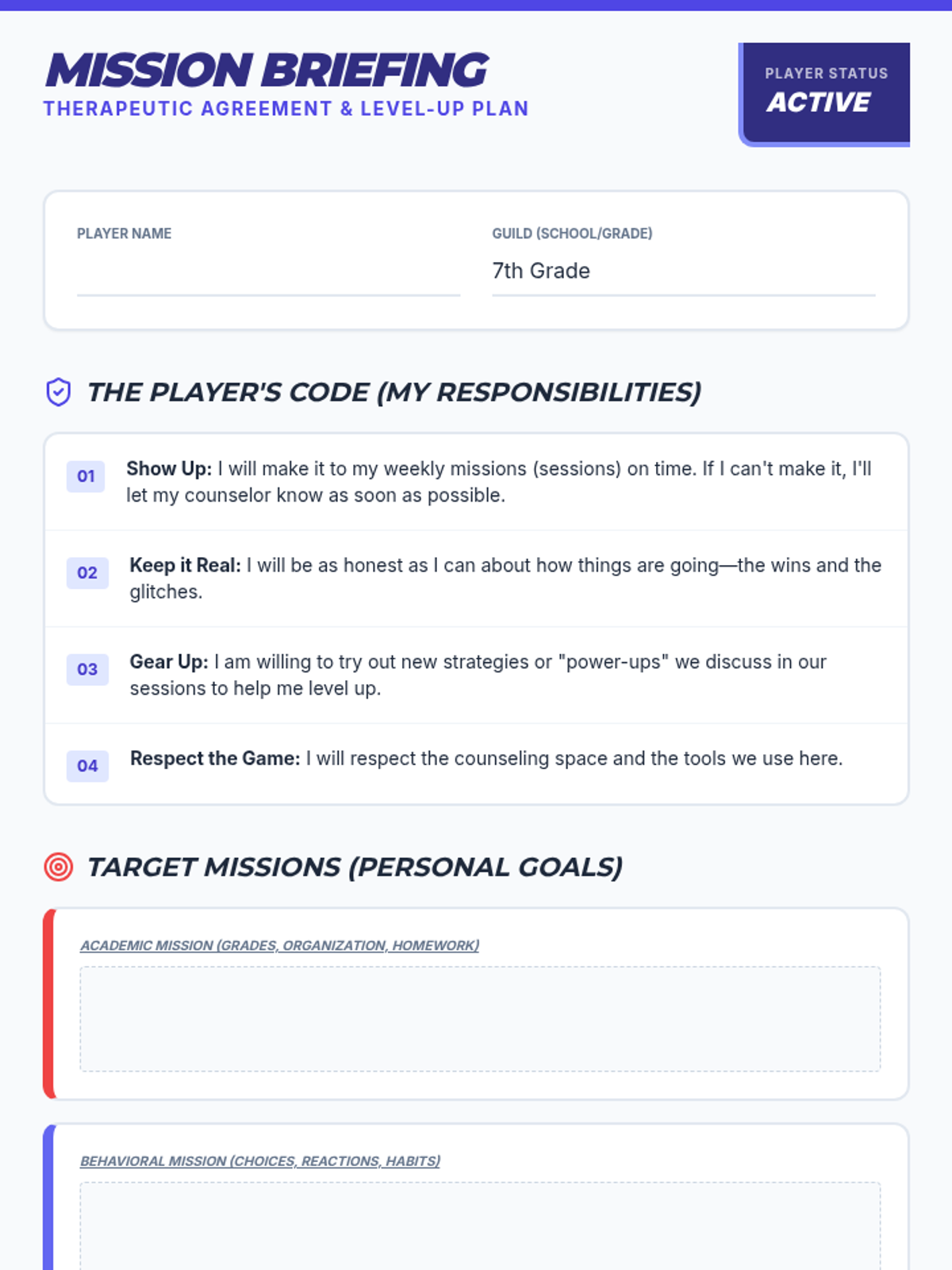 A comprehensive lesson kit for establishing a therapeutic contract with a 7th-grade student, using a strength-based 'gaming' metaphor to frame goals as missions and responsibilities as a personal 'code'.