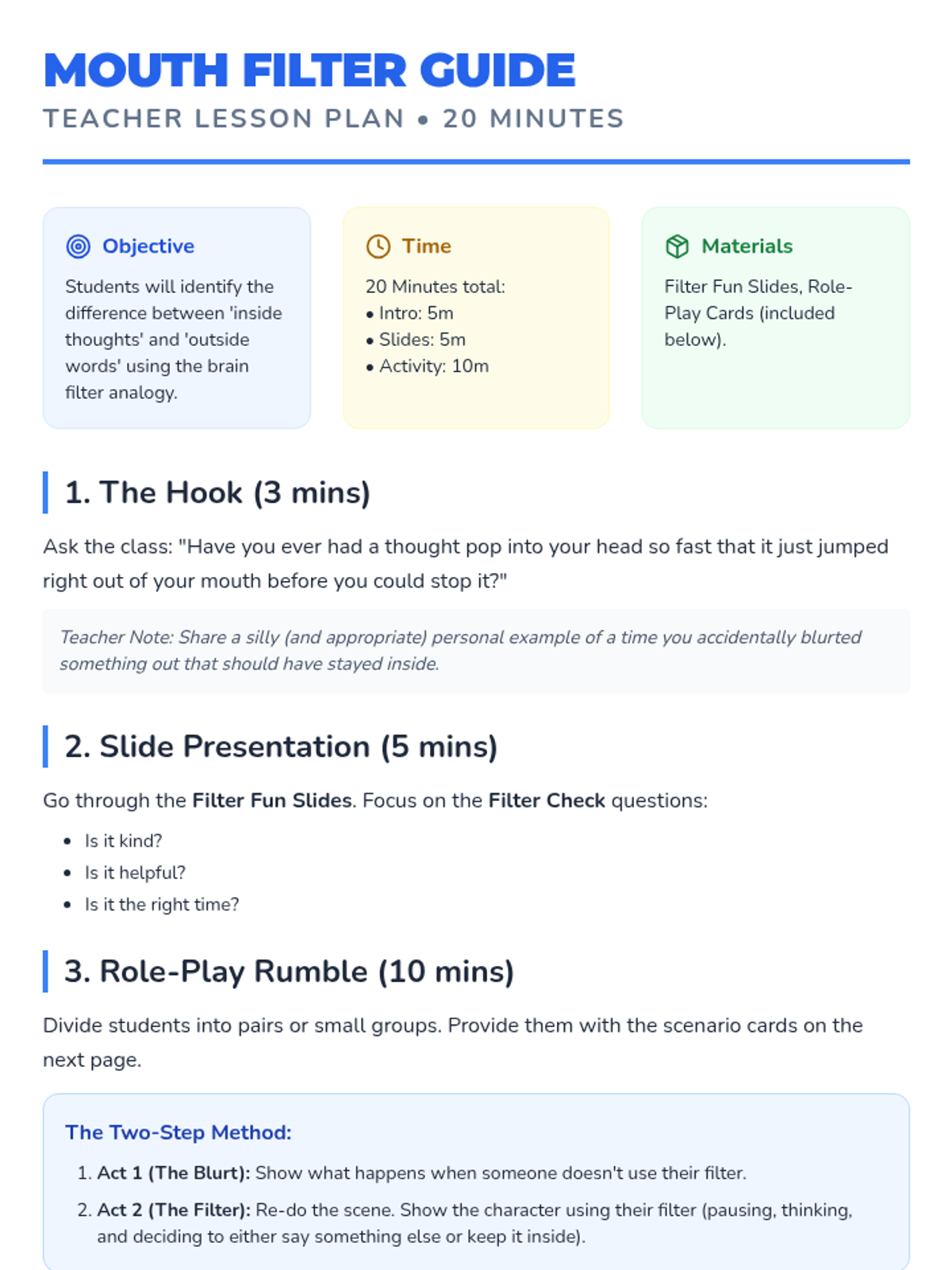 A 20-minute social-emotional learning lesson that teaches students the difference between 'brain thoughts' and 'spoken words' using the brain filter analogy. Includes interactive role-playing to practice impulse control in the classroom.